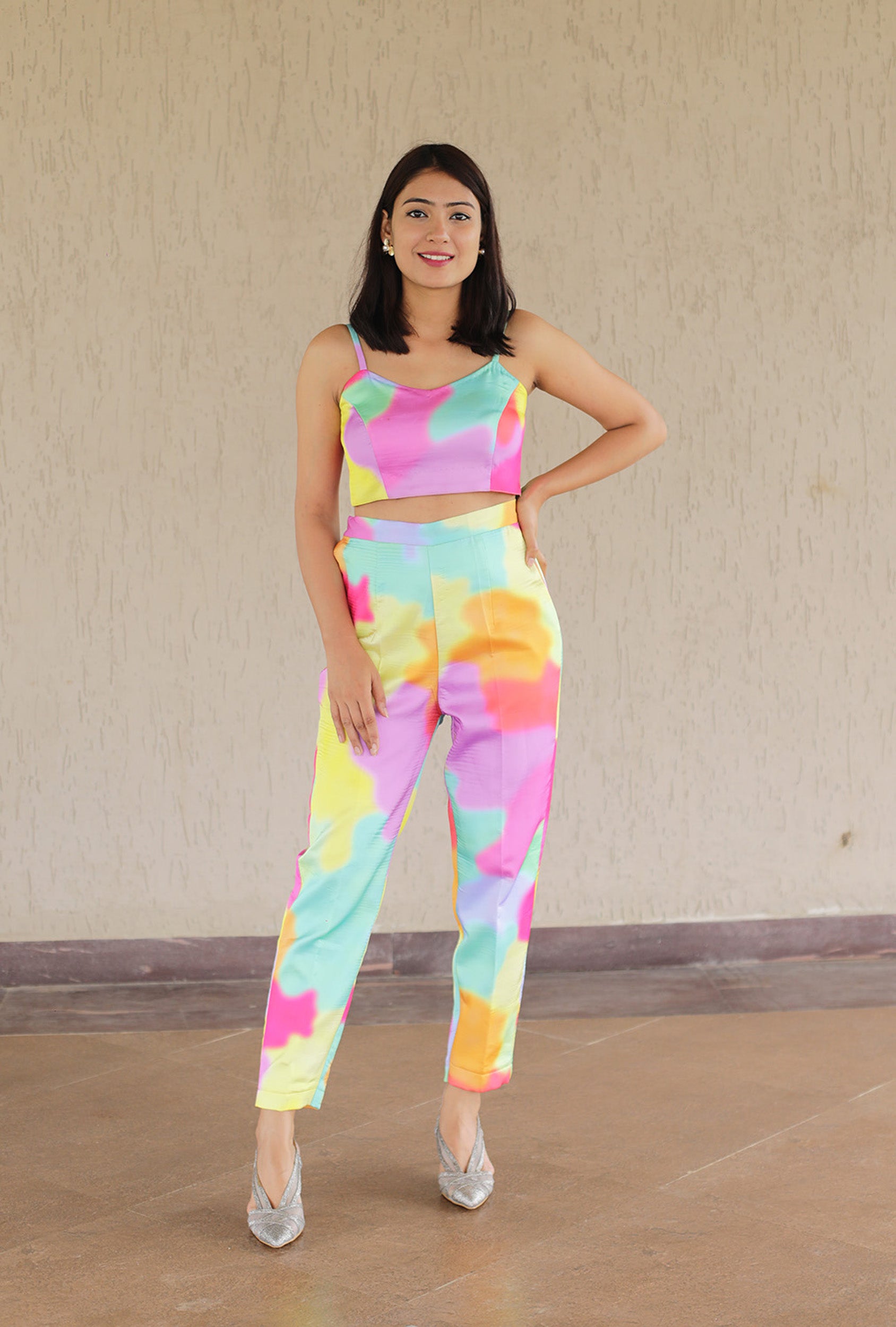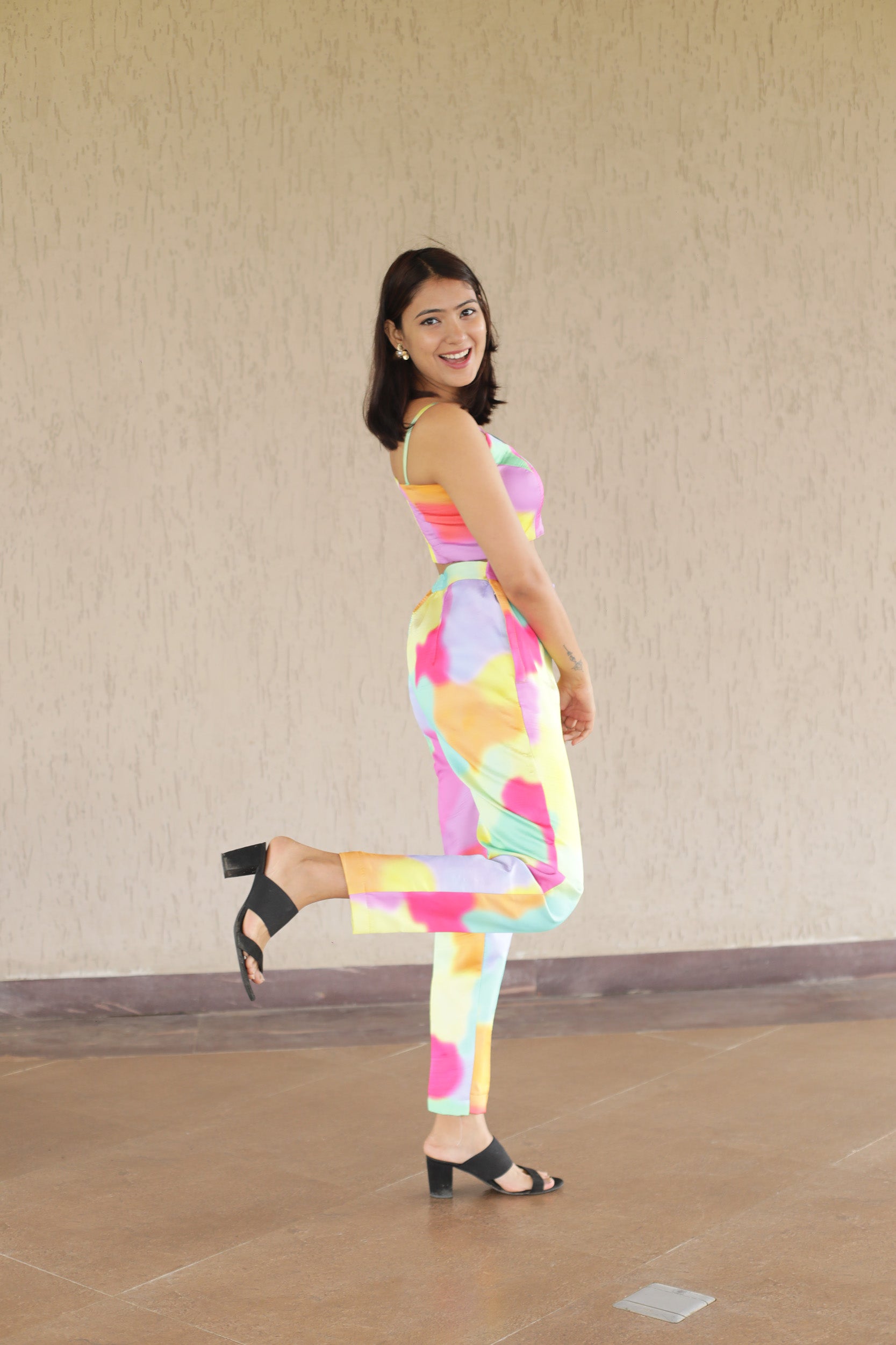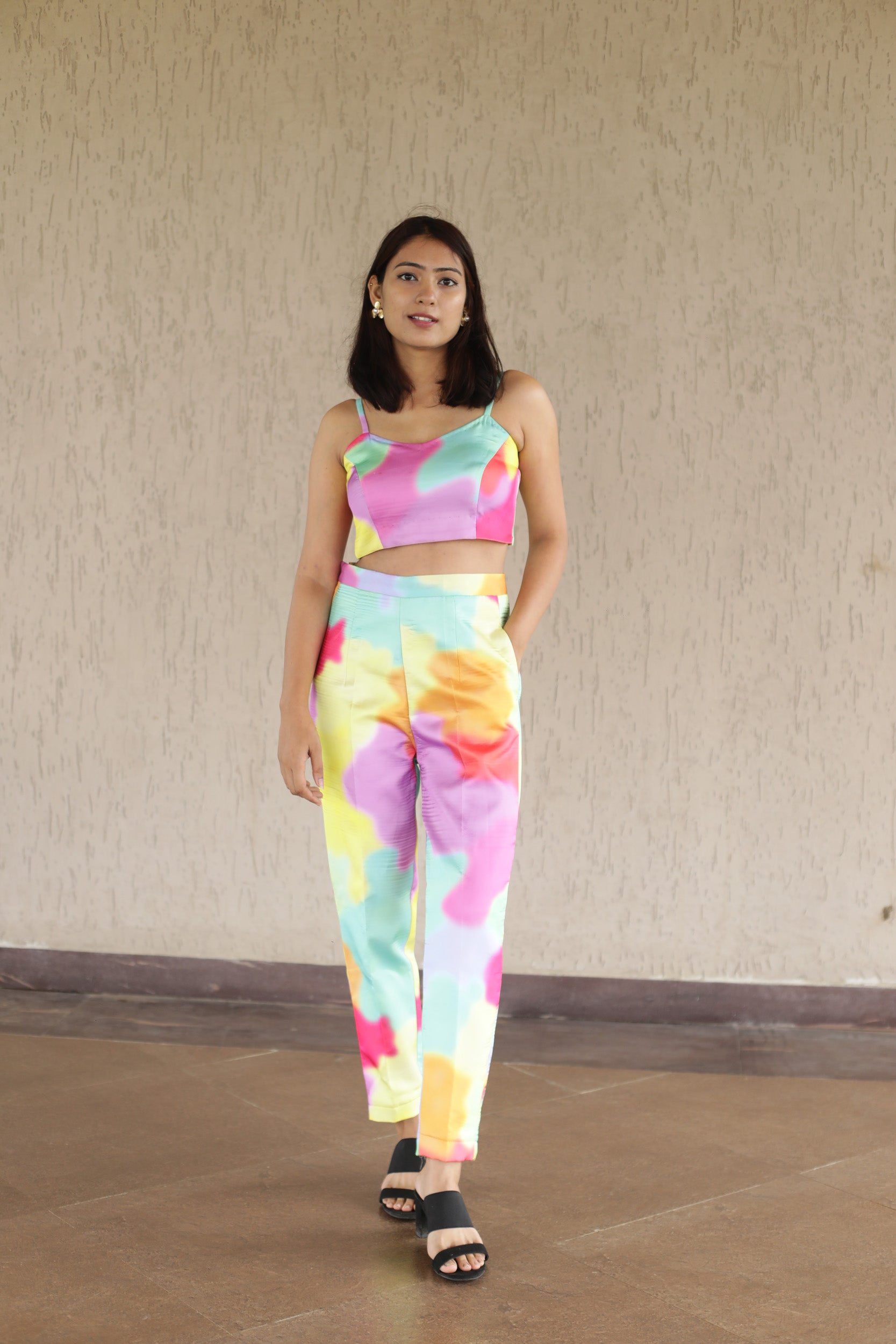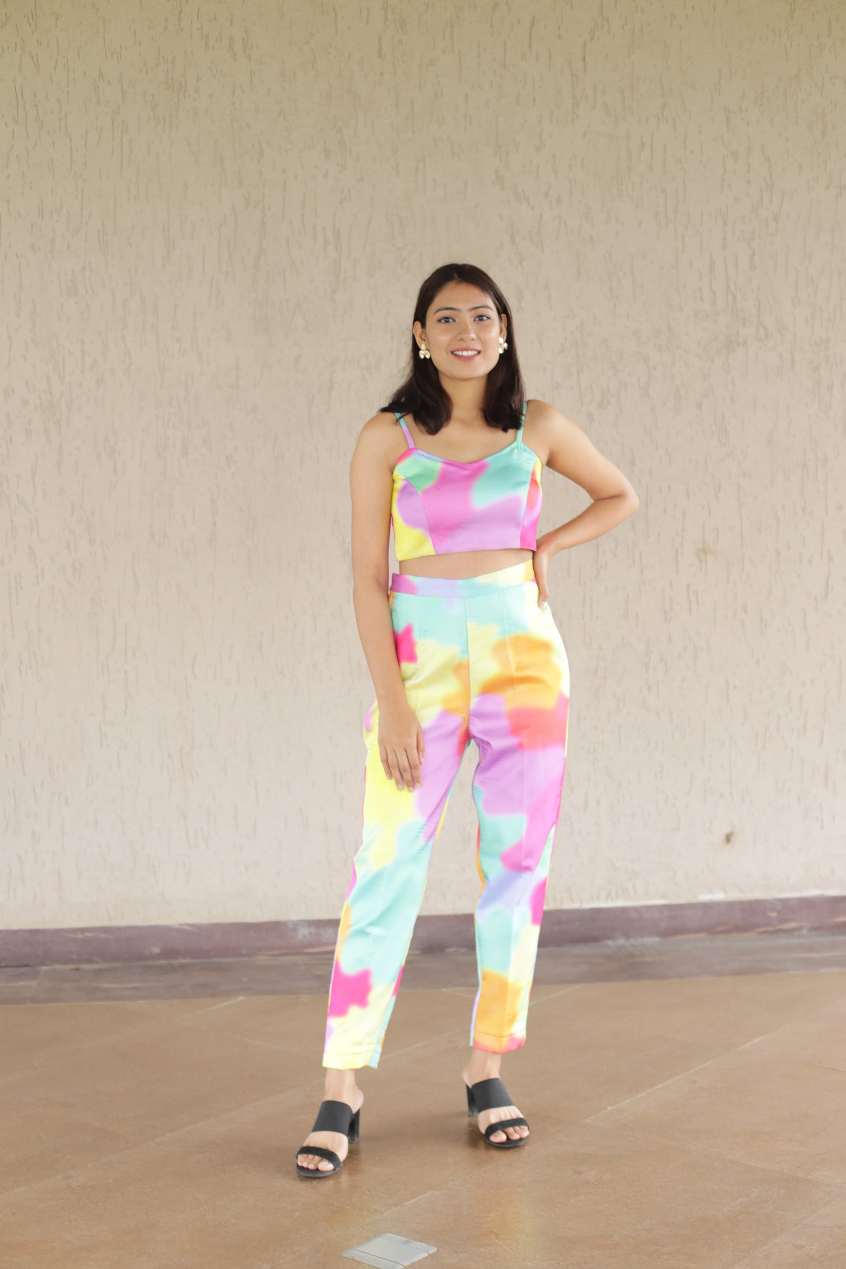This vibrant multicolor co-ord set features a stylish crop top paired with high-waist pants designed for comfort and practicality, including convenient pockets. The ensemble is completed with a sheer organza multicolor shrug, adding a unique, funky edge to your look. Perfect for those seeking a blend of contemporary style and functional design.