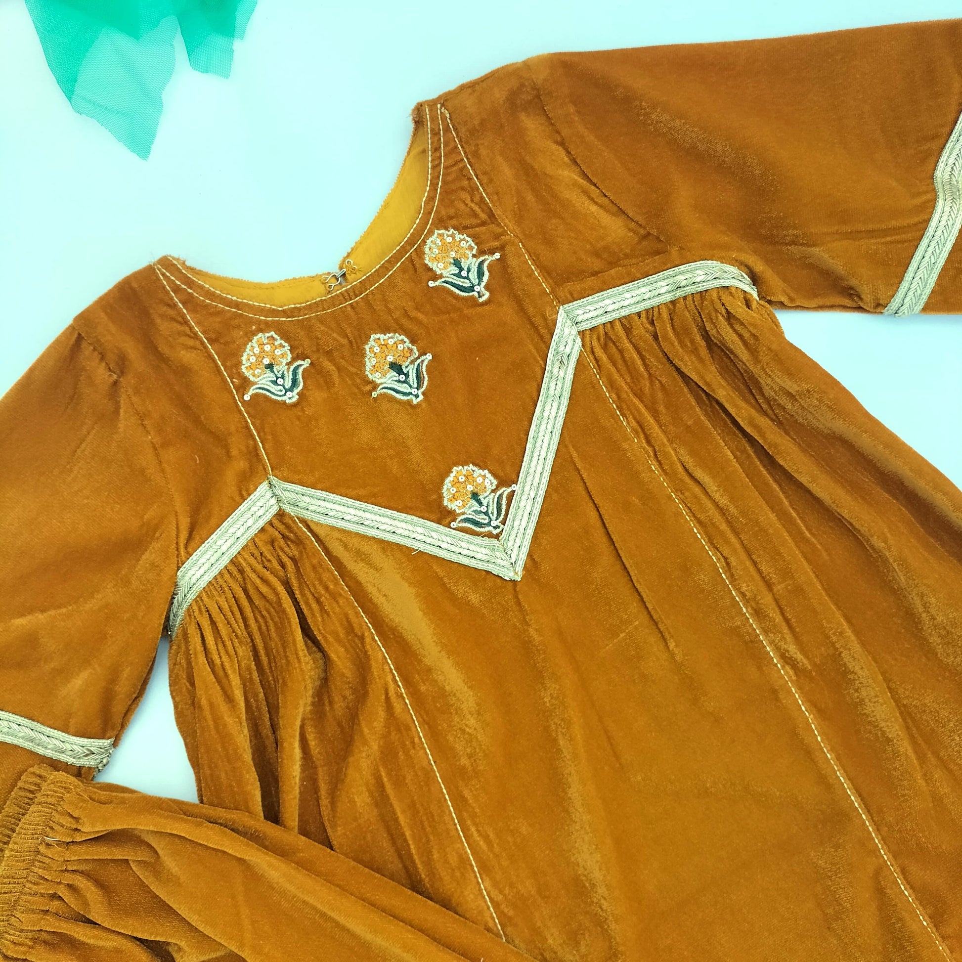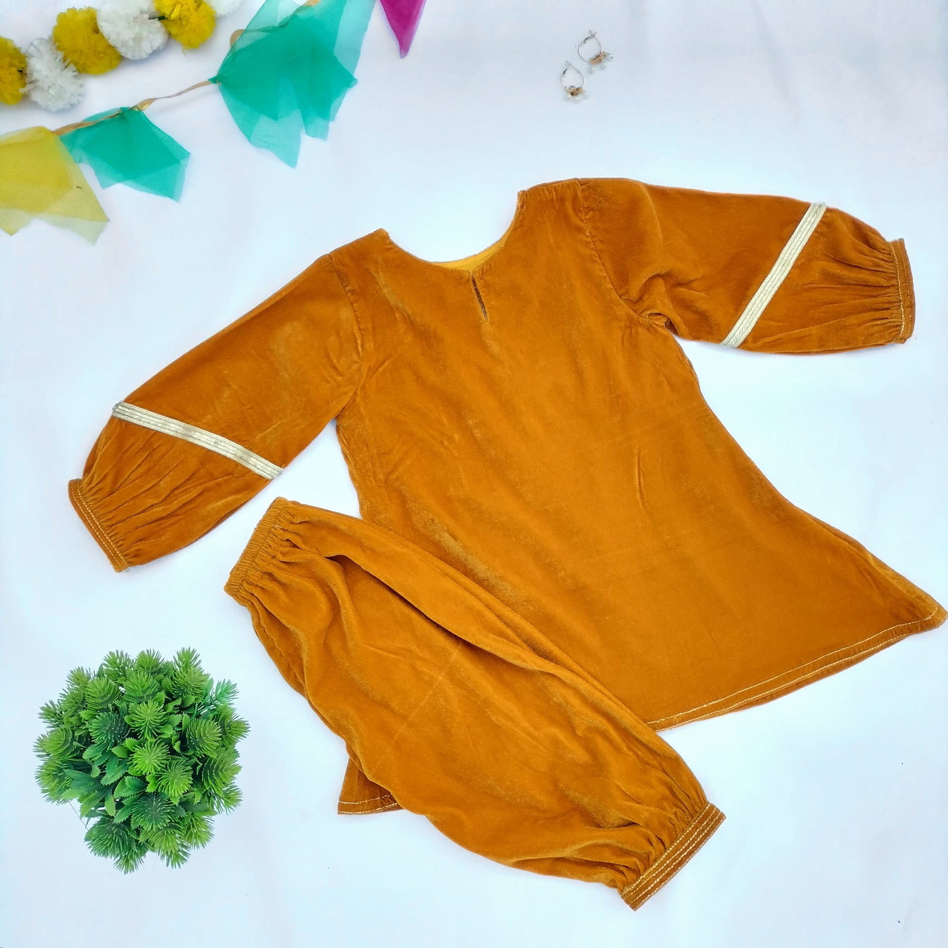 This cute mustard cordset for kids features pretty lace detailing and beautiful flower patches with zari work. The sparkling sequins add a fun touch, making it perfect for special occasions or playtime. Stylish and comfy, it’s sure to make your little one shine!