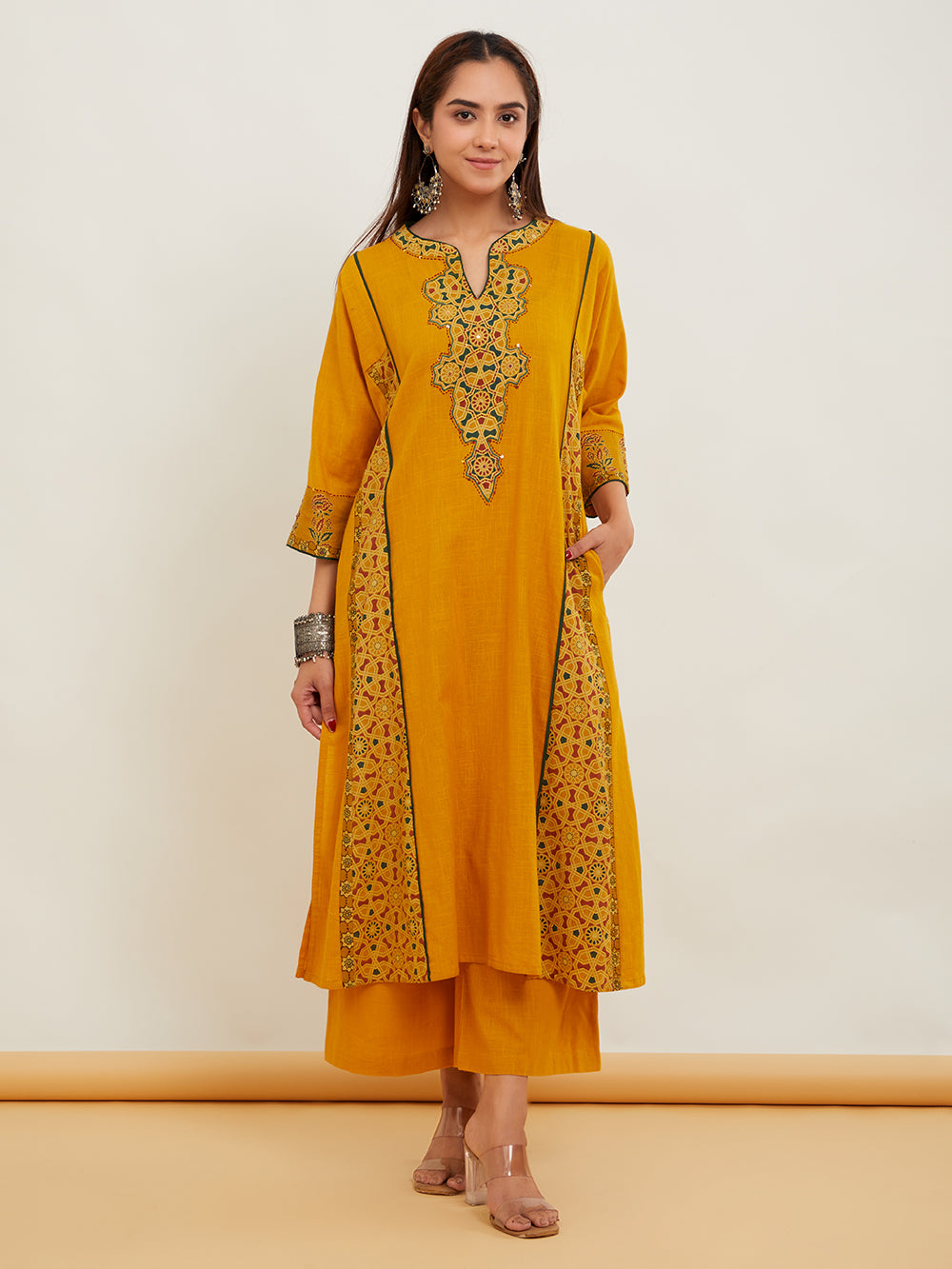 Mustard Yellow Ajrakh Applique Work Cotton kurta pant
