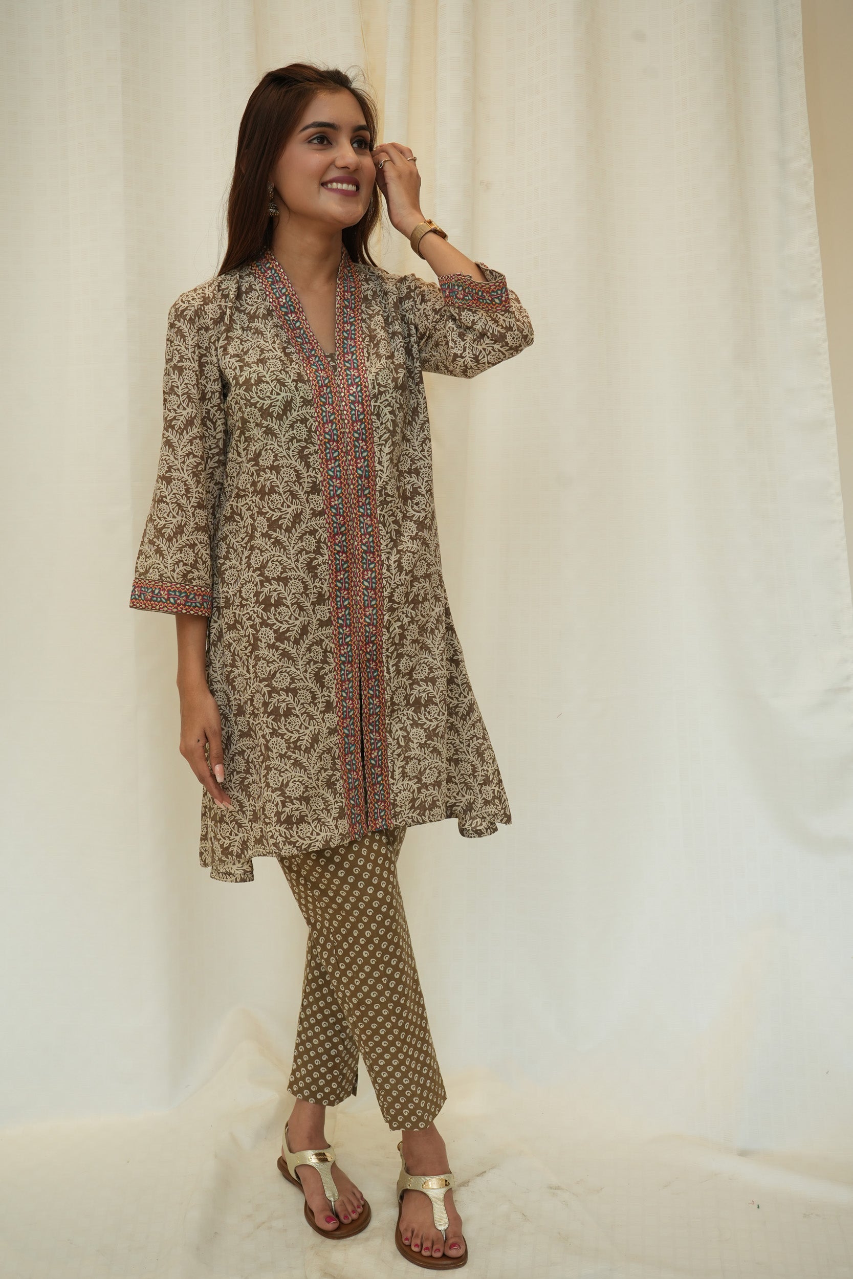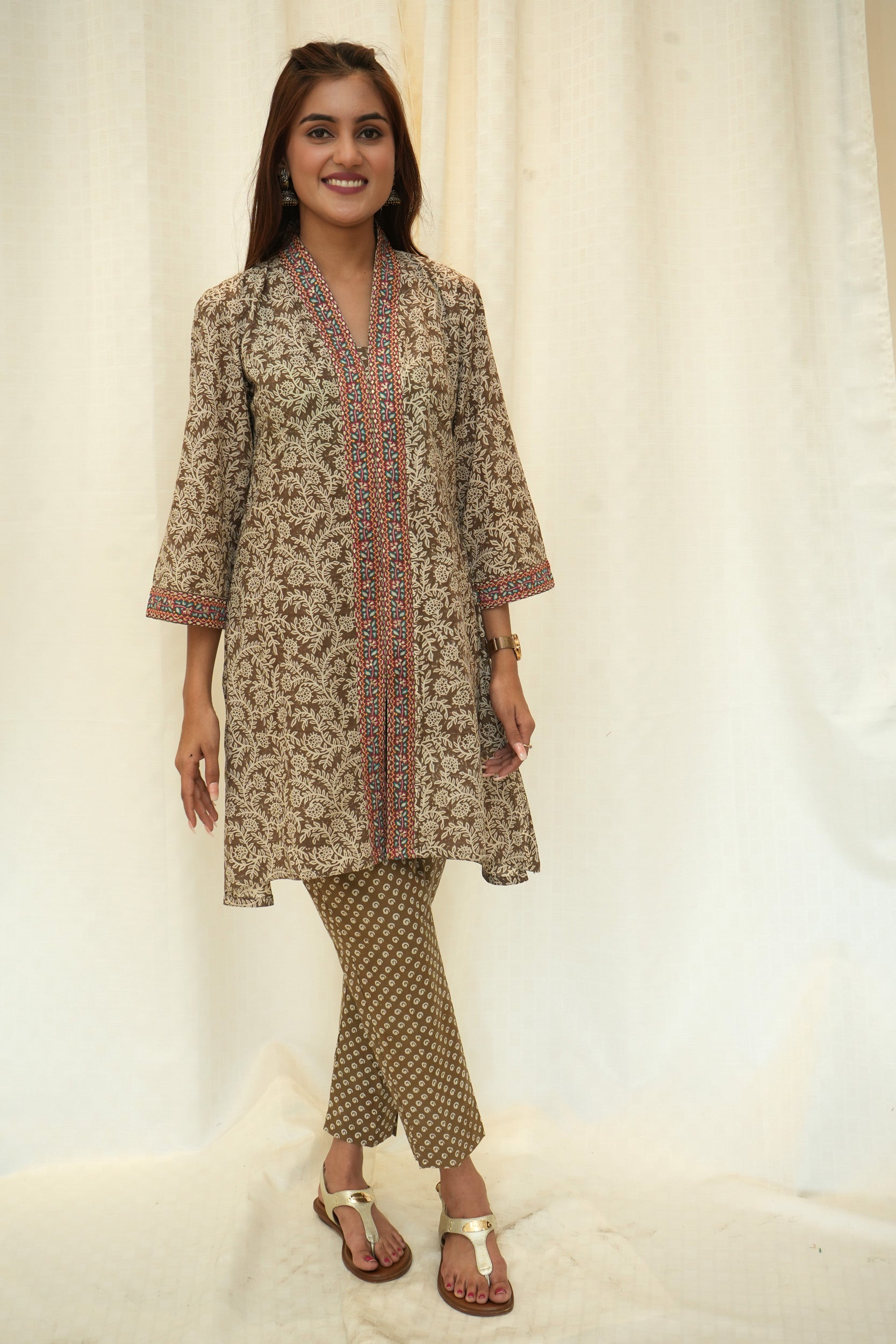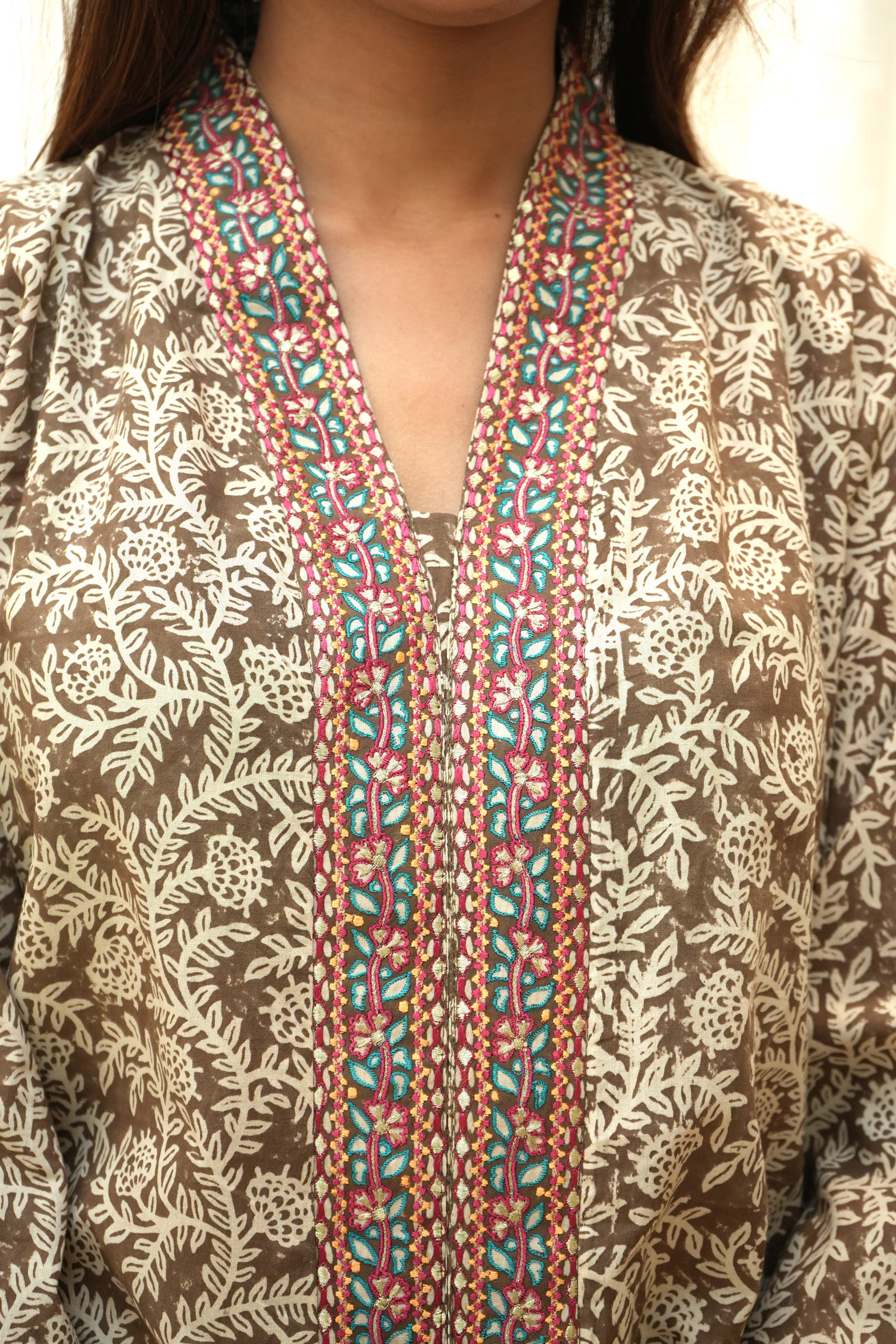 This ochre silk cordset features intricate multicolor lace and delicate silk embroidery on the front, complemented by a sophisticated high neck design. Paired with ochre swirl print pants, it offers a harmonious blend of traditional craftsmanship and contemporary style, perfect for making a refined statement at any occasion.