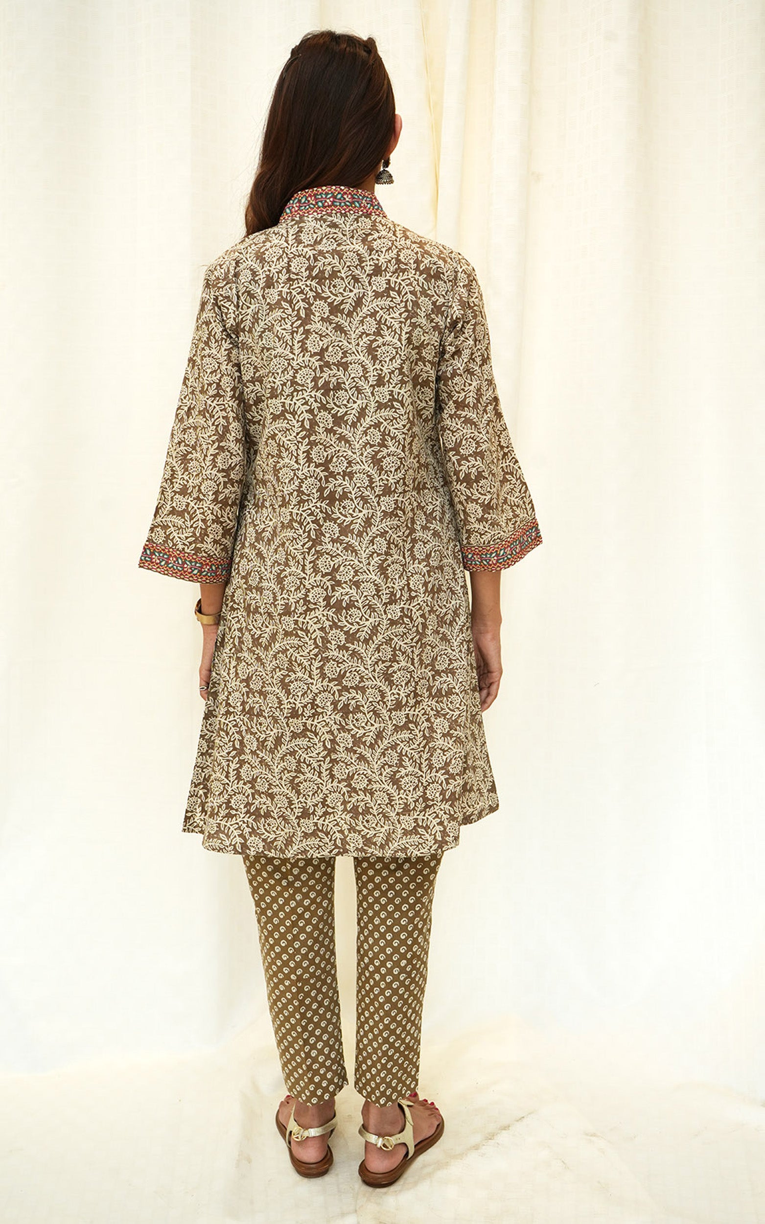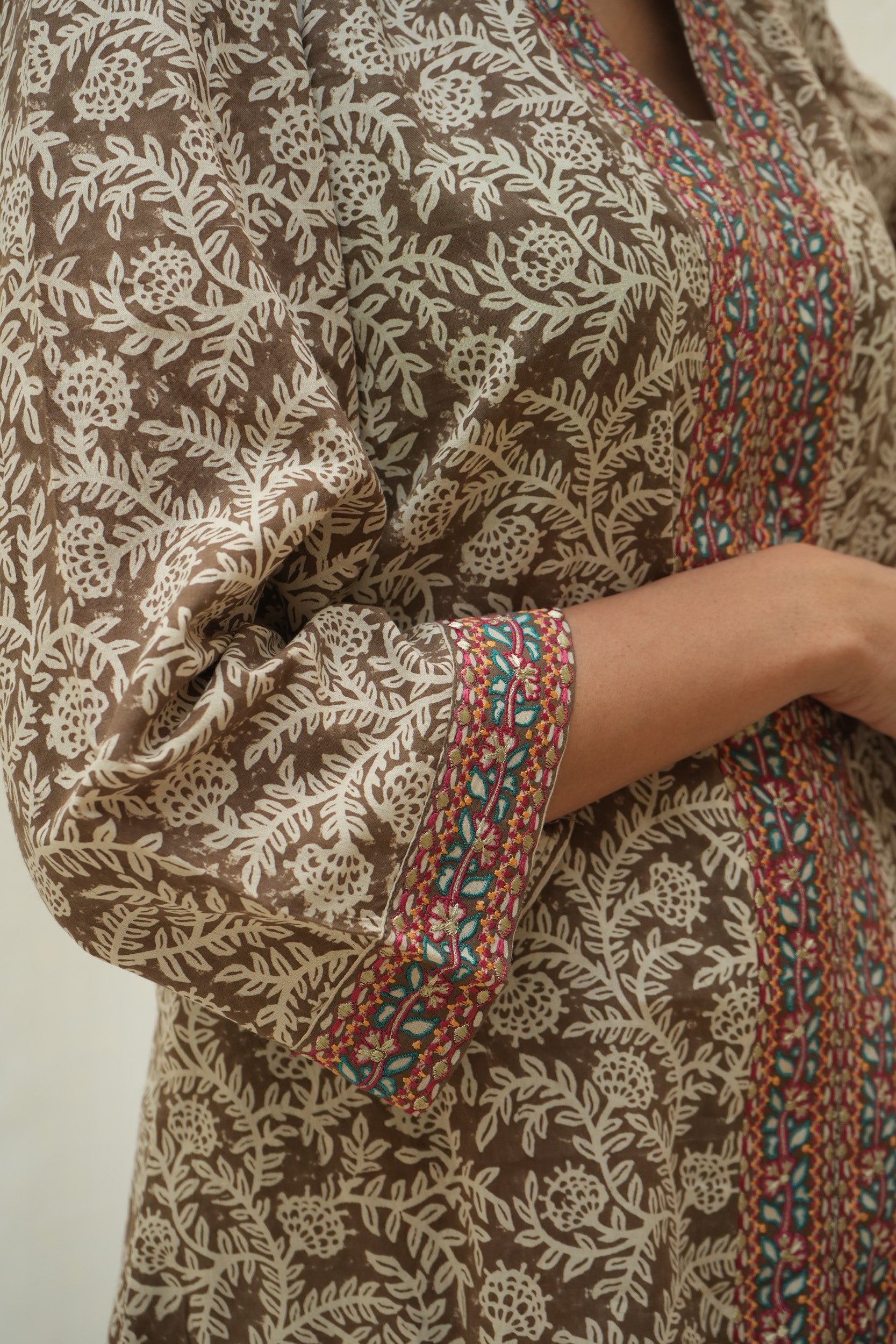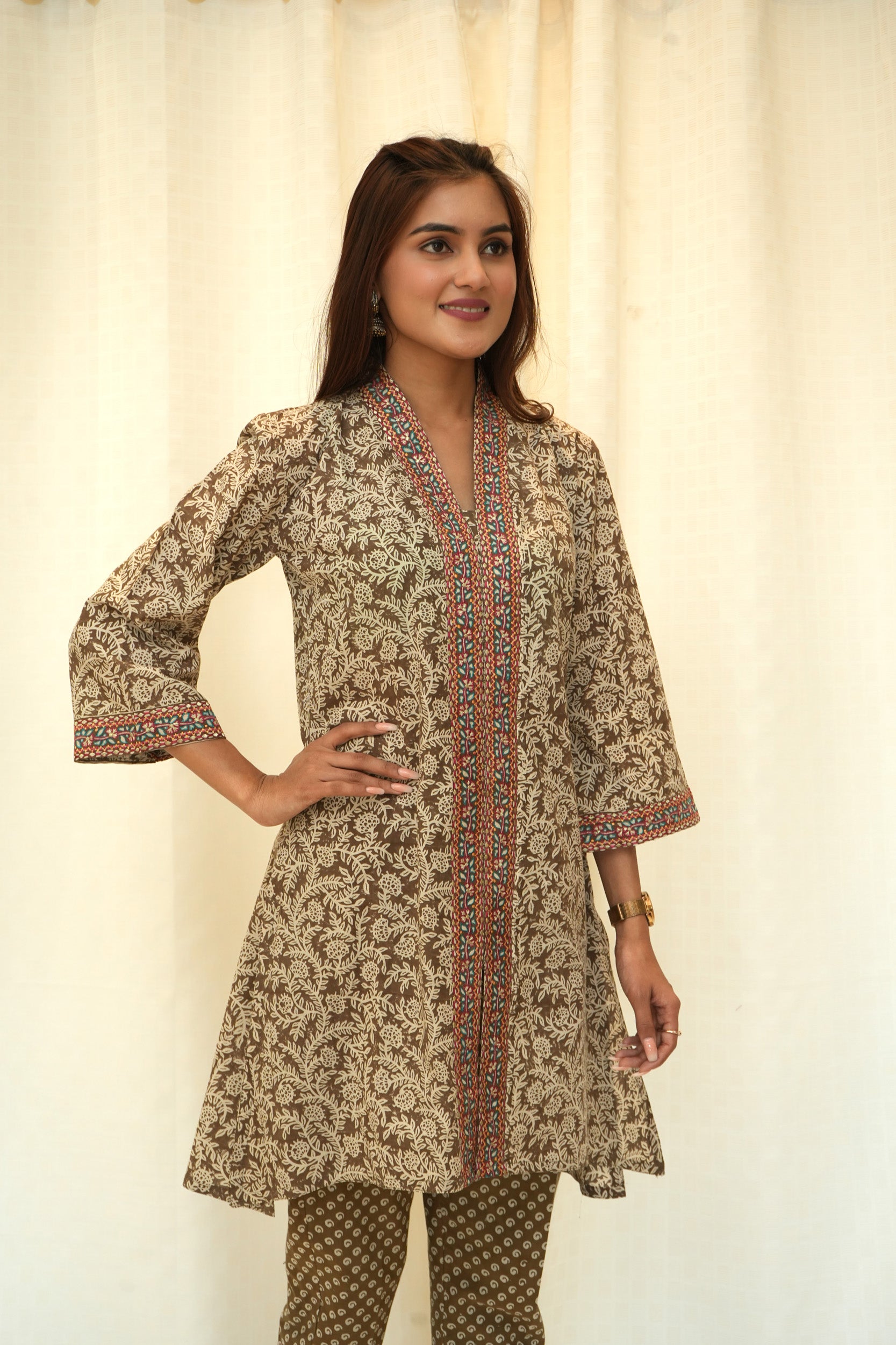 This ochre silk cordset features intricate multicolor lace and delicate silk embroidery on the front, complemented by a sophisticated high neck design. Paired with ochre swirl print pants, it offers a harmonious blend of traditional craftsmanship and contemporary style, perfect for making a refined statement at any occasion.