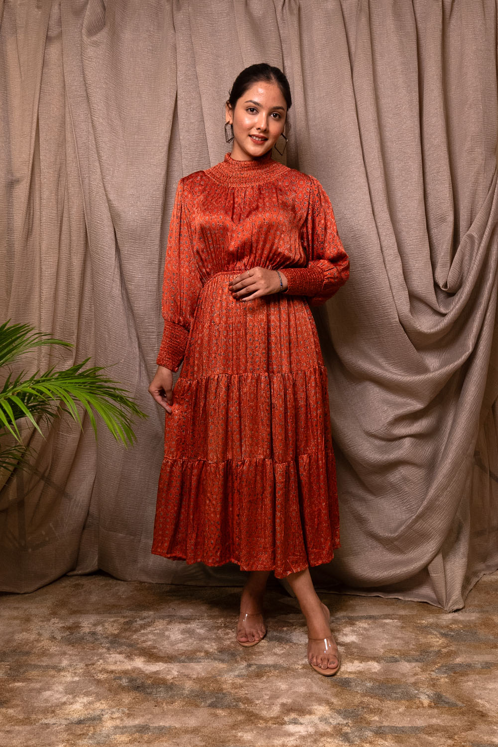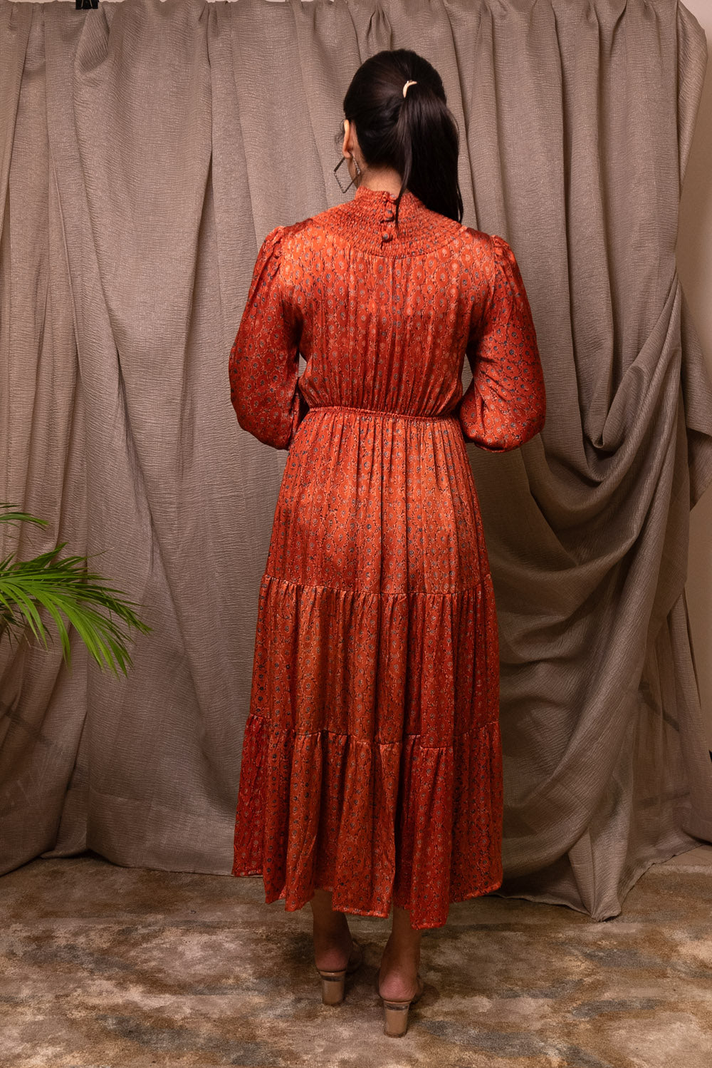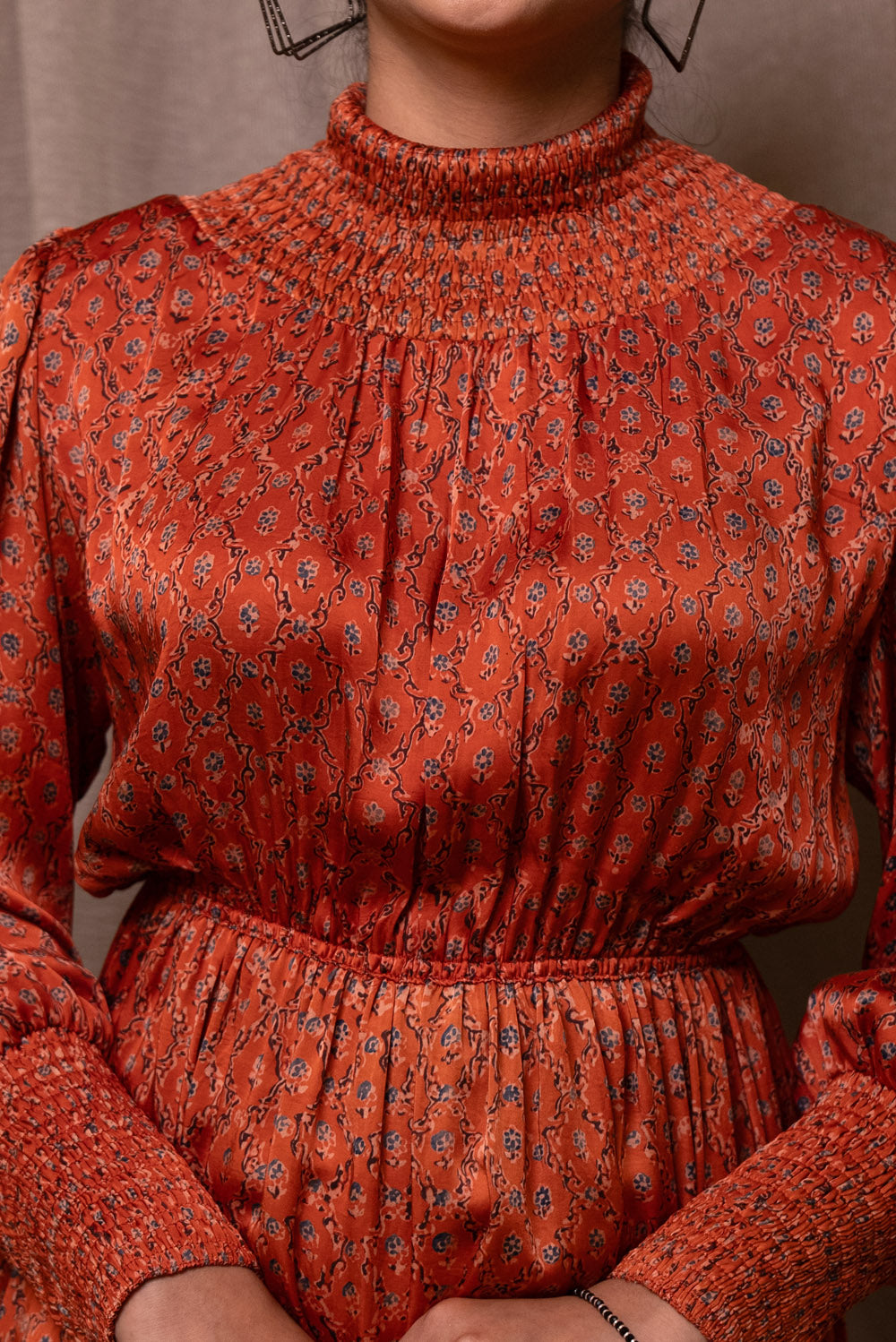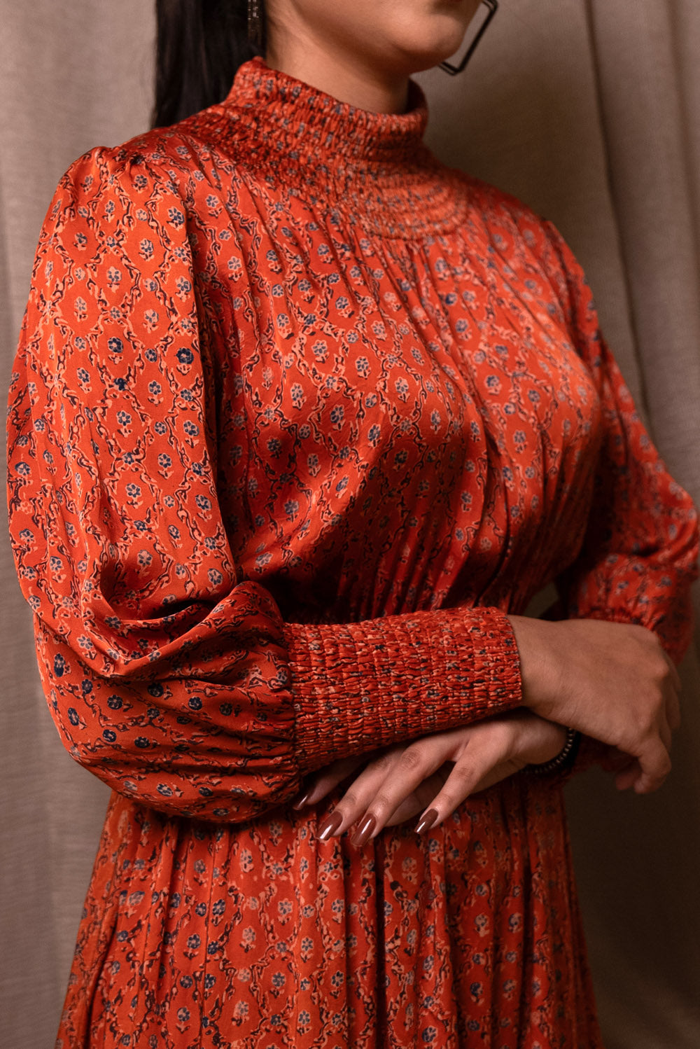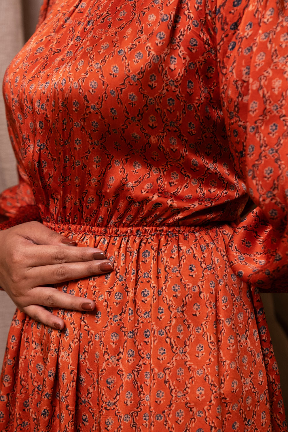Crafted in pure modal silk the dress is block printed in ajrakh print. The neck and sleeves has smocking. It has elasticated waist.