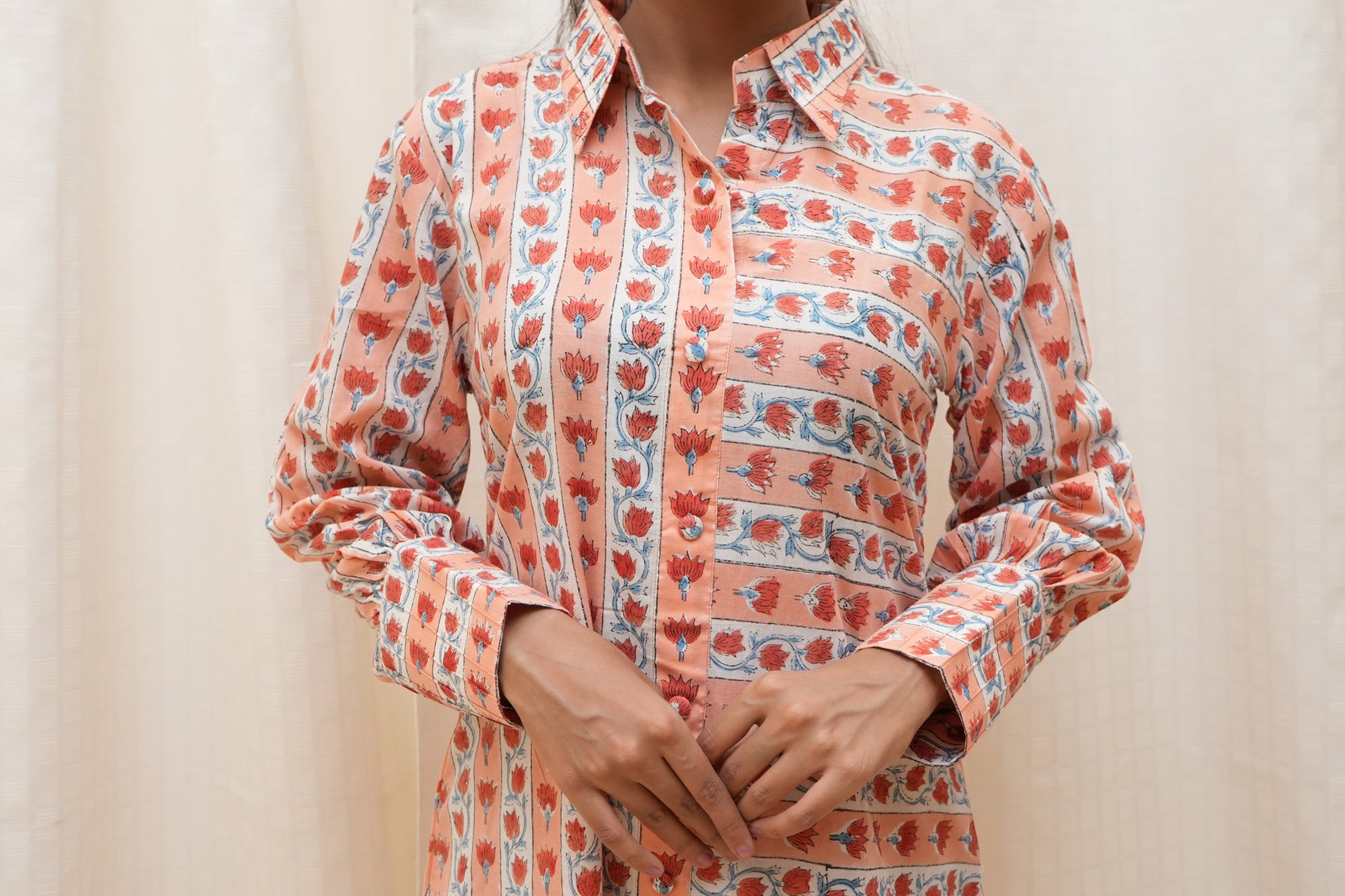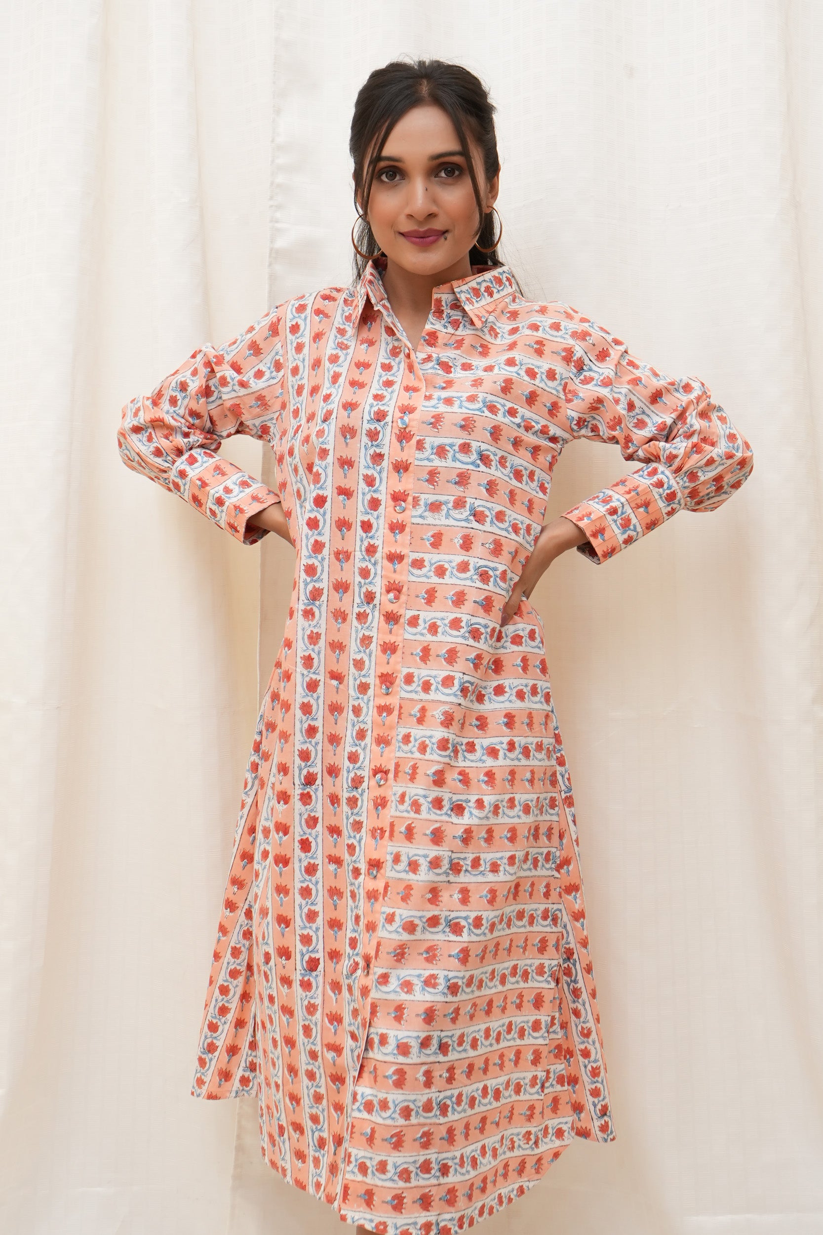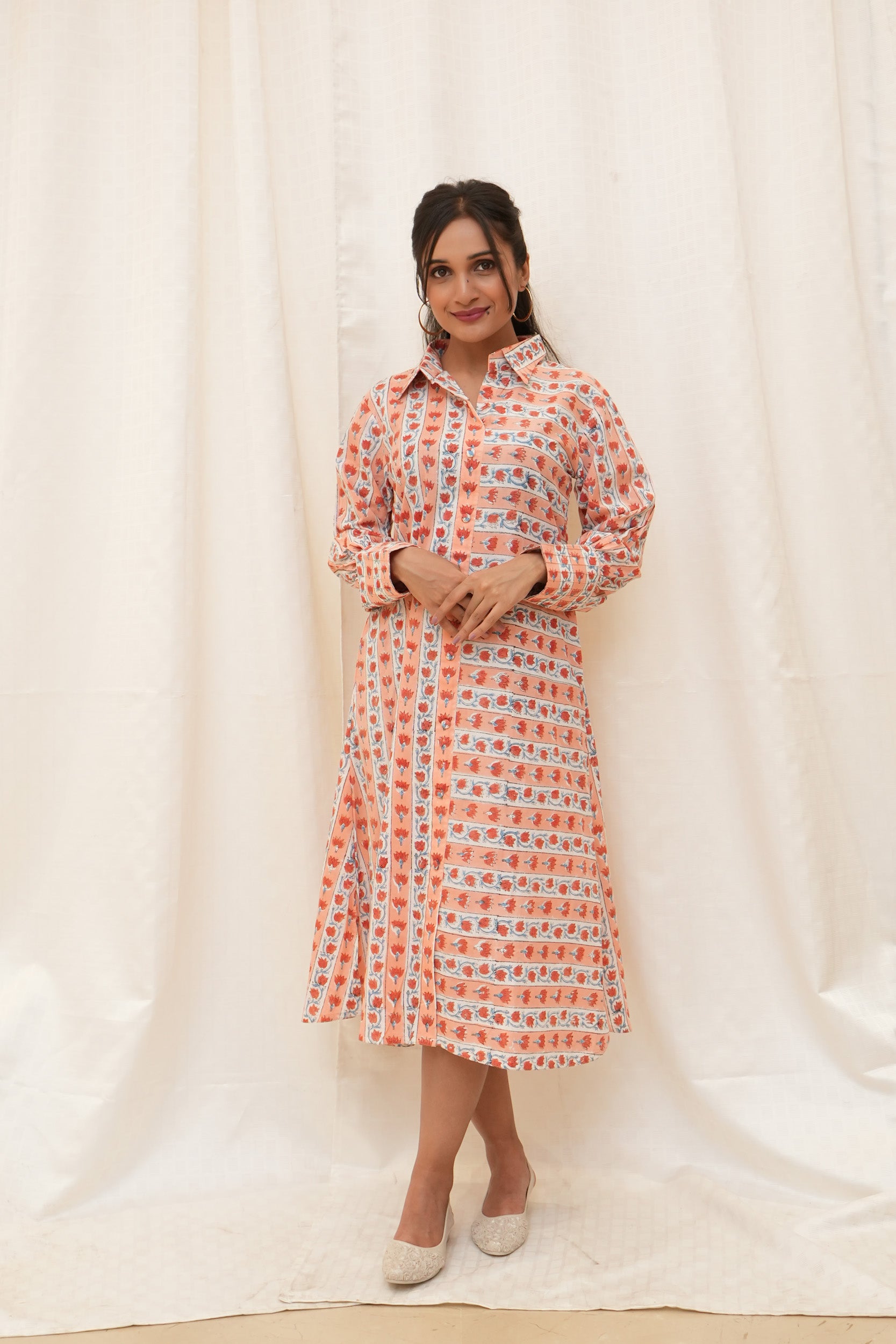 This expert-crafted dress features warm orange stripes accented with dark orange floral motifs and subtle blue touches, creating a harmonious and vibrant pattern. The design cleverly shifts stripe directions to enhance visual interest. Tailored with a classic collar and cuffs, this shirt dress combines structured elegance with a lively print, perfect for making a refined yet bold statement.