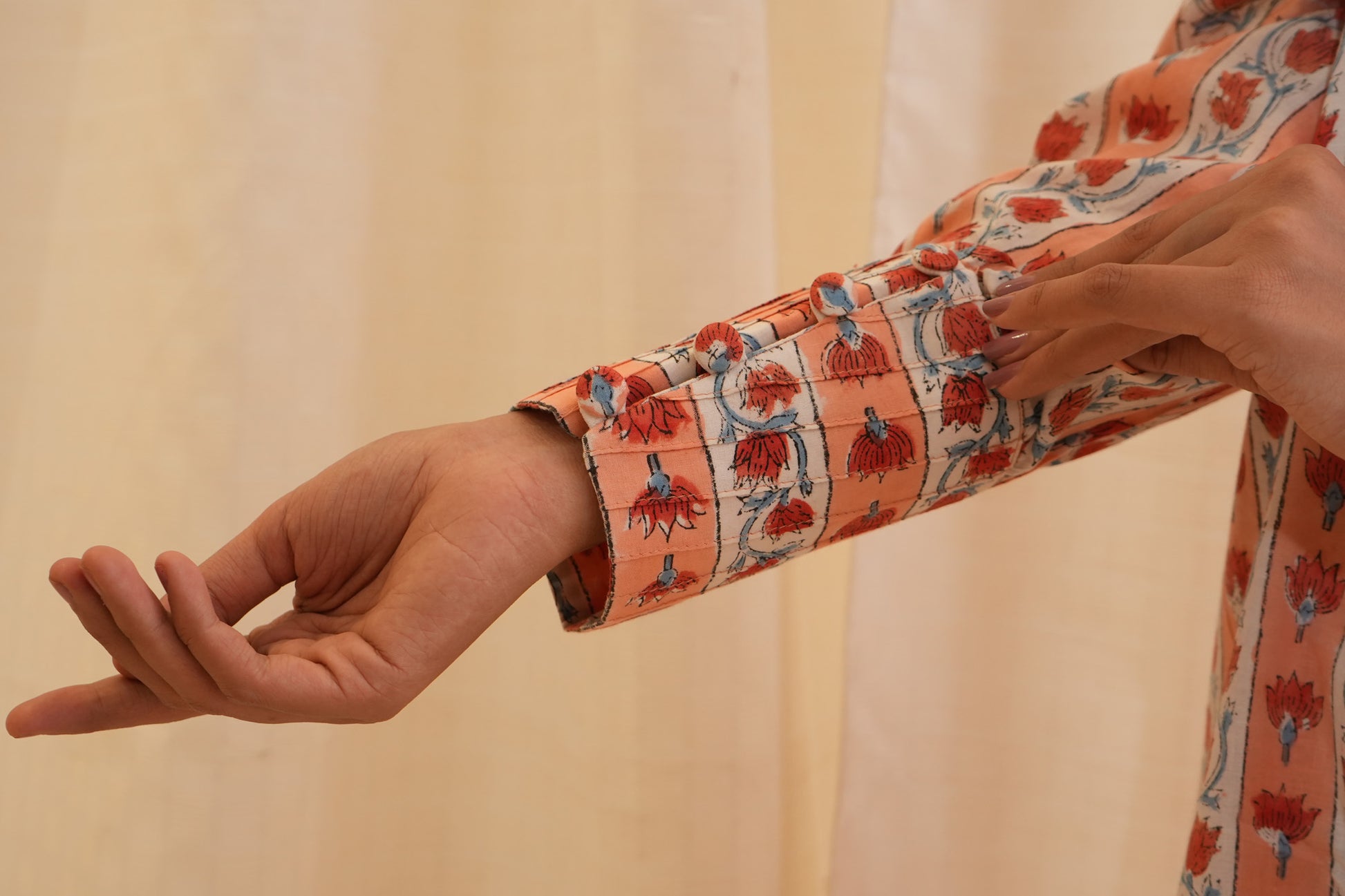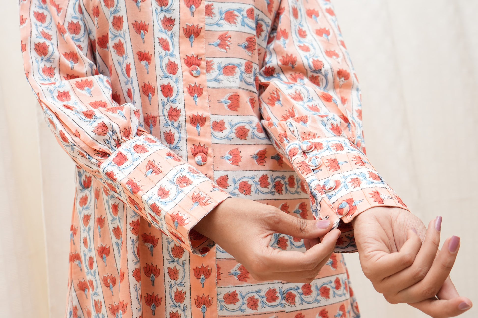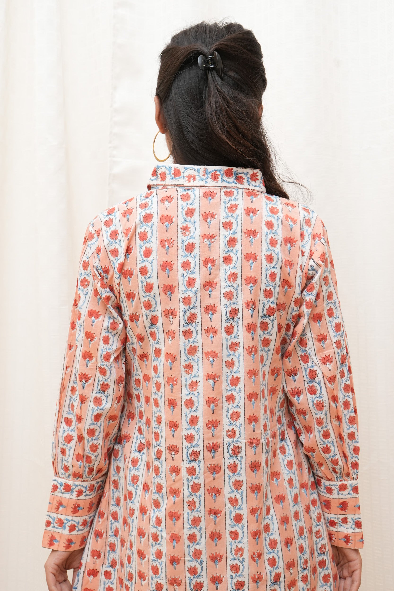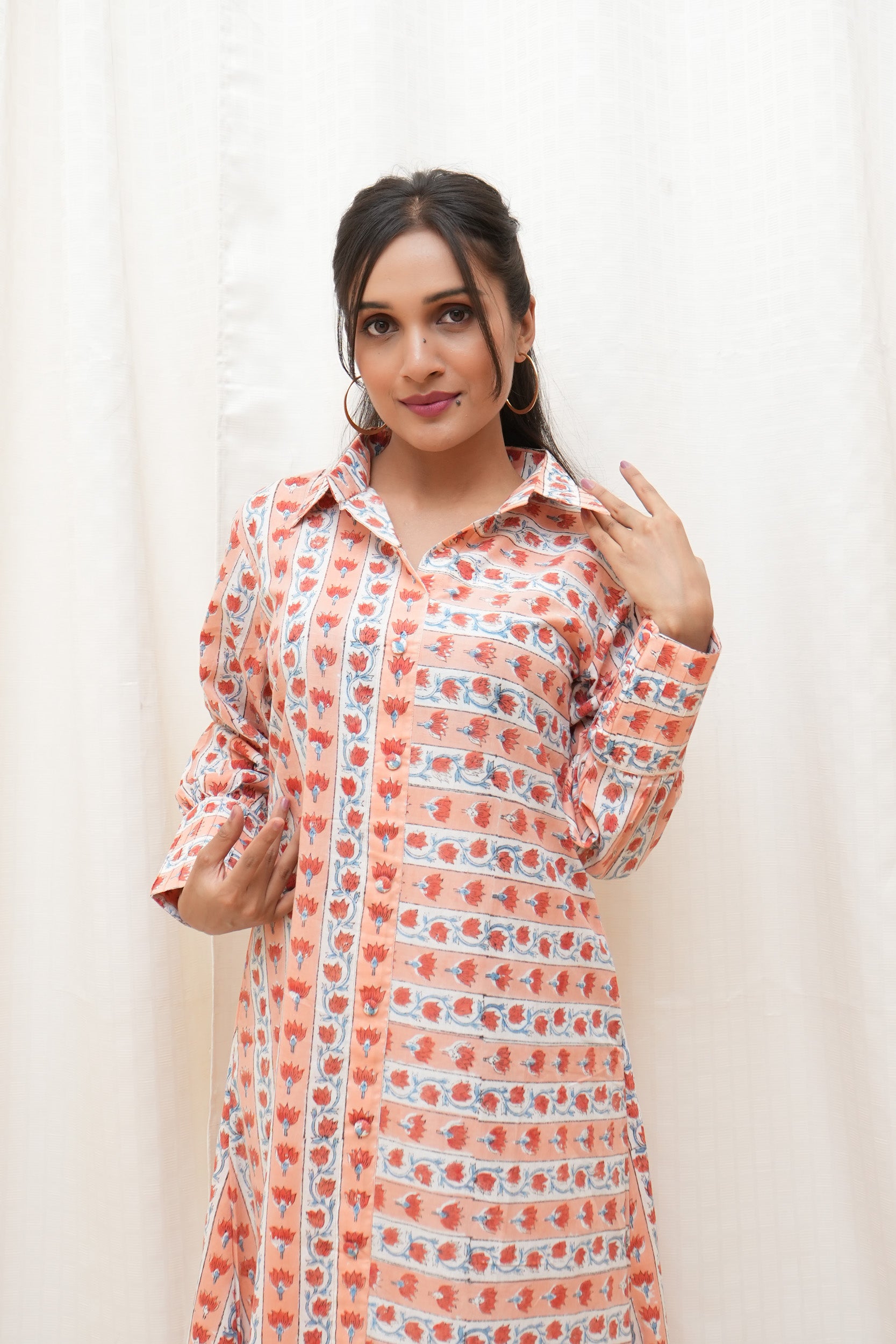 This expert-crafted dress features warm orange stripes accented with dark orange floral motifs and subtle blue touches, creating a harmonious and vibrant pattern. The design cleverly shifts stripe directions to enhance visual interest. Tailored with a classic collar and cuffs, this shirt dress combines structured elegance with a lively print, perfect for making a refined yet bold statement.