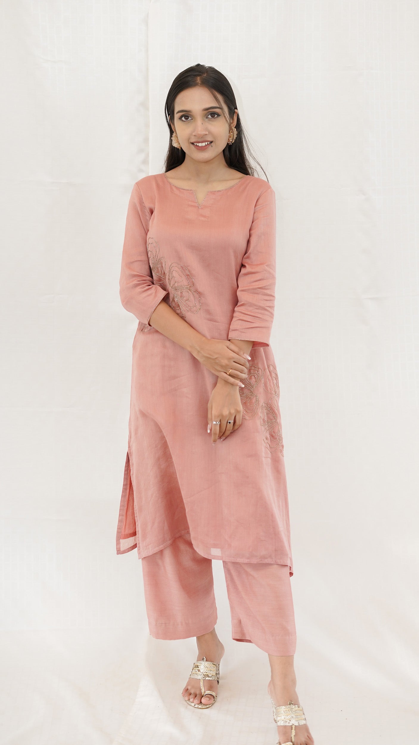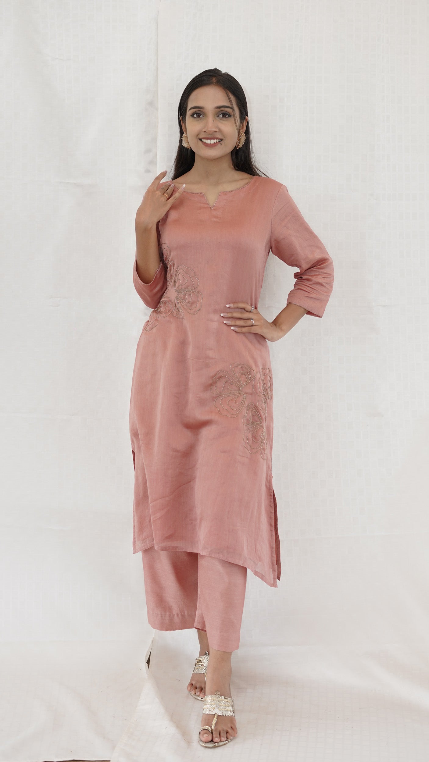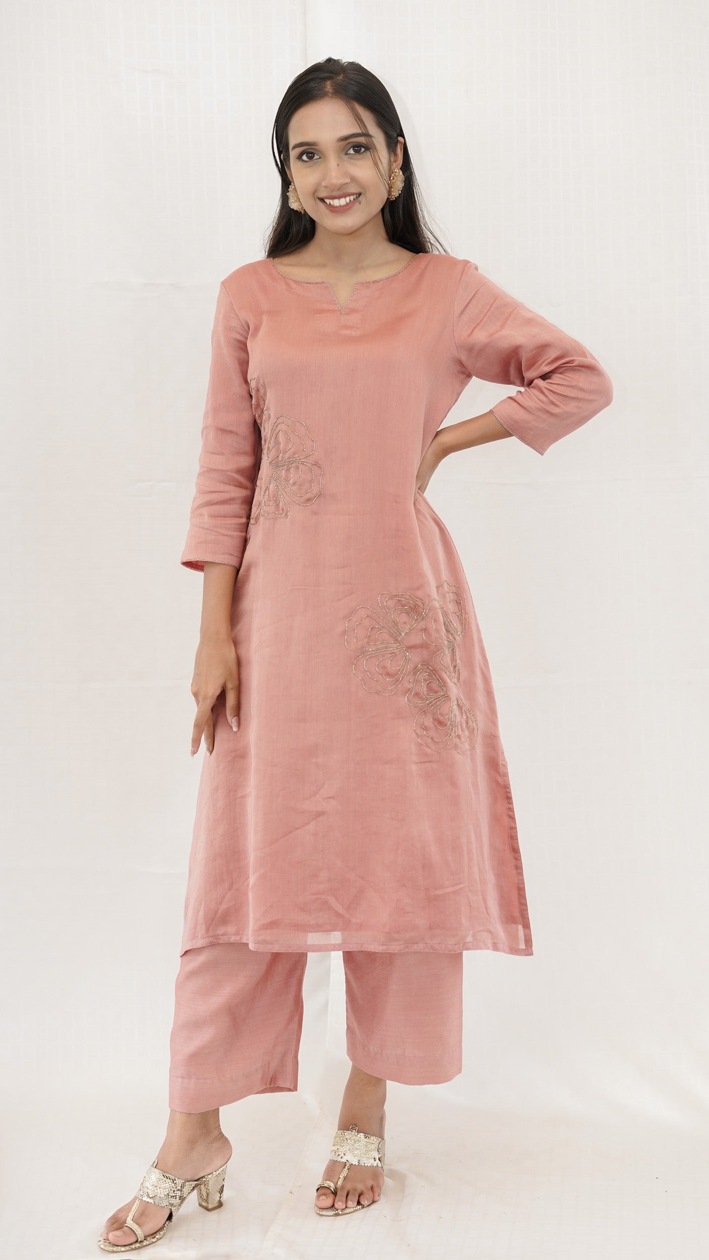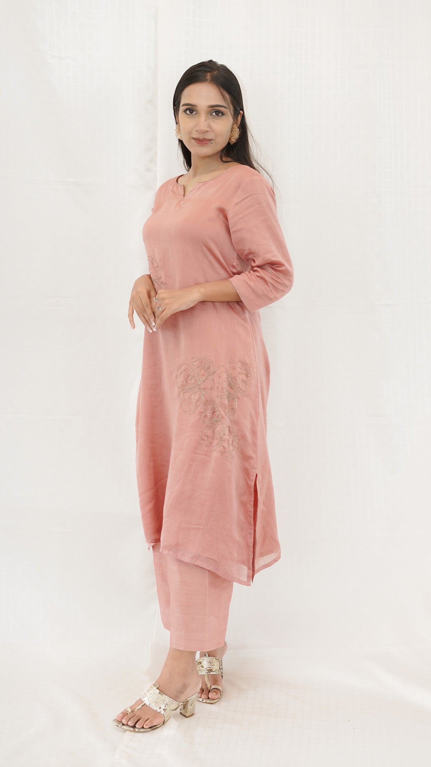 Pastel PEACH Chanderi hand embroidered Kurta pant