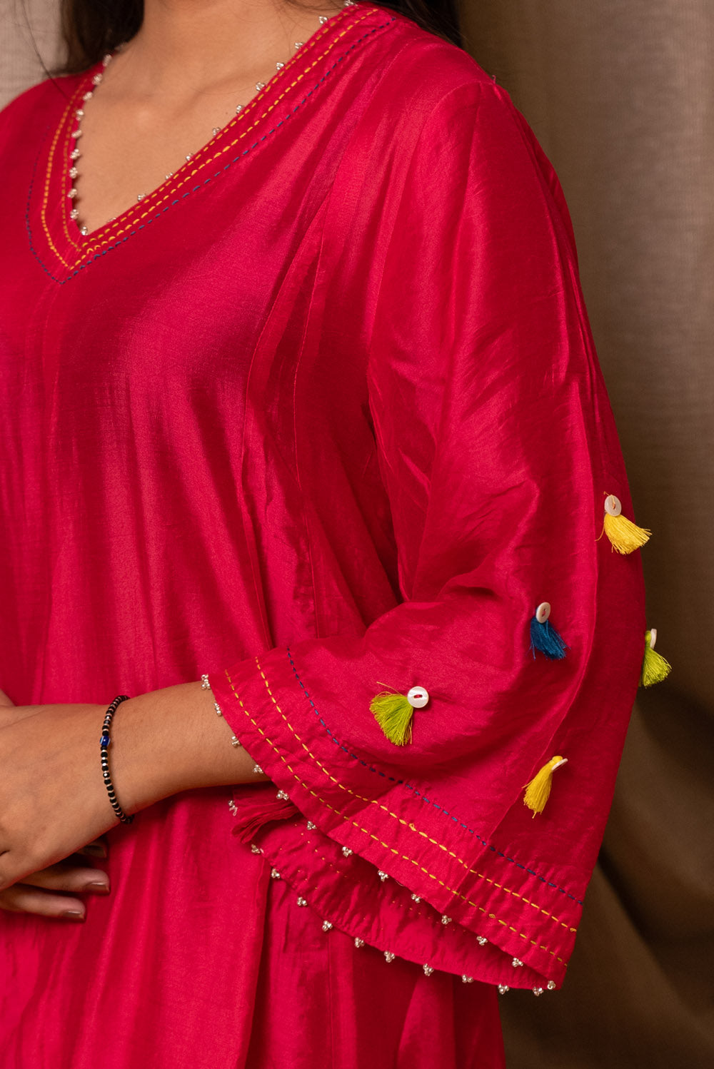 Handcrafted in chanderi silk,the cape front is embroidered with colorful threads and has tassels. It comes with a elasticated pant which give you comfort fit.