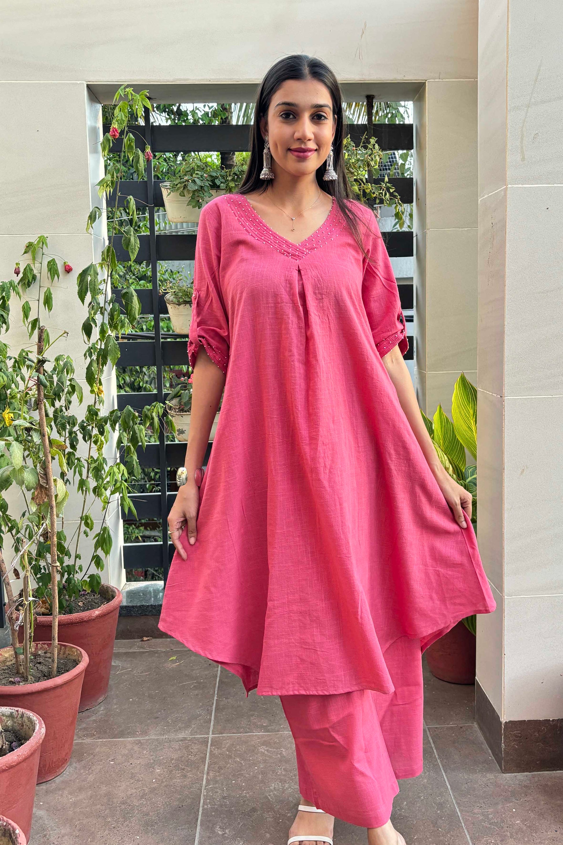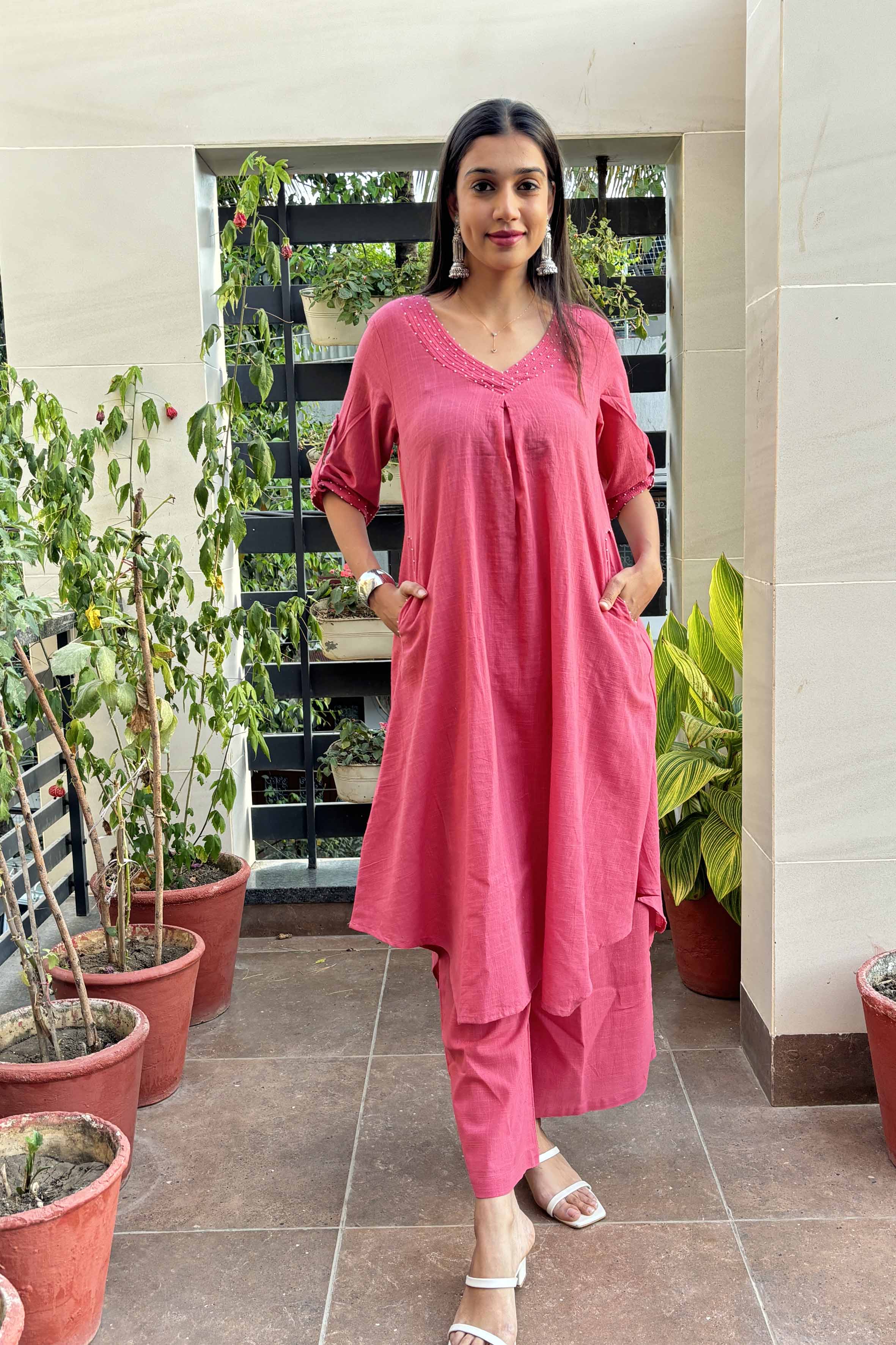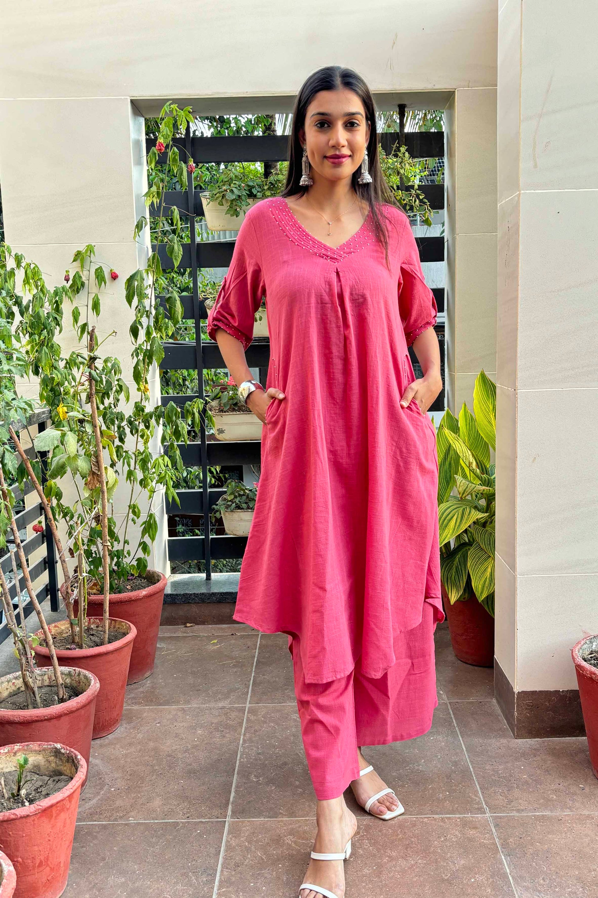 This pink cotton slub kurta features a comfortable V-neck design adorned with delicate thread and bead work, perfect for summer wear. Paired with loose palazzo pants, it offers a relaxed fit and ease of movement. Practical pockets add convenience without compromising style, making this set an ideal blend of elegance and comfort for warm weather.
