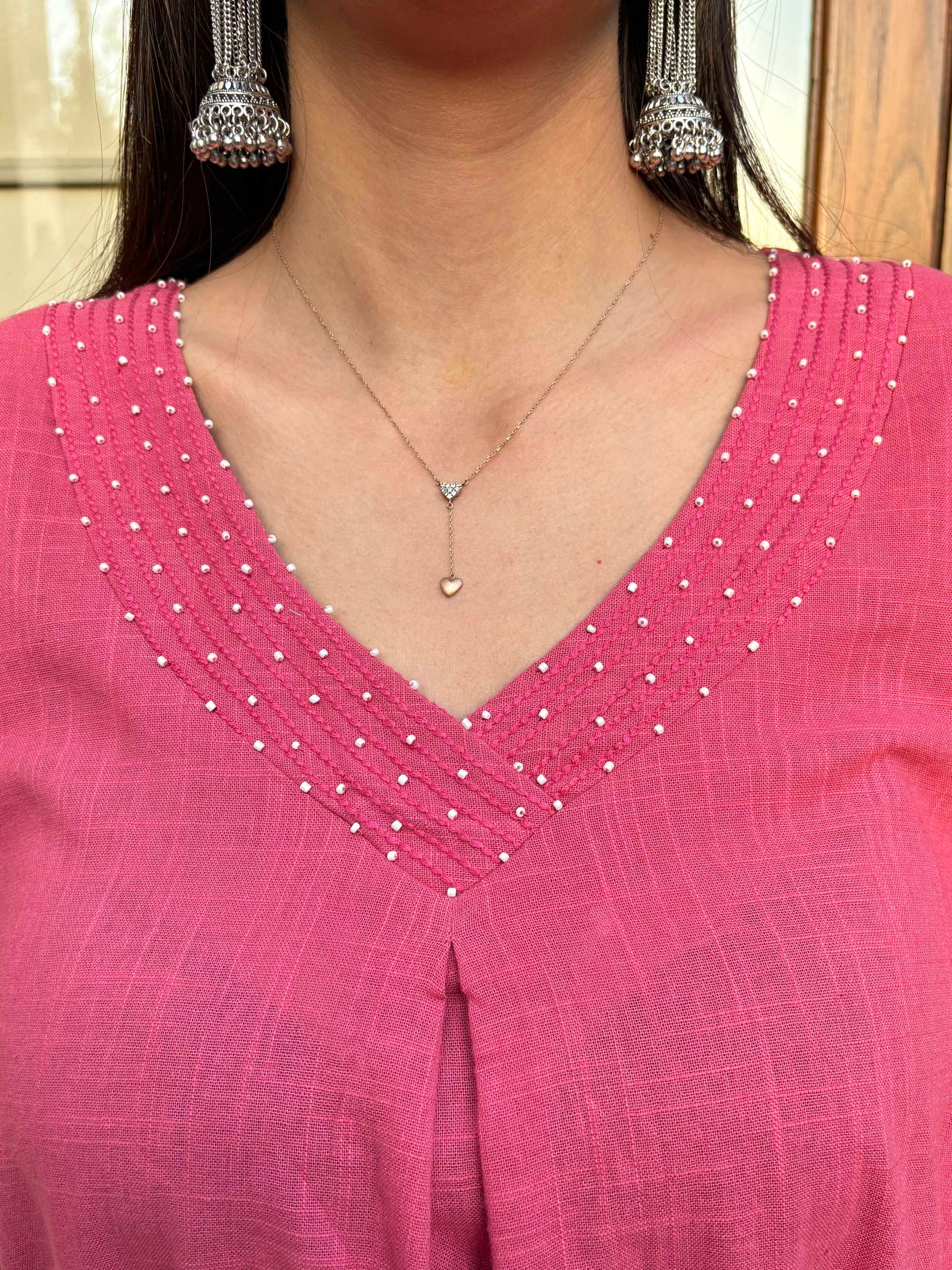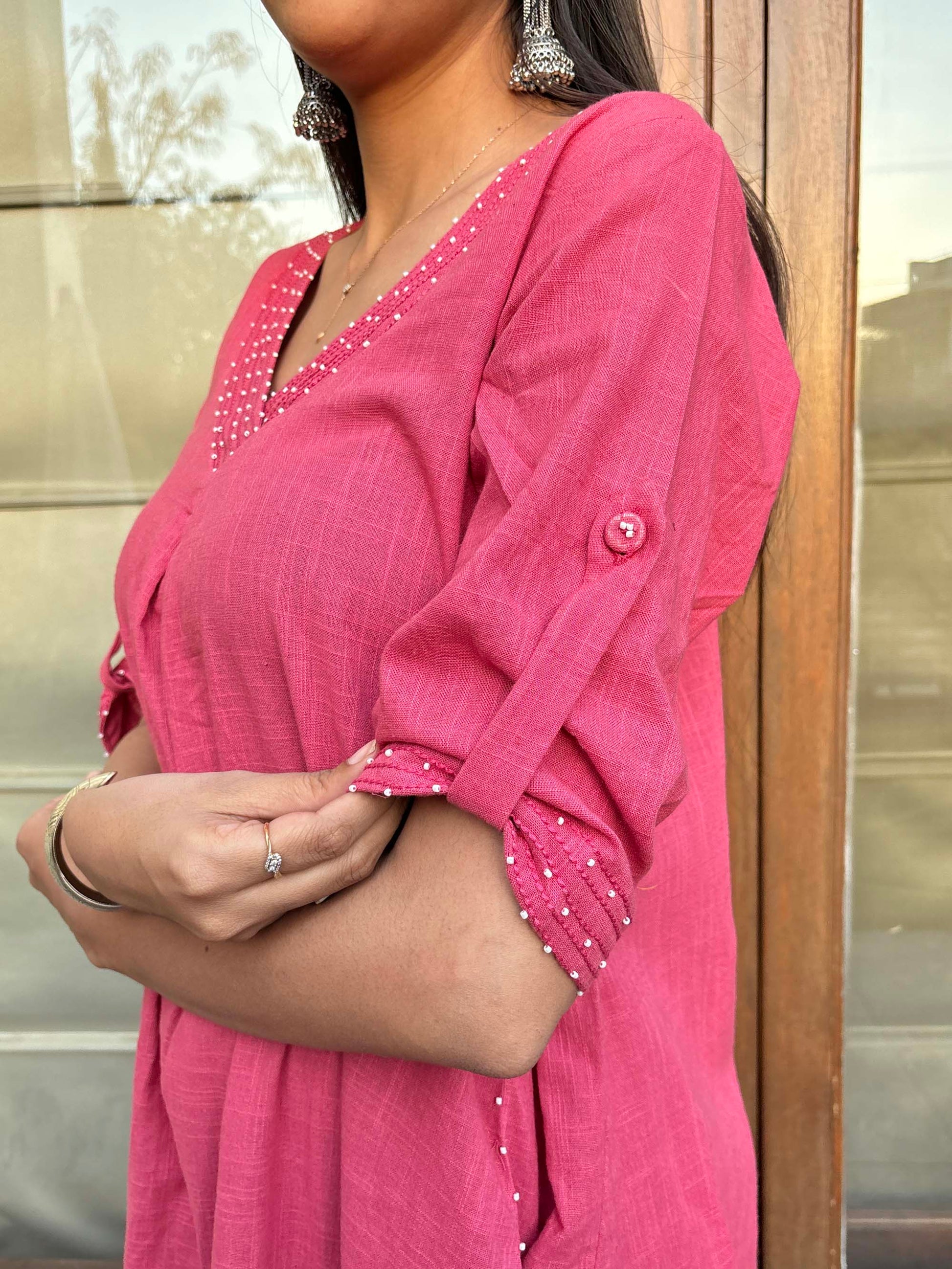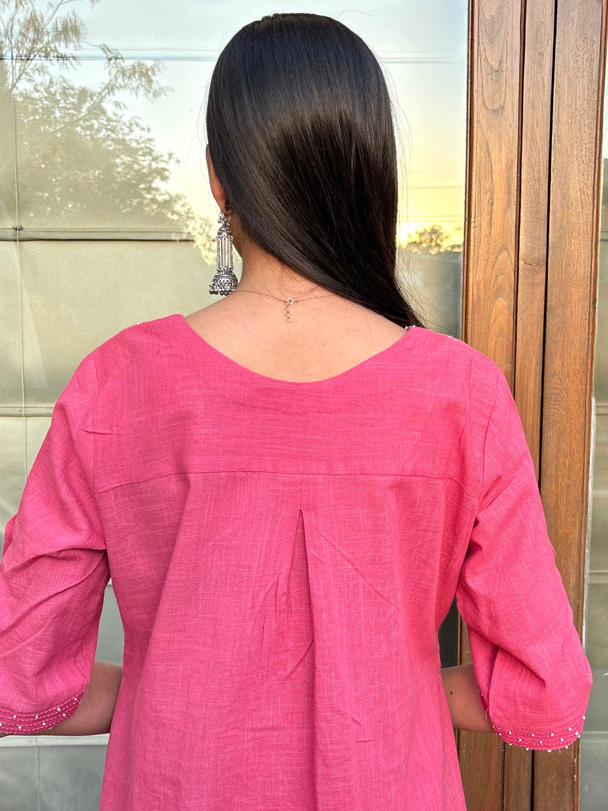 Elevate your everyday style in this beautiful pink cotton slub kurta. The Neck is highlighted with kantha stitch and white Beads.