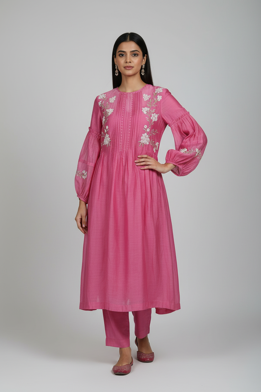 Pink Mul Chanderi Silk Embroidered Kurta With Pants