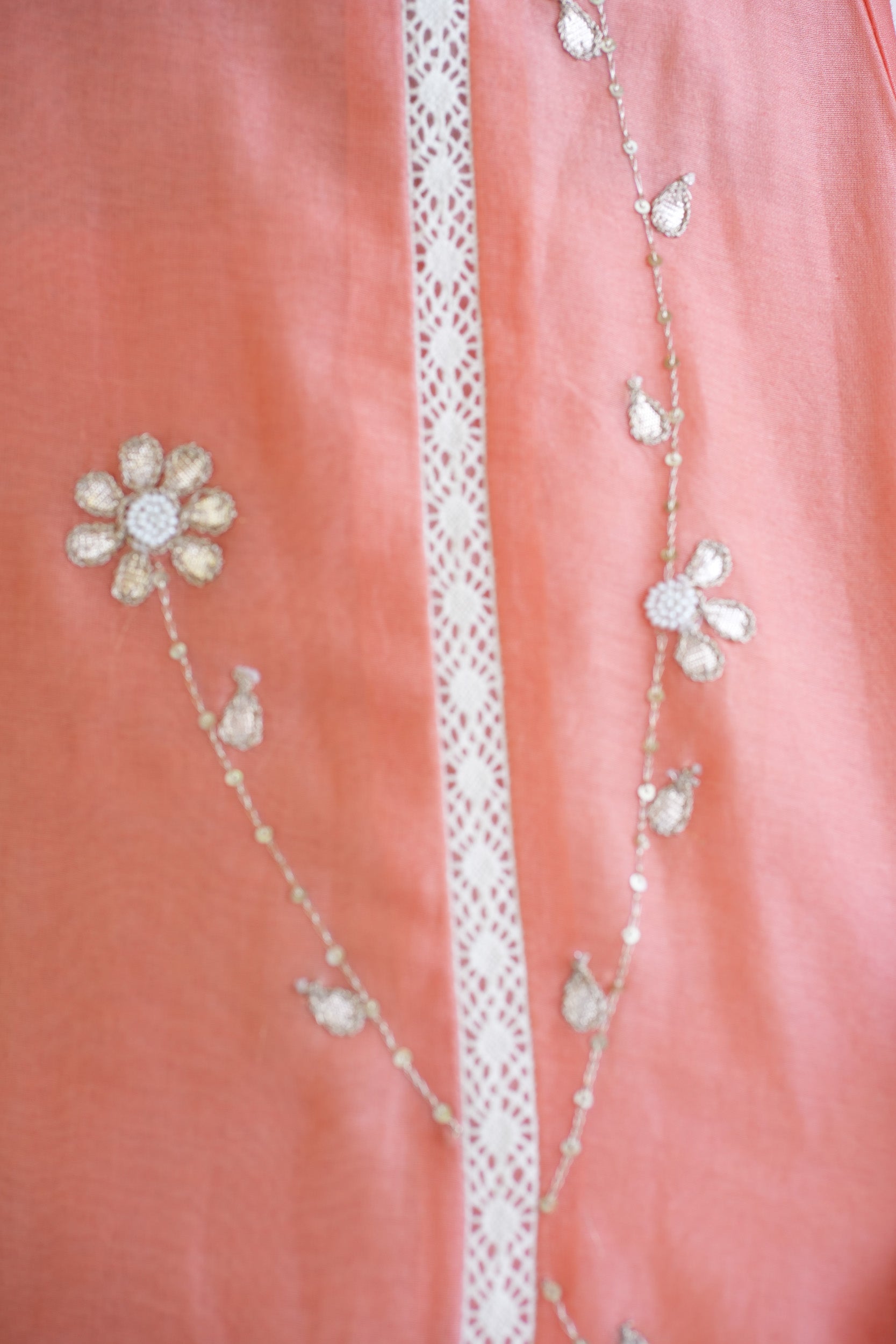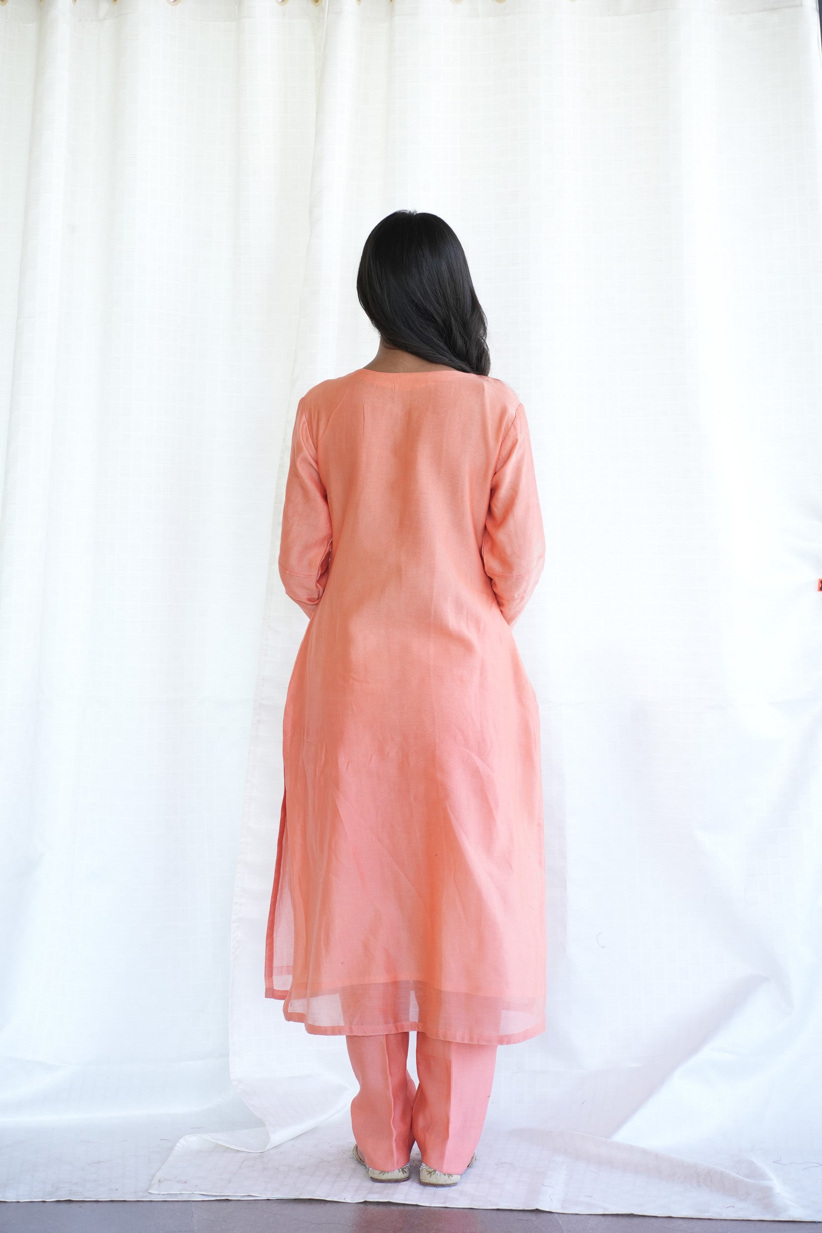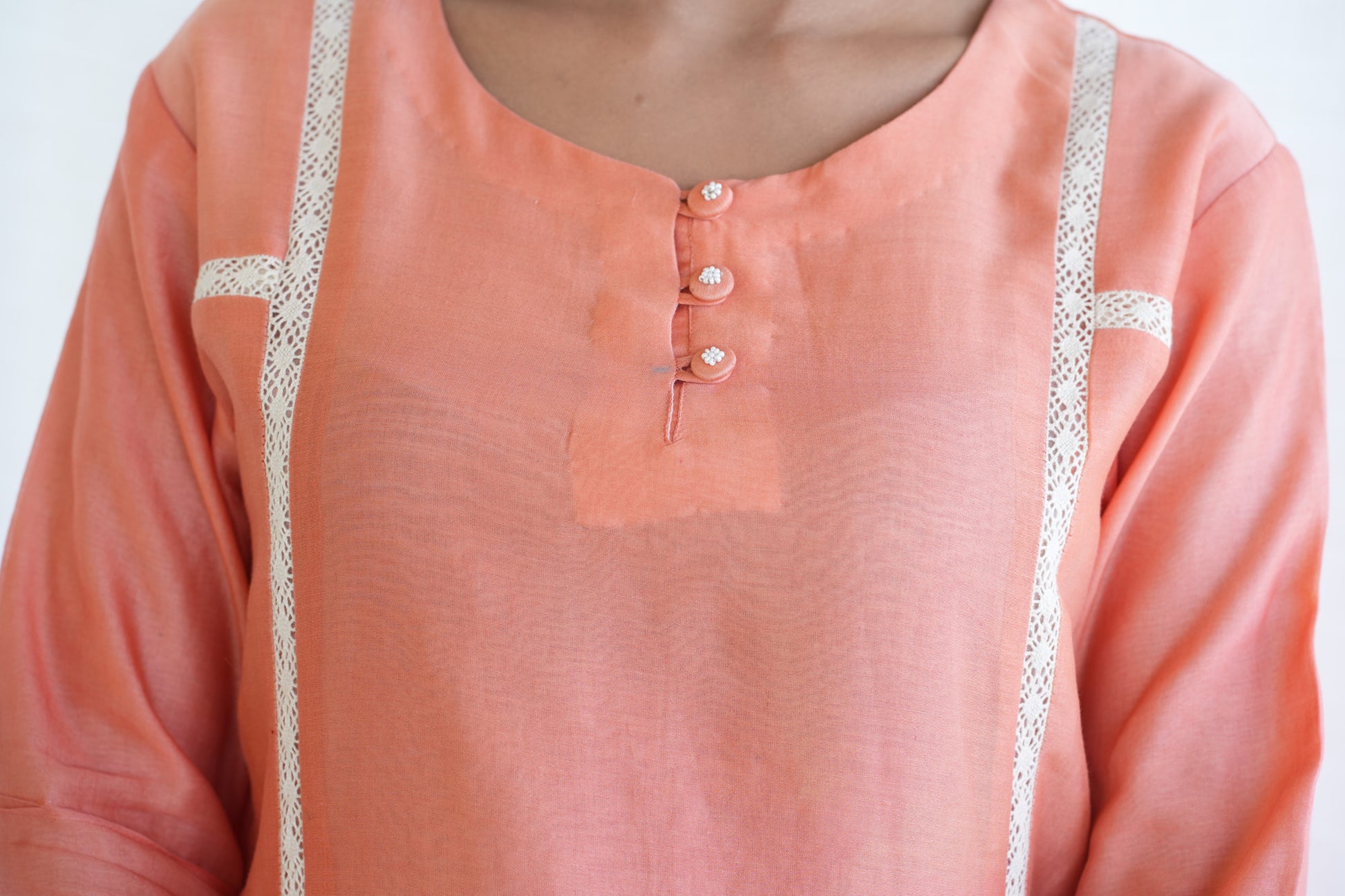 Beautiful and Comfertable this chanderi silk suit is hancrafted with gotta work and cotton lace.It comes with chanderi pants