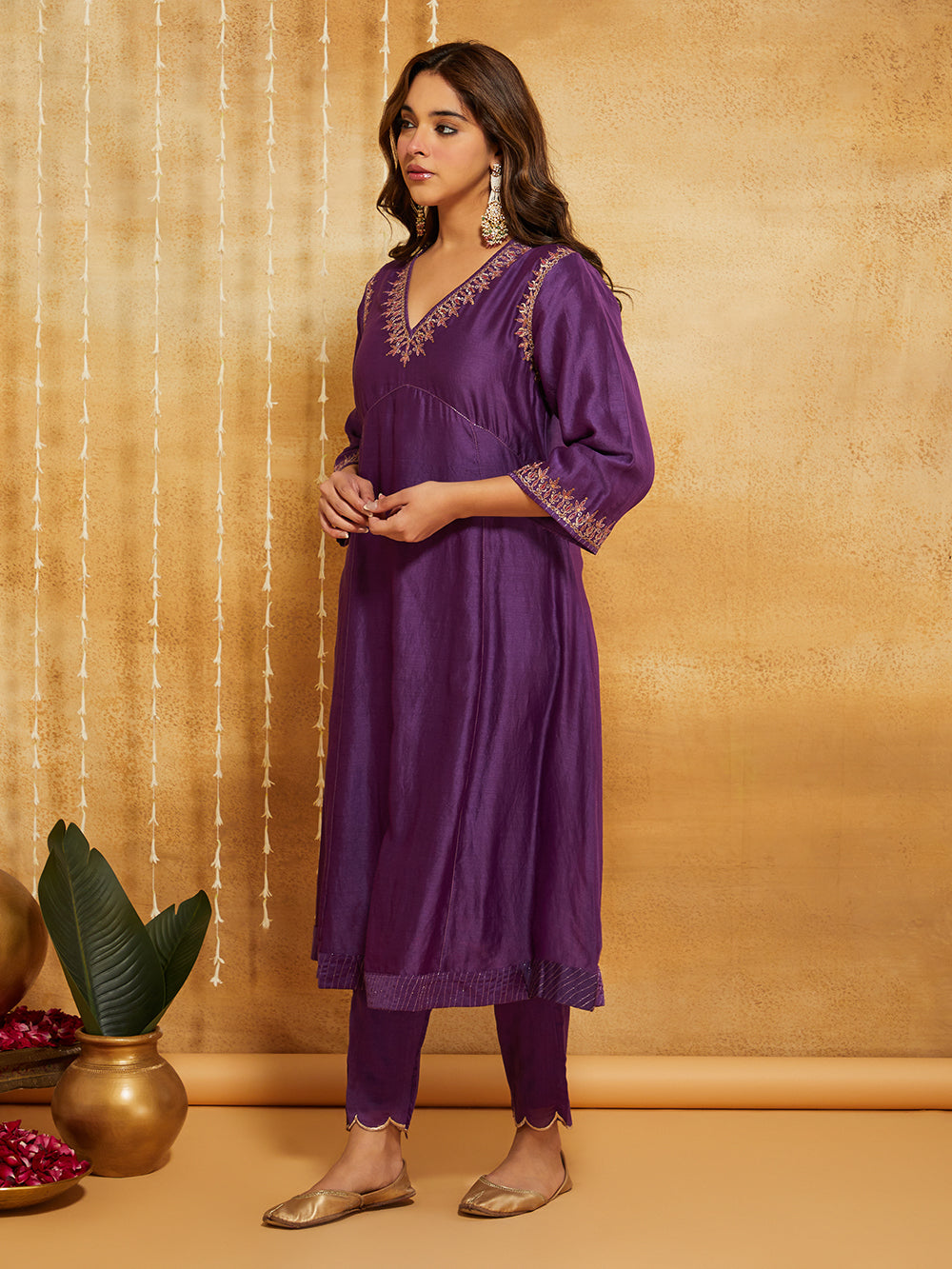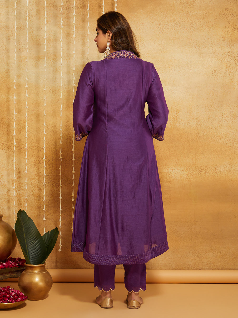 Purple Embroidered Chanderi Silk Suit- Set of 3