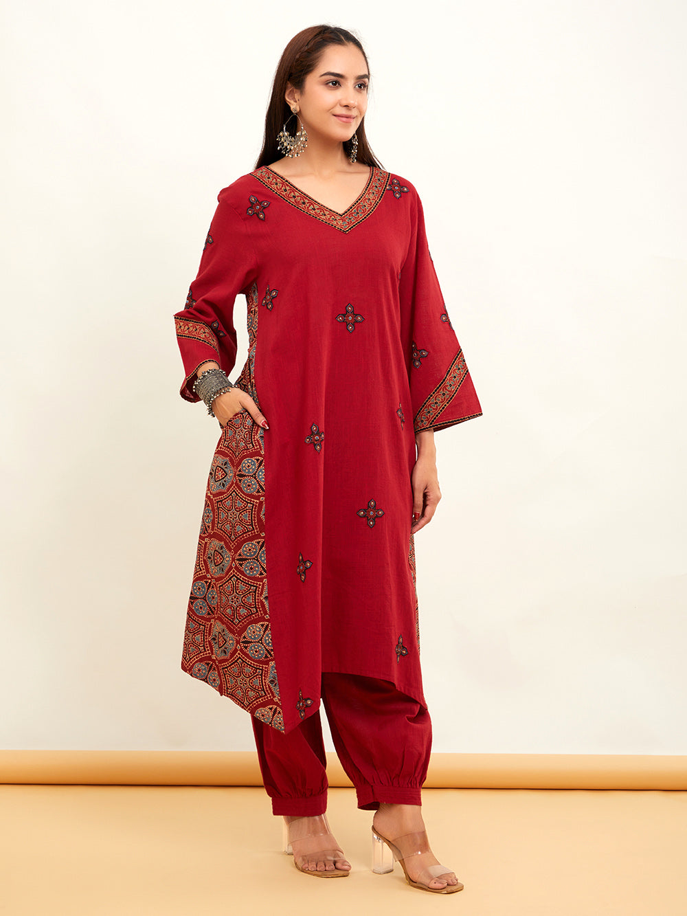 The Red Ajrakh kurta purely crafted in cotton slub which has patched of ajrakh in the center.