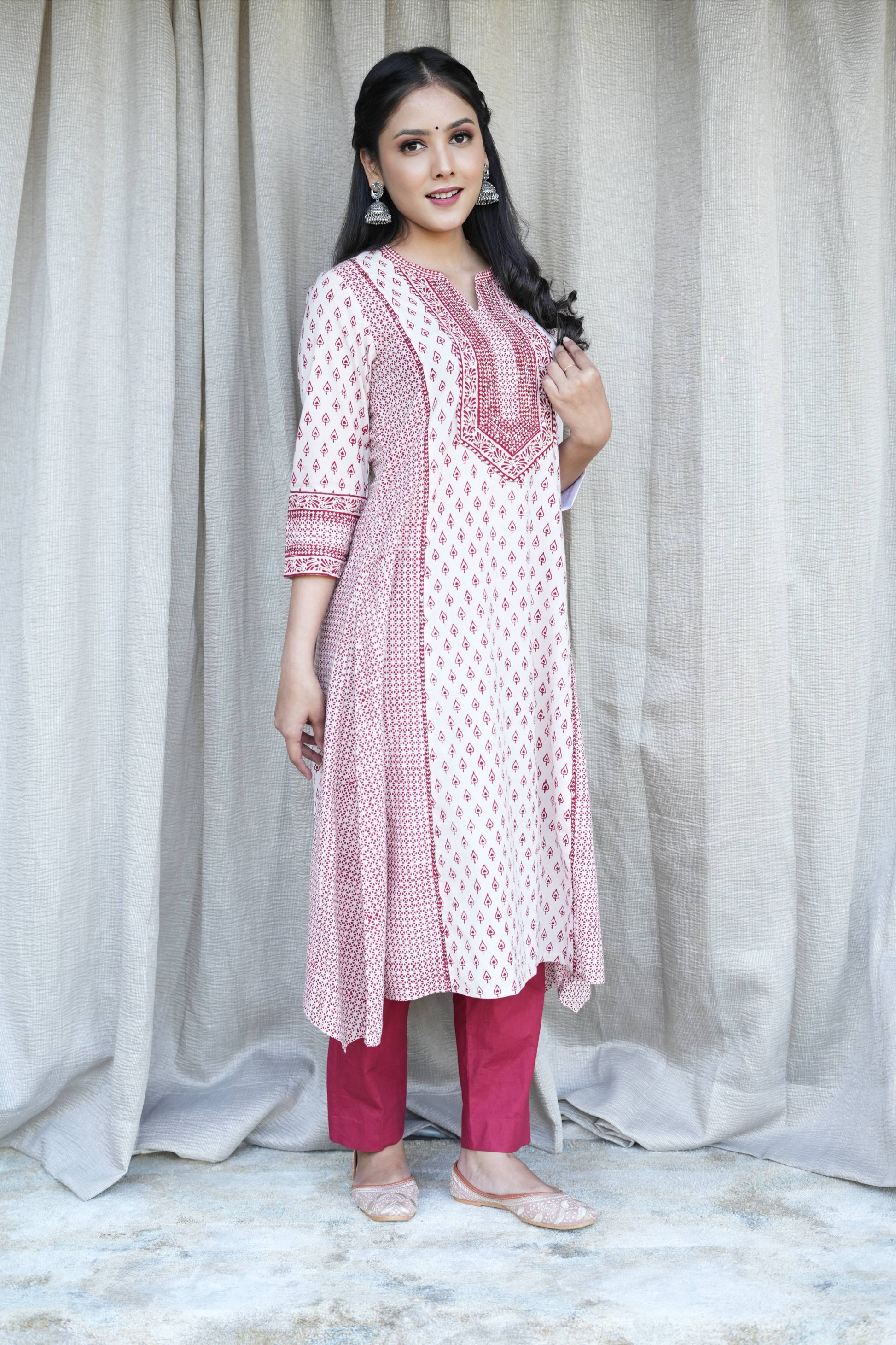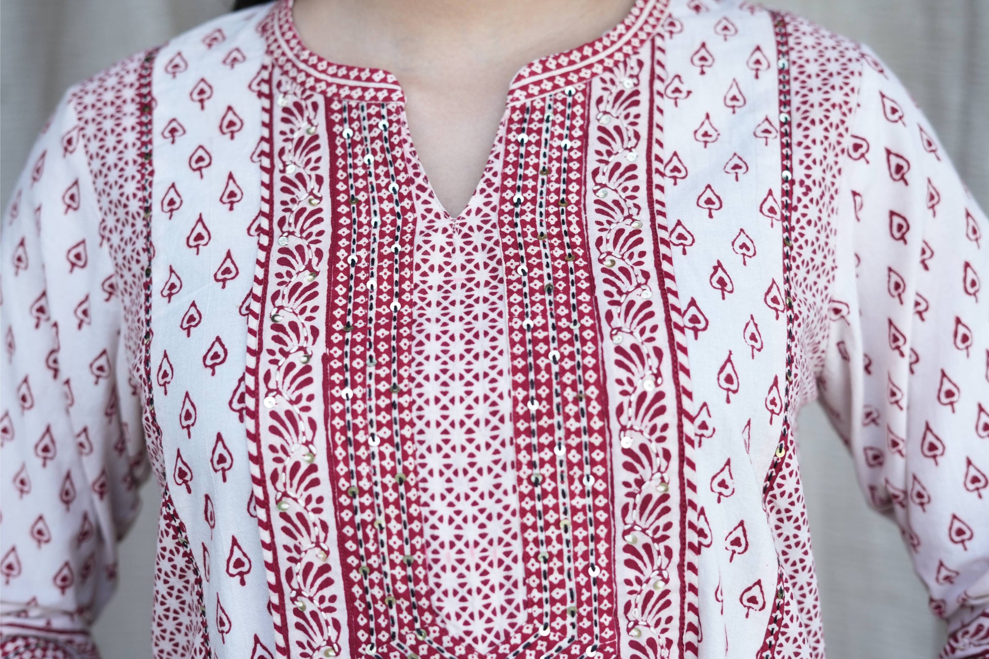 Dress yourself in this beautiful bagh cotton kurta block printed in combination of red and white.The yoke is embroidered with thread work and sequence