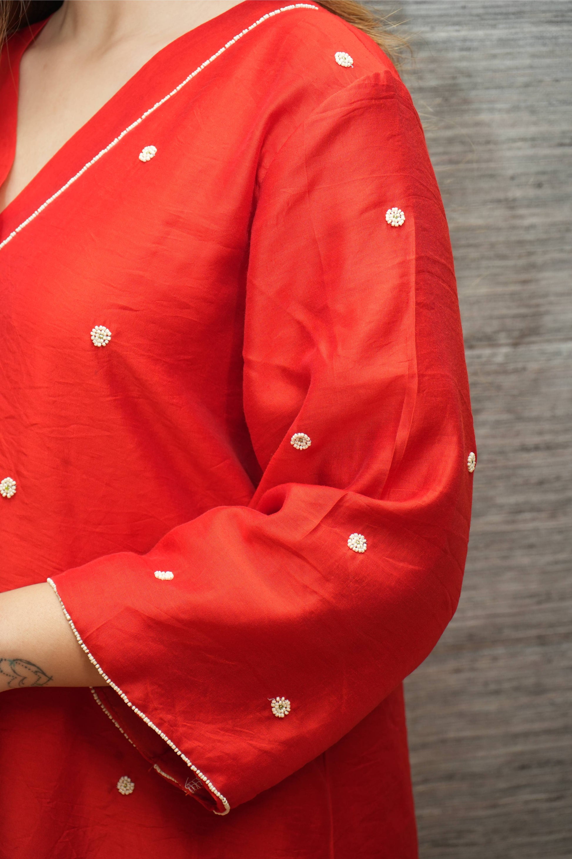 Handcrafted in chanderi silk perfect outfit this summer which has beads work in front panel & sleeves. It comes with attached lining & has 3/4th sleeves. It has V neckline.