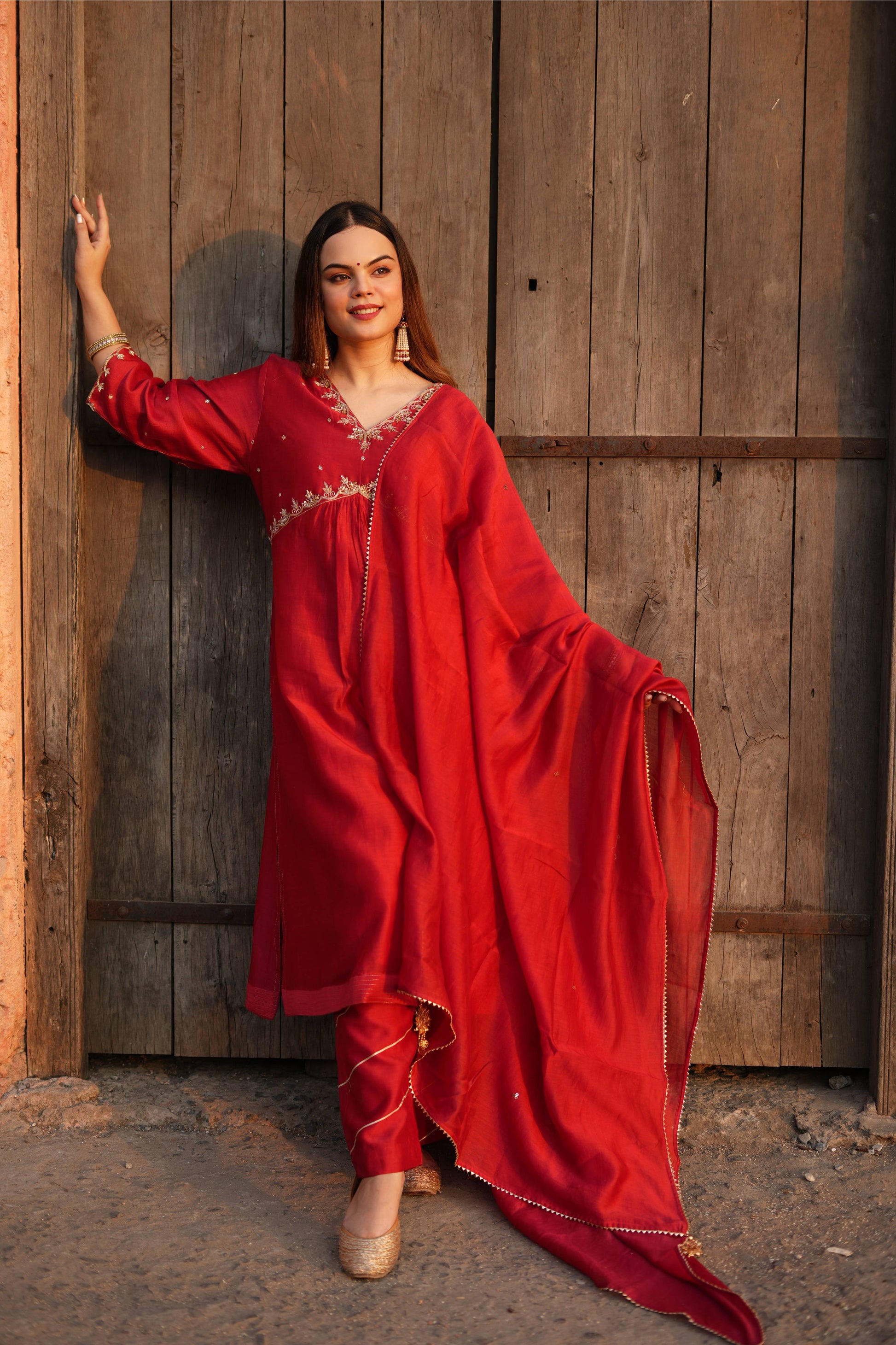 Red Chanderi Golden Embroidered Suit Set