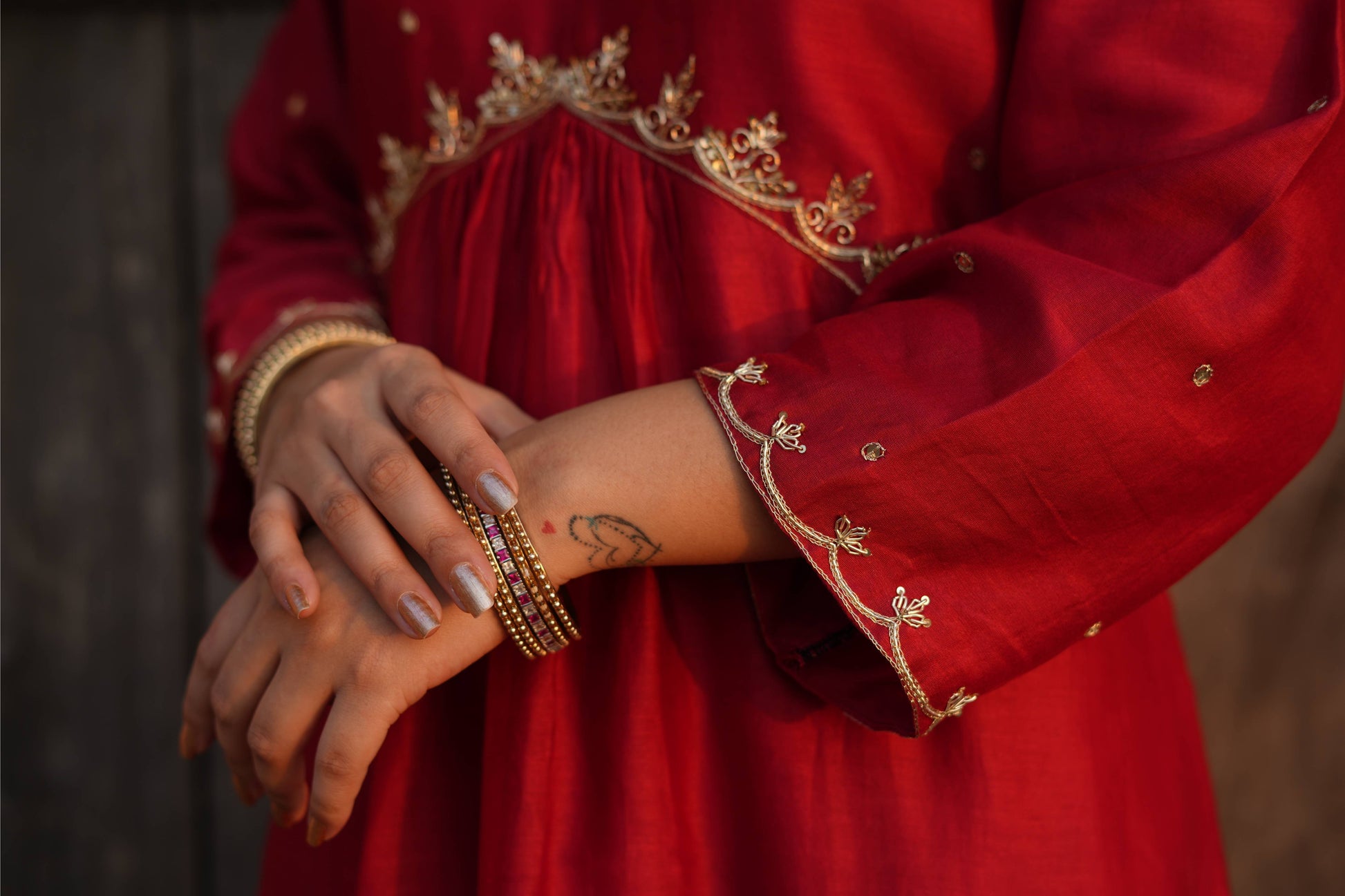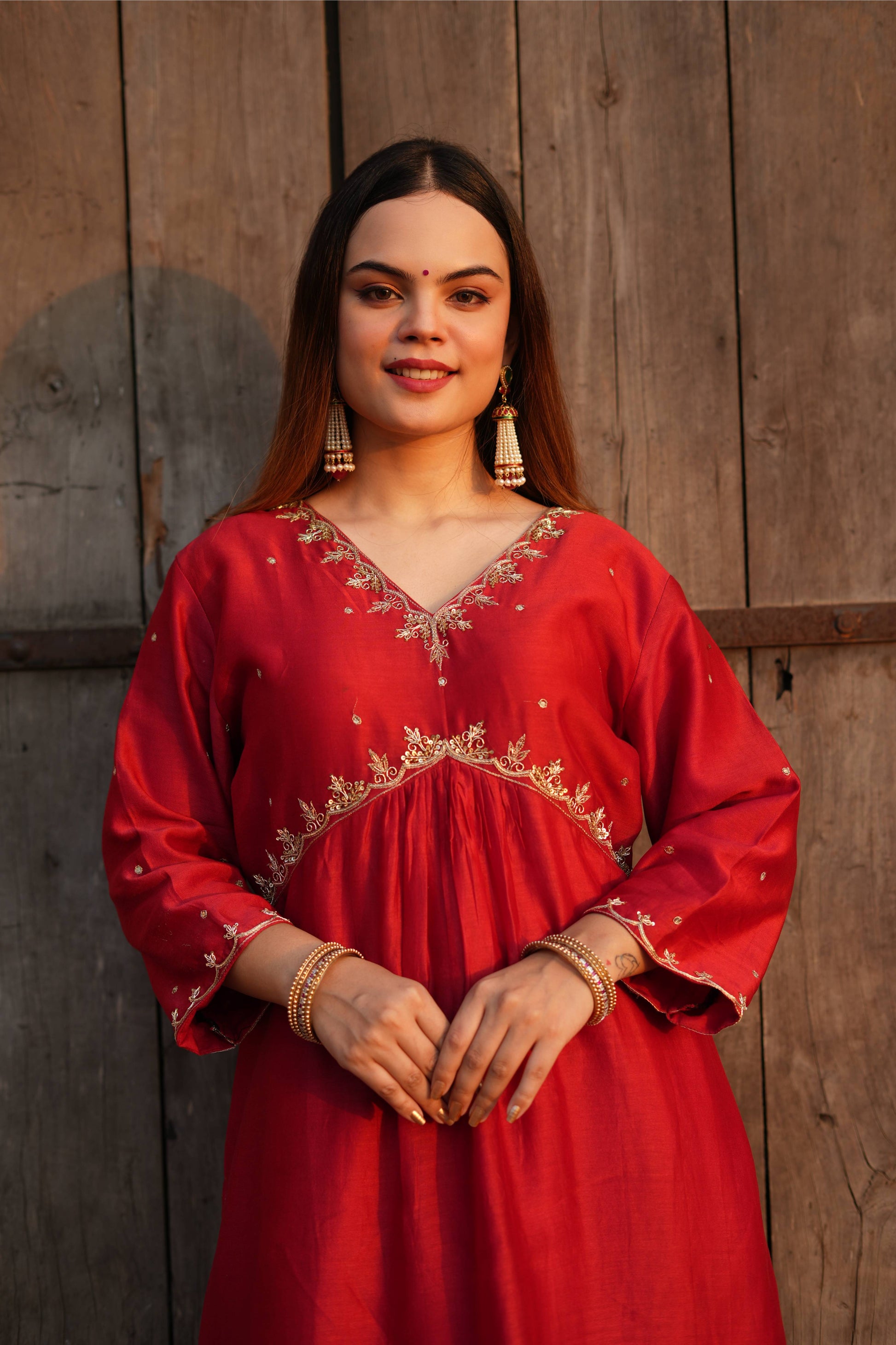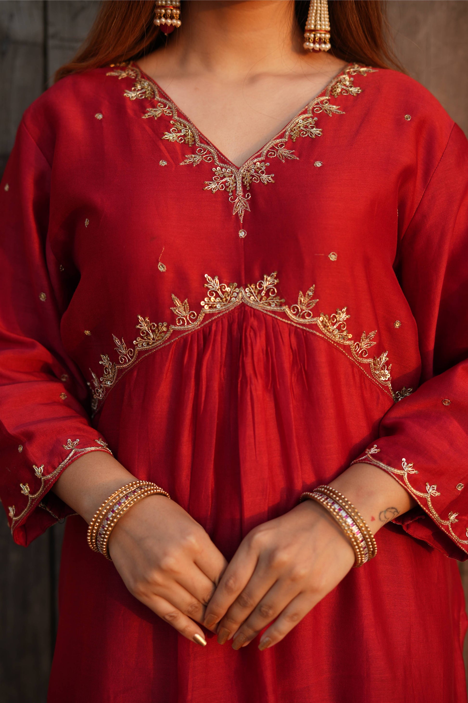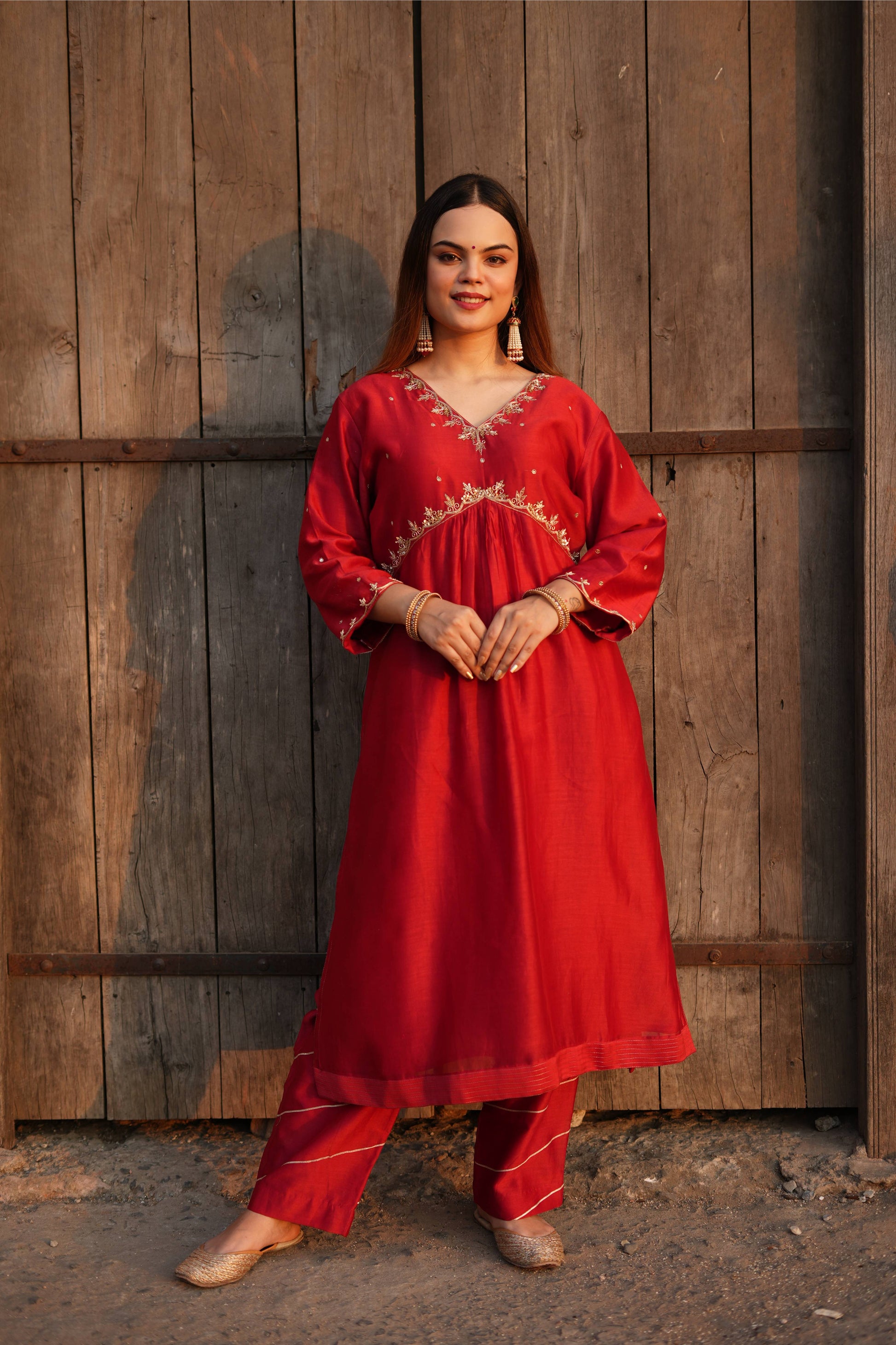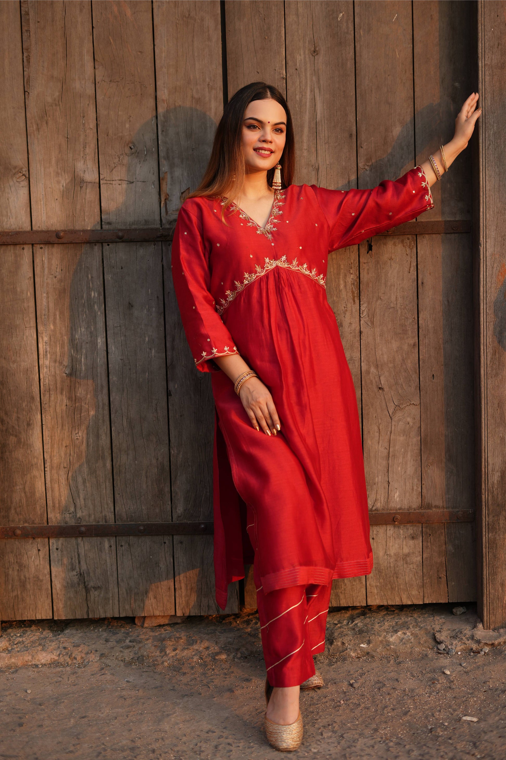Dress yourself in this Red Chanderi silk suit set which has golden dabka and sequence work on neck and sleeves .It comes with a chanderi pant which has gotta work in bottom