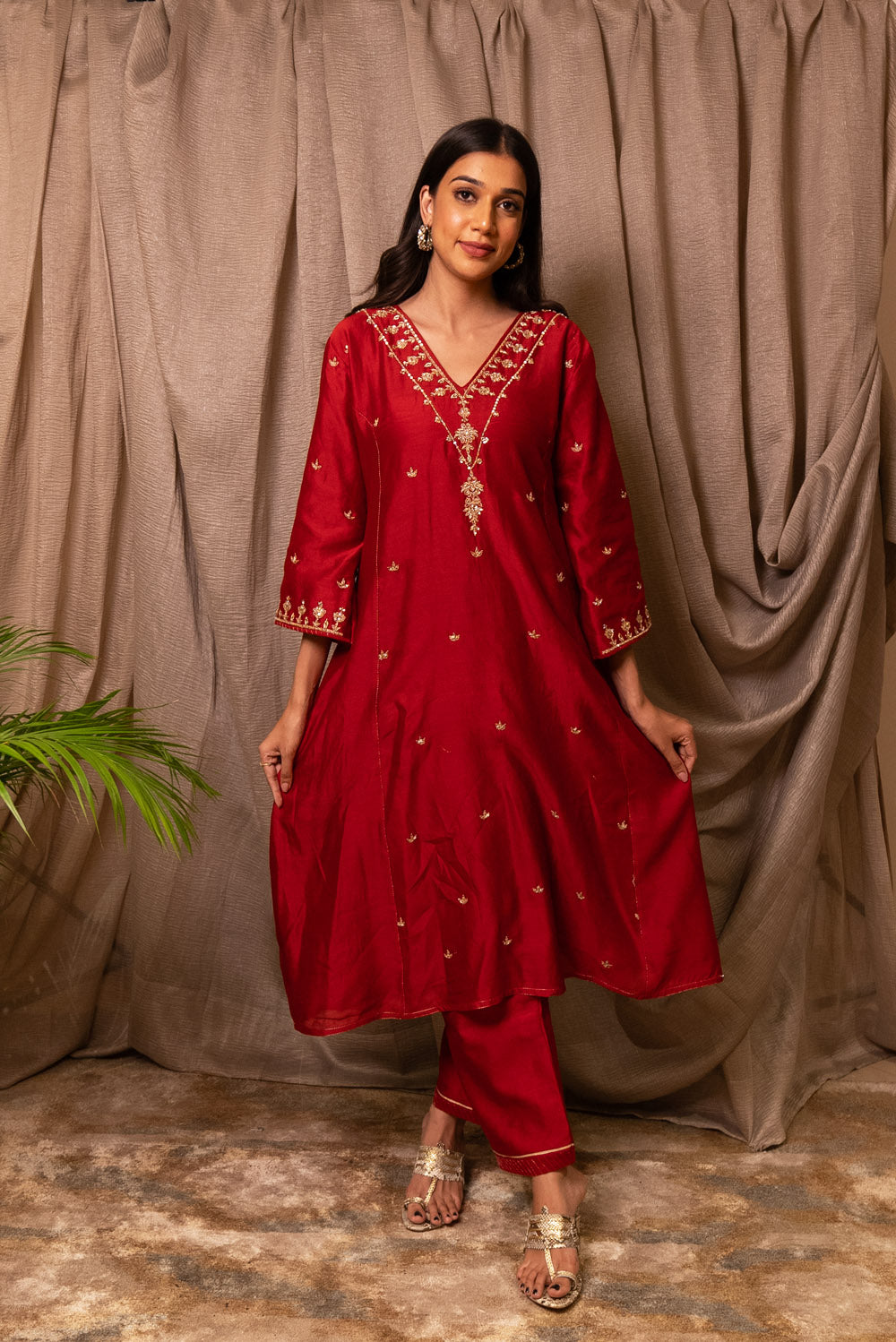 Red Chanderi Silk Golden Embroidered Kurta And Pant-Set of 2