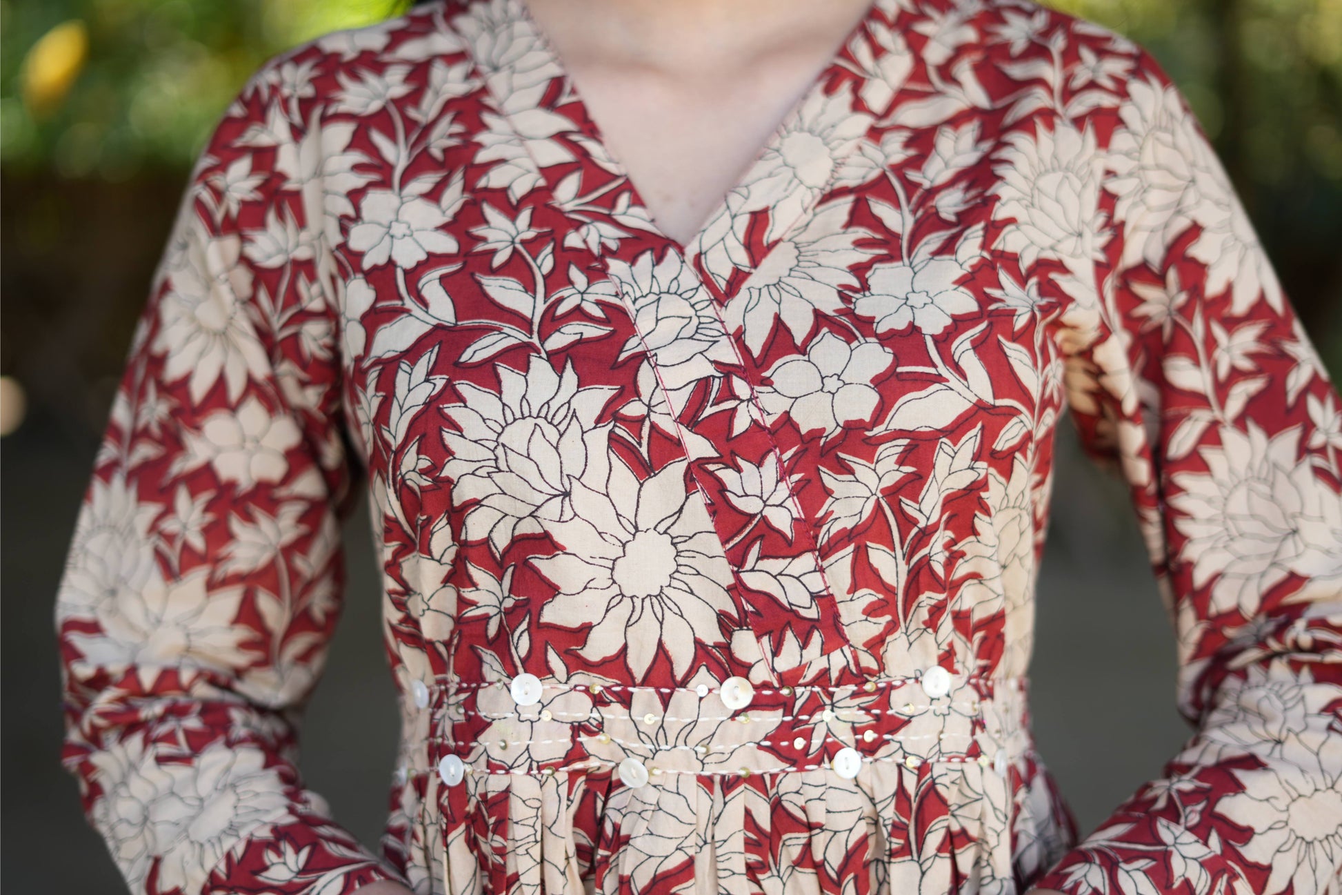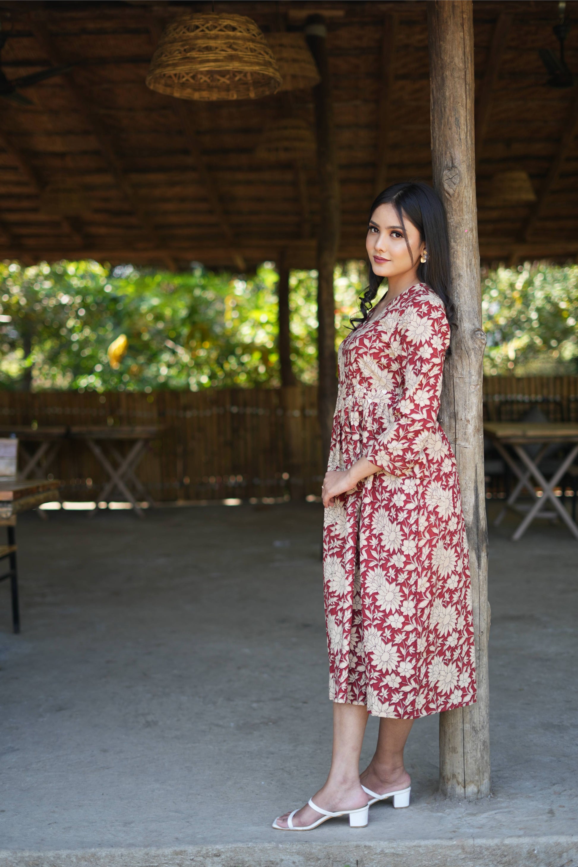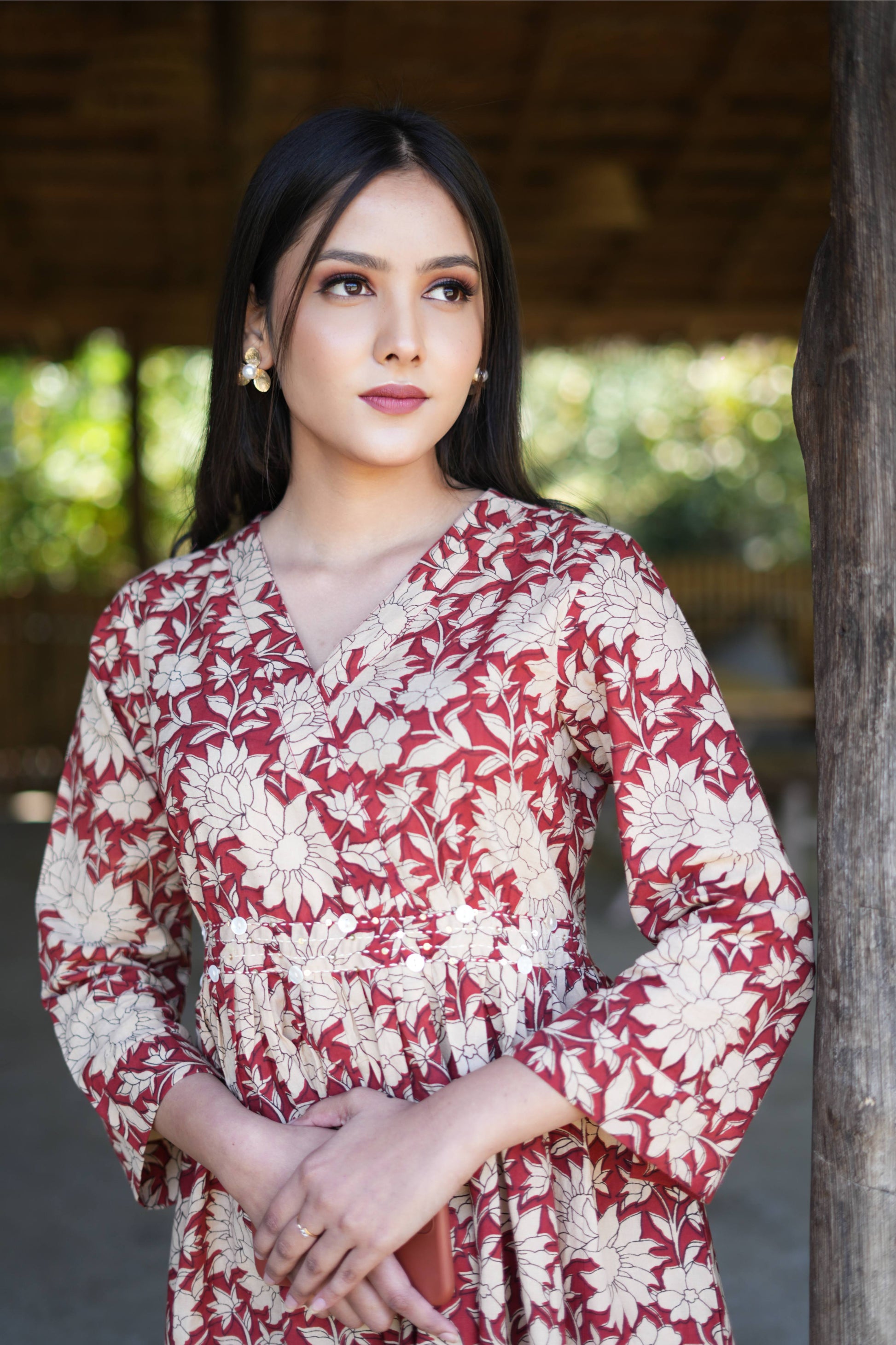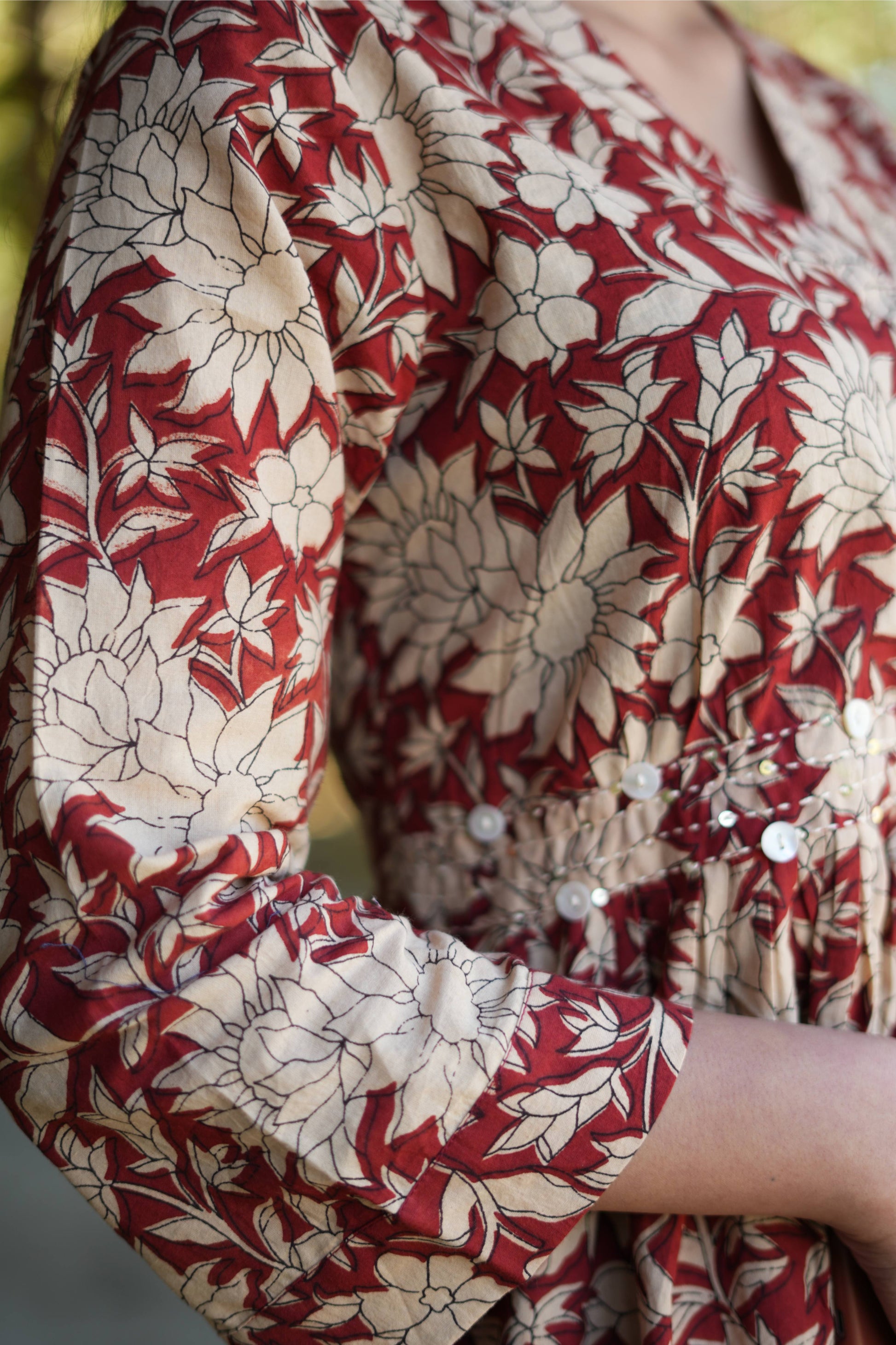 Red Kalamkari White Flower Hand Embroiderd Dress