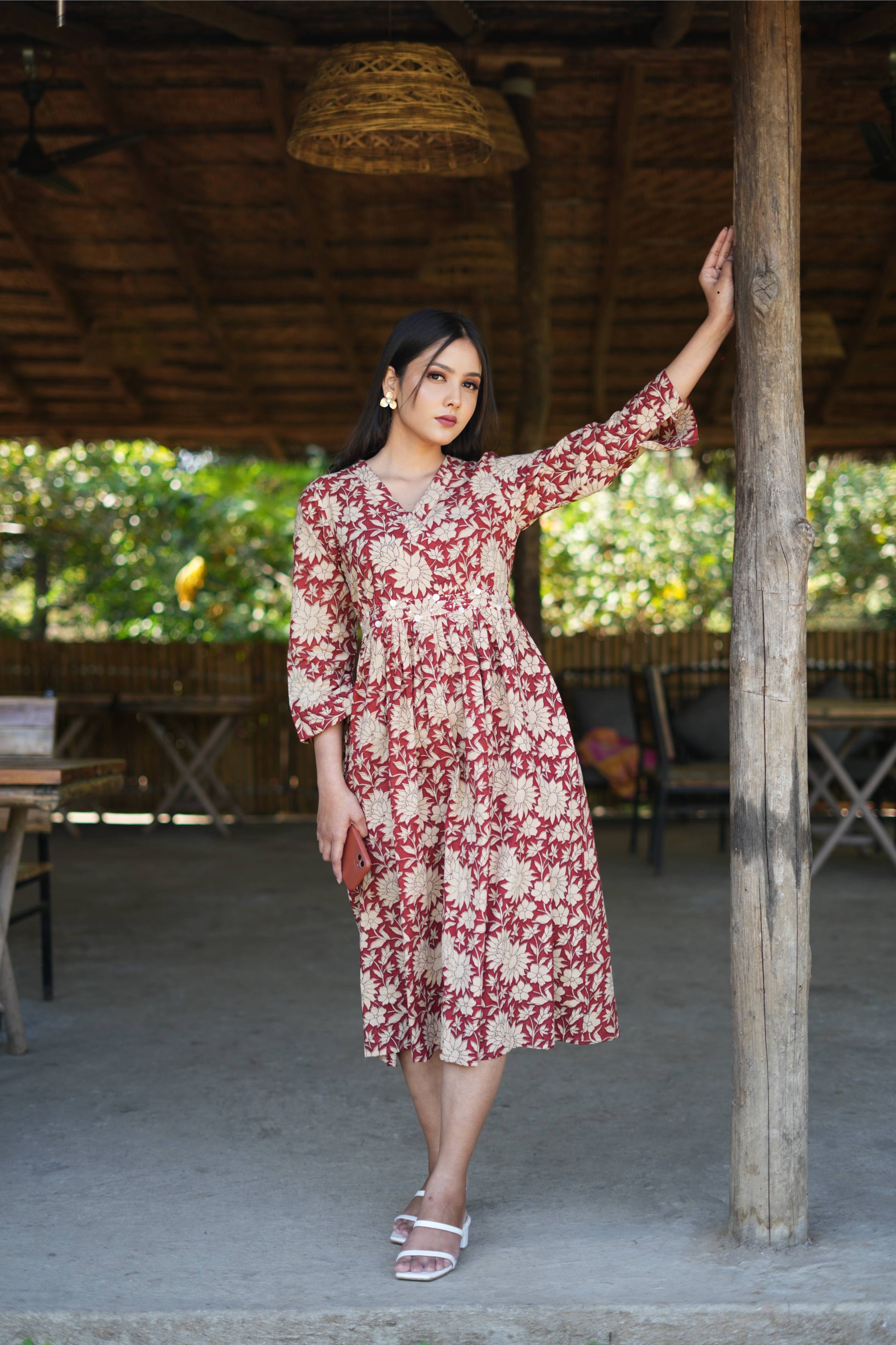 This cotton kalamkari floral print dress has highlight of kantha and button work on the waist. It has 3/4th sleeves.