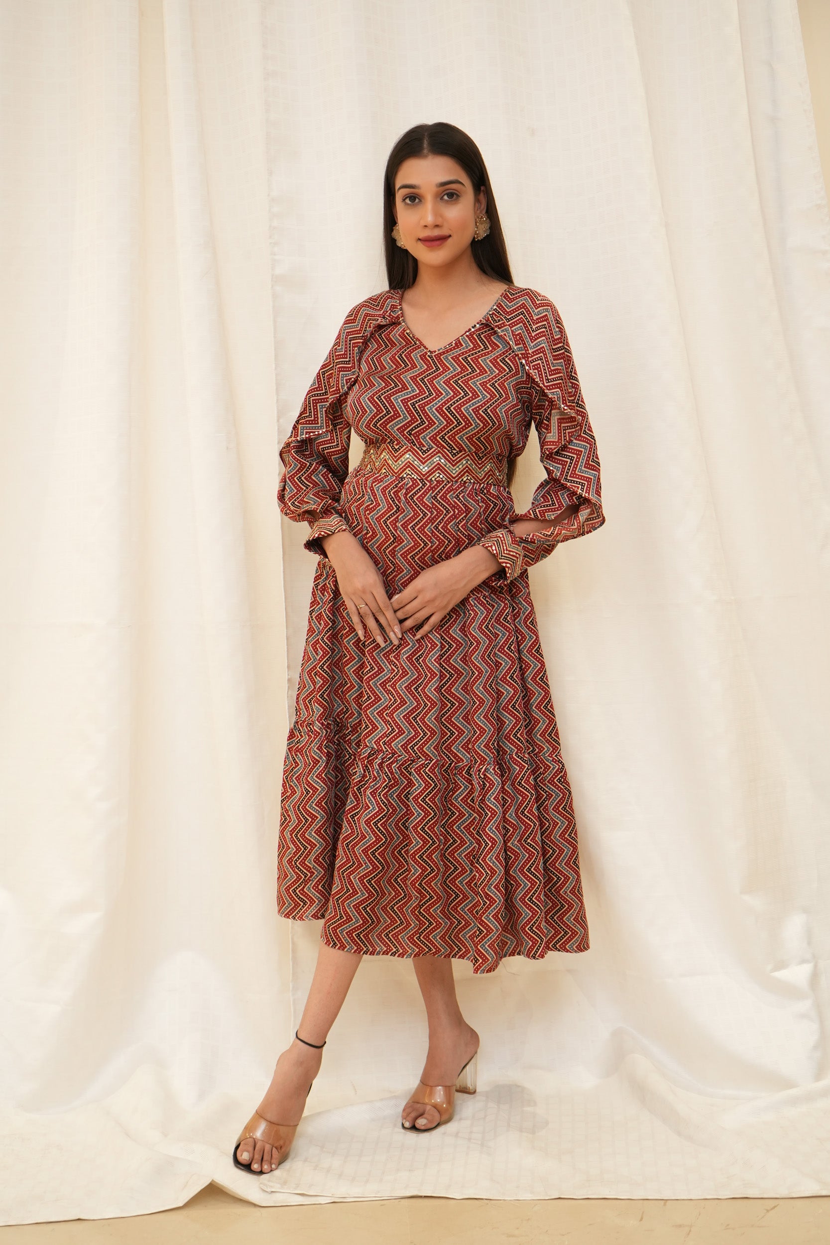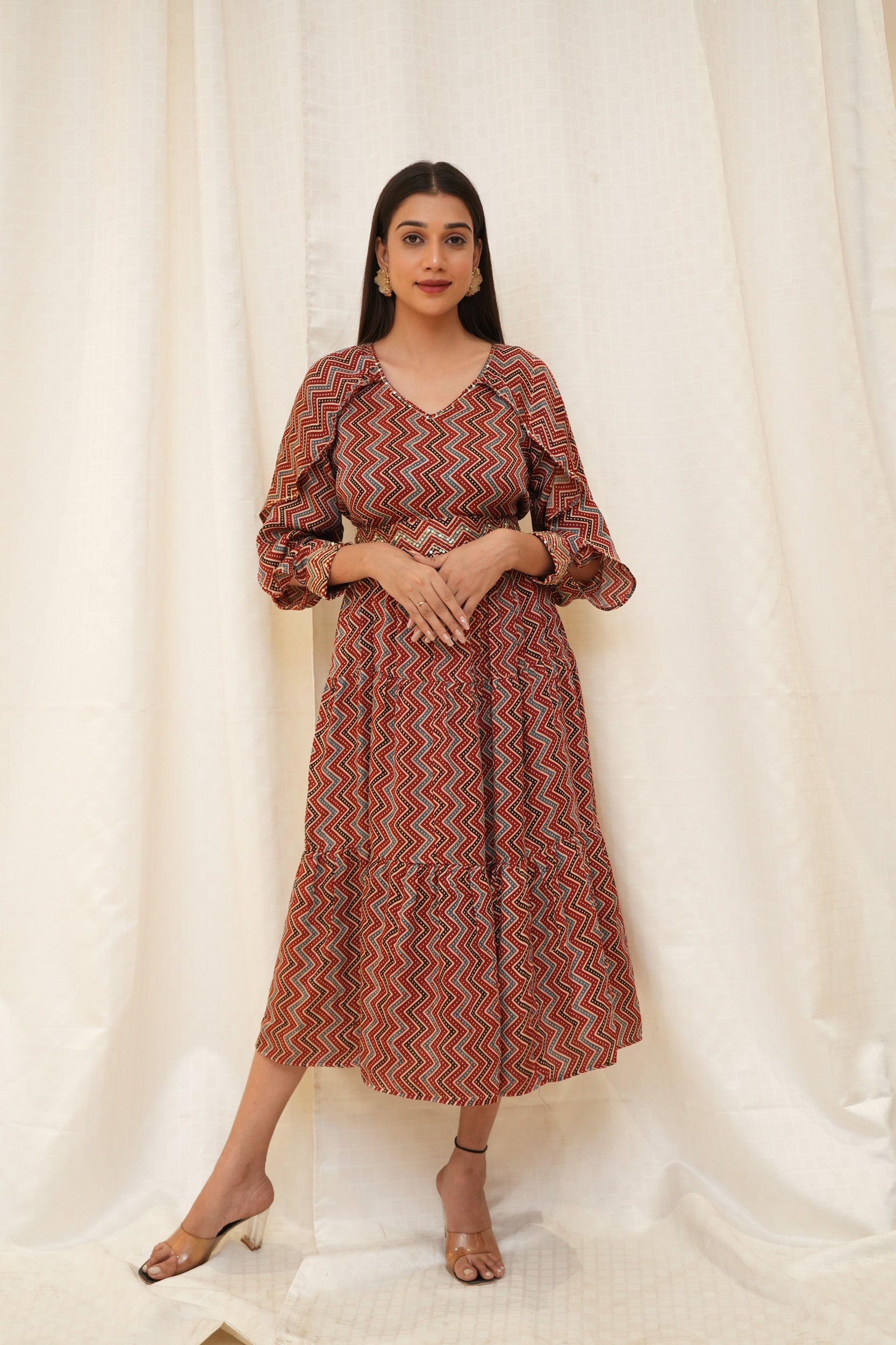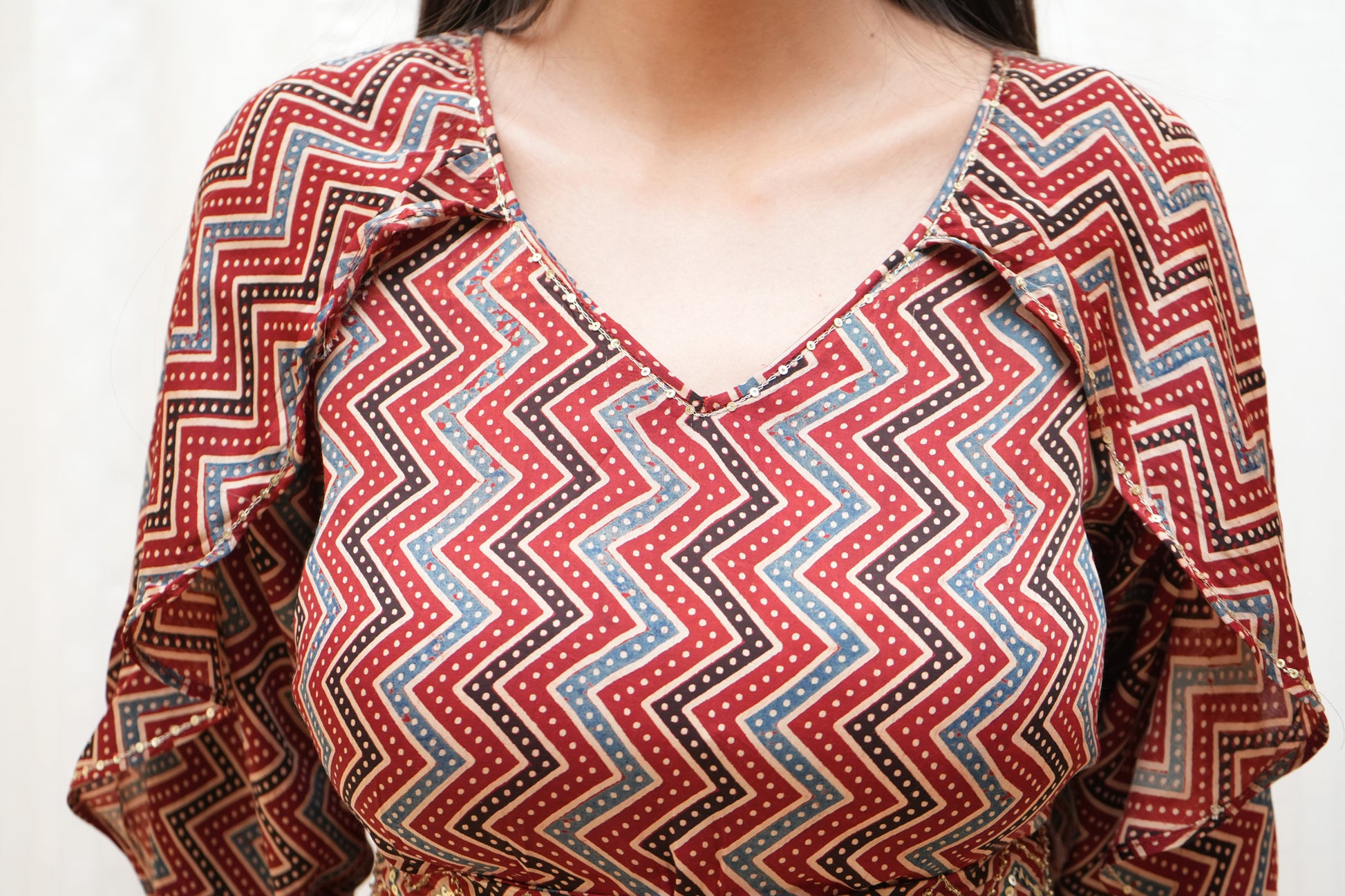 This red zigzag ajrakh dress features delicate petal sleeves adorned with intricate sequence zari embroidery, adding a refined shimmer to its traditional print. The tiered silhouette is complemented by a waist belt embellished with matching details, enhancing the dress's elegant structure and flattering fit. Perfect for those who appreciate artisanal craftsmanship combined with contemporary style.