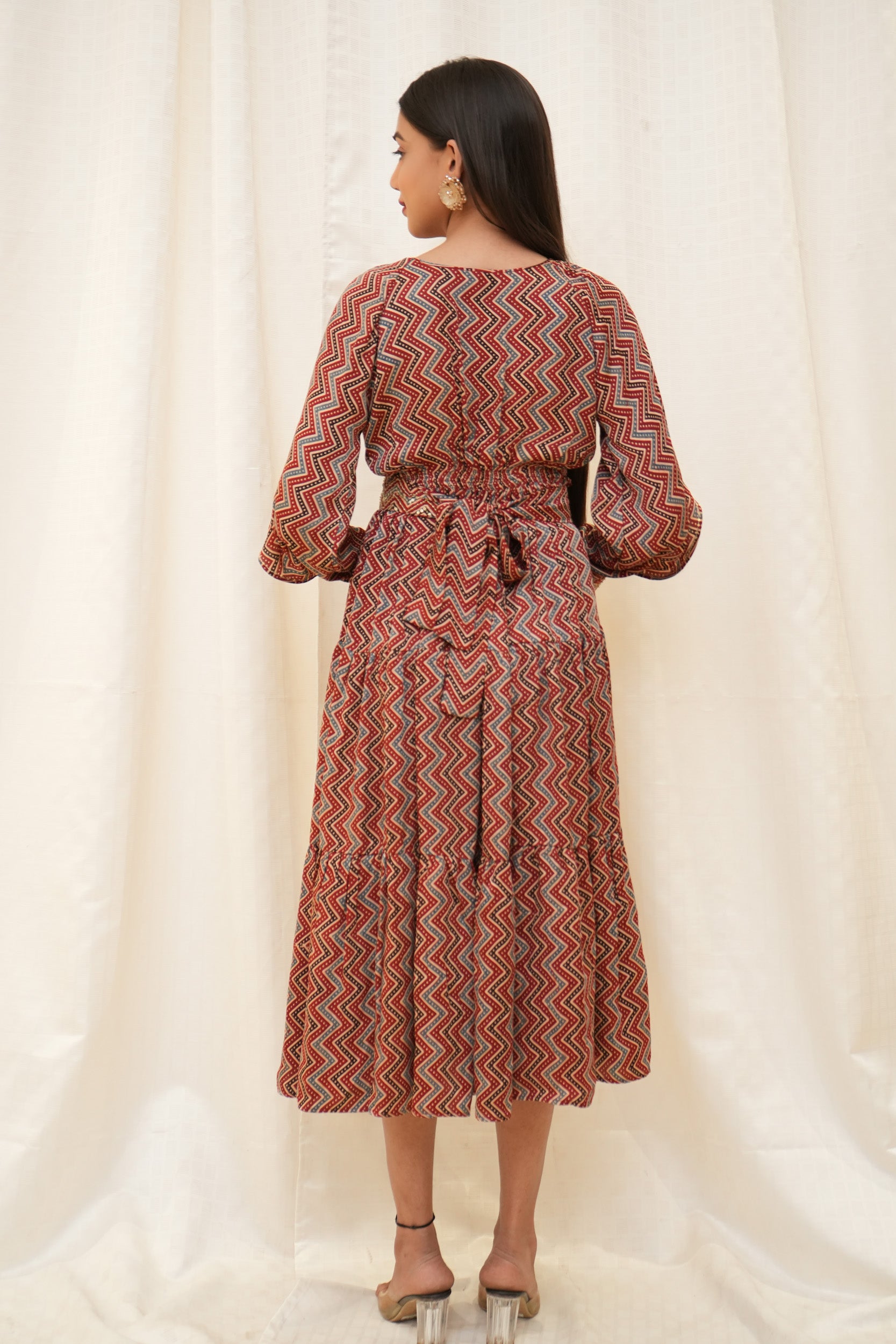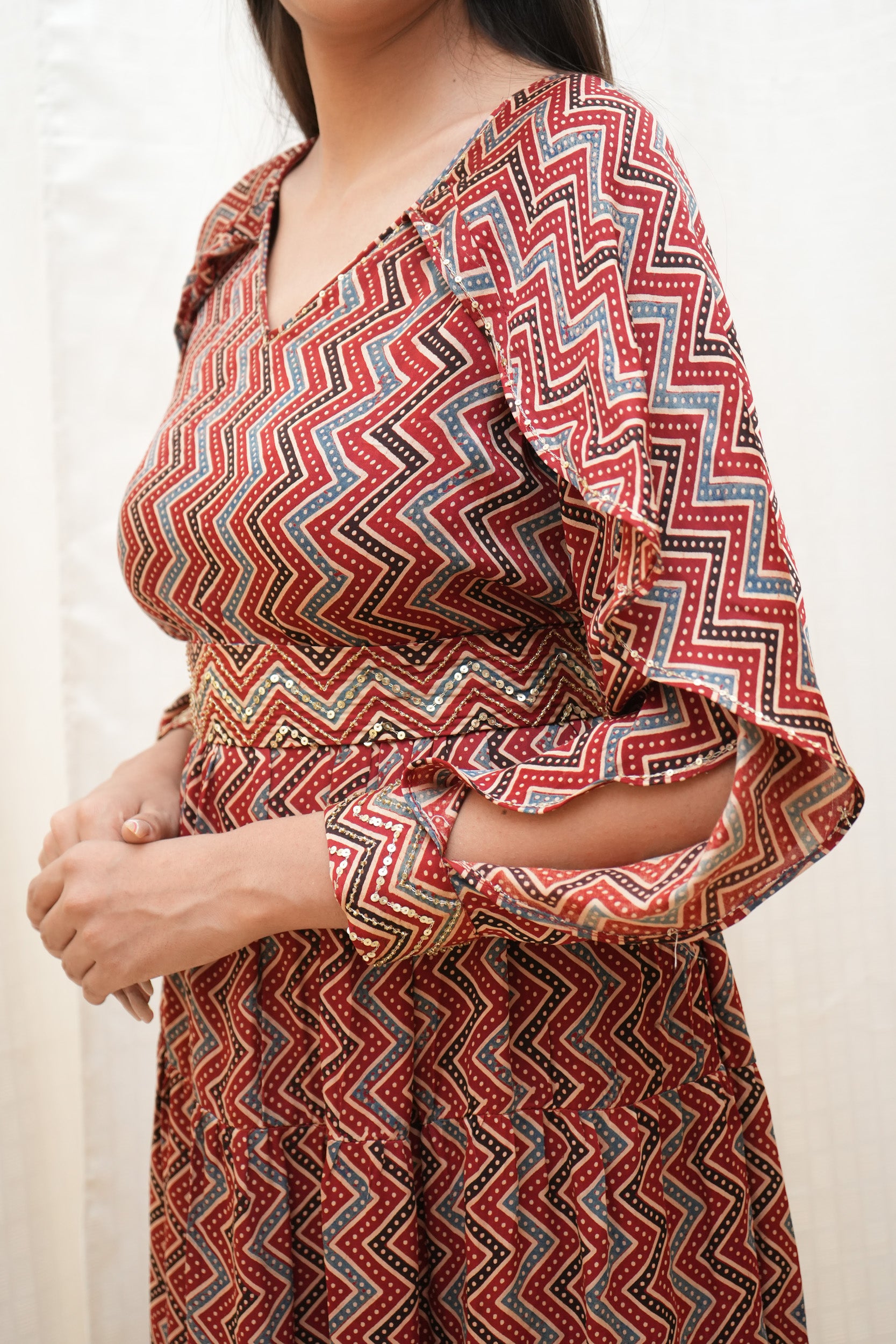 Red Zigzag ajrakh sequence embellished petal sleeve tier dress
