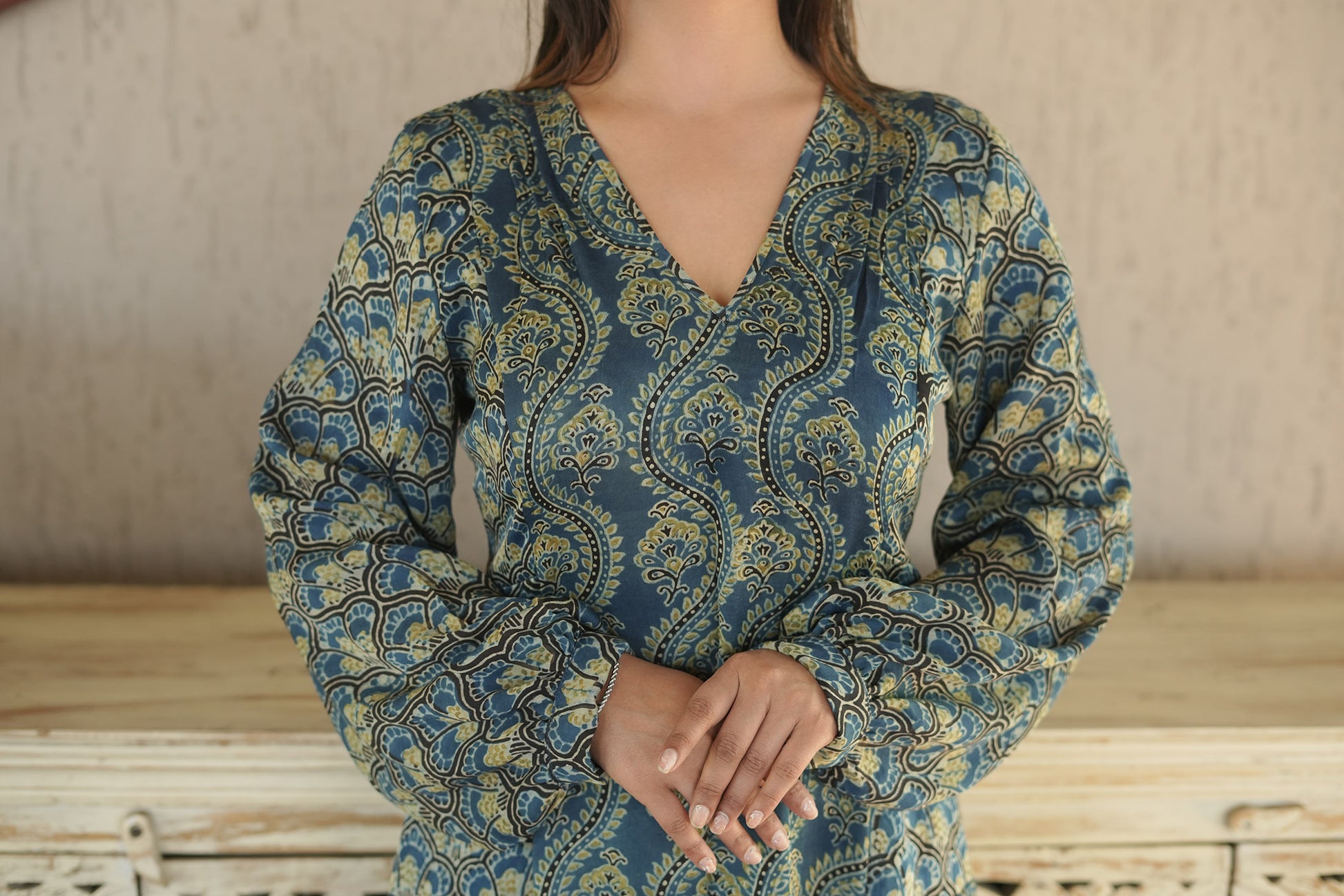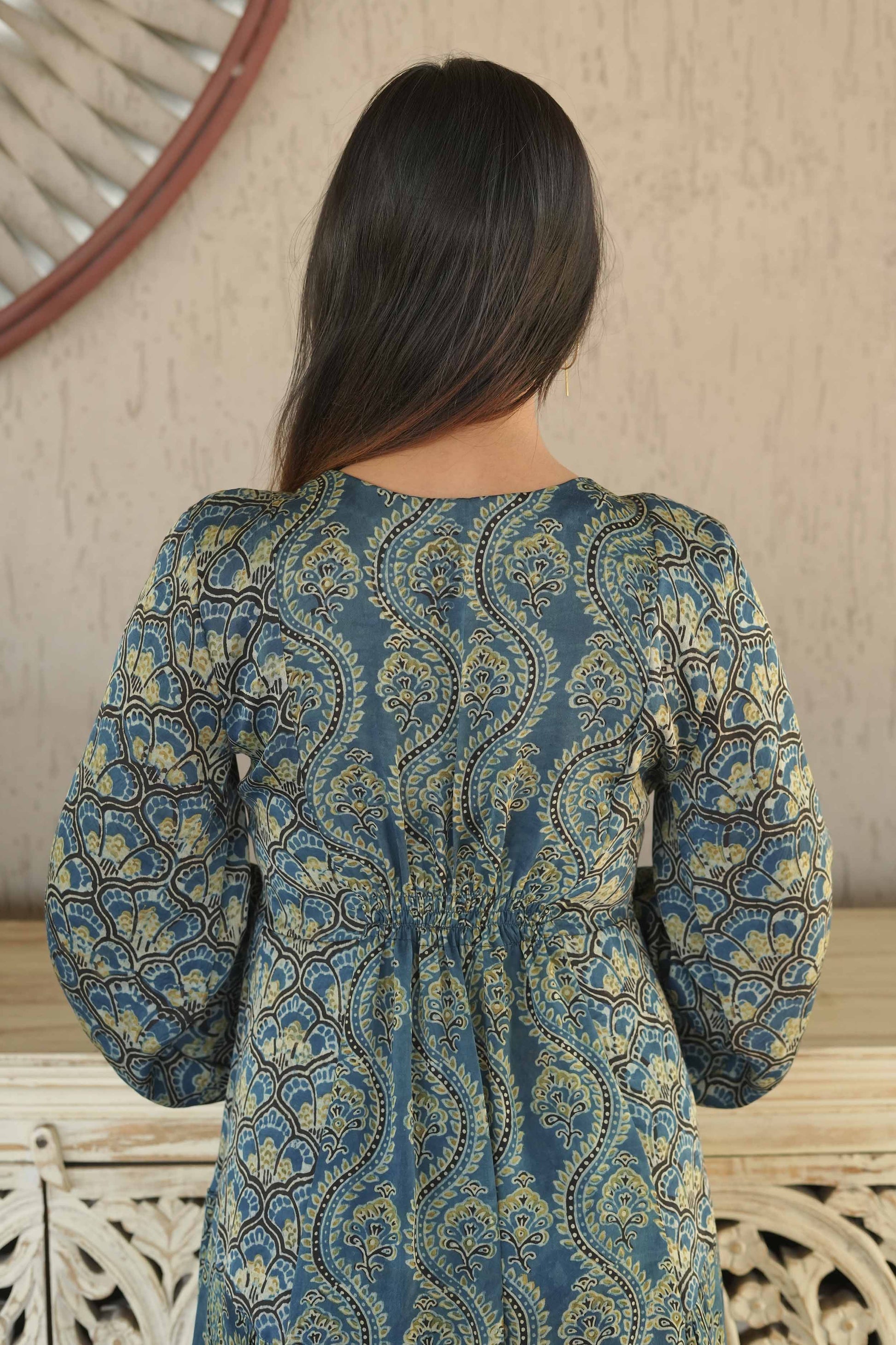 Dyed in natural tones of blue and green Ajrakh, every detail of this piece narrates the age-old tradition of hand-block printing — sustainably made by skilled artisans of Kutch.