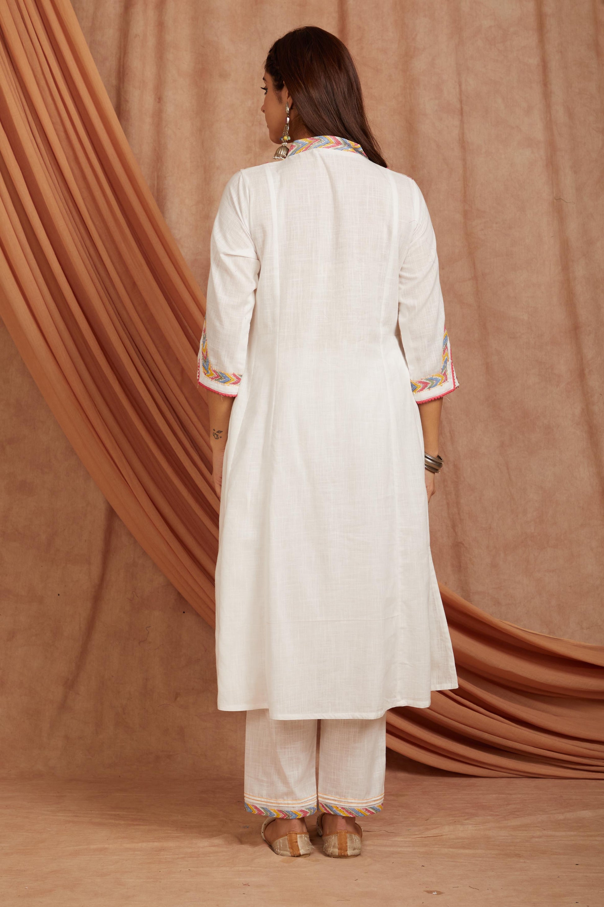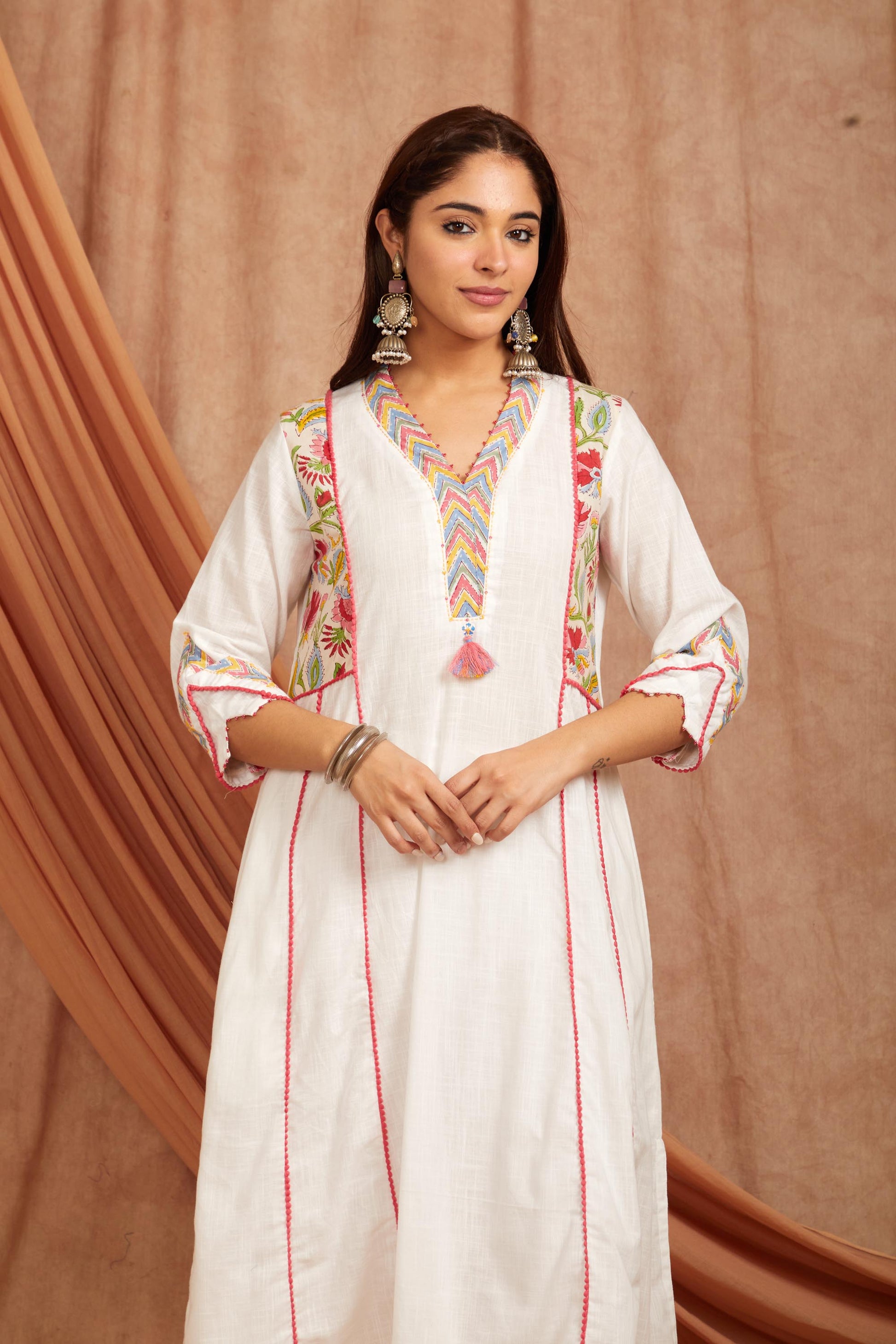 This summer elevate you style in this white cotton slub kurta which has applique of floral in front and sleeves. Pair it with cotton slub pant which has elasticated waist for comfort fit.