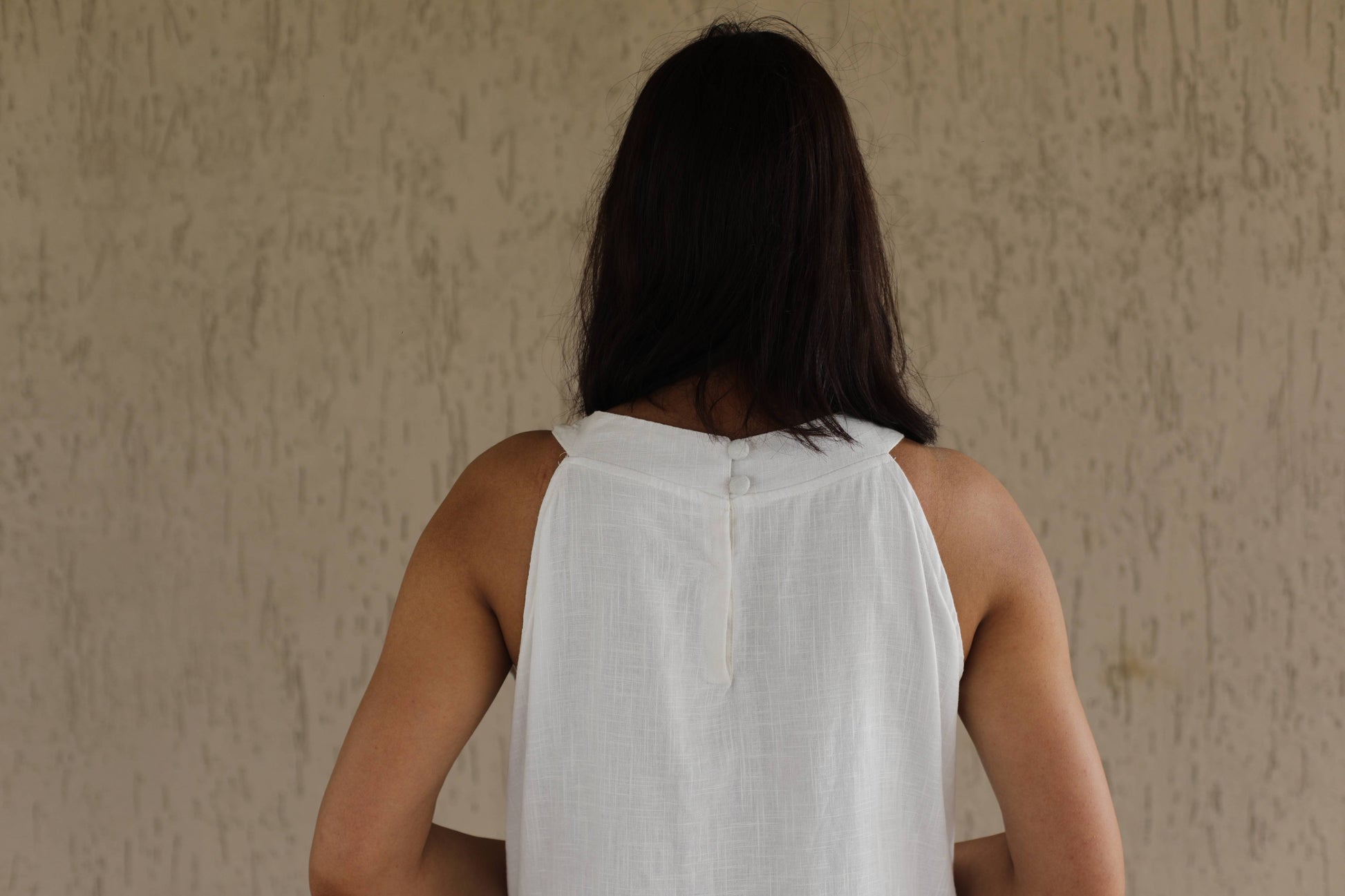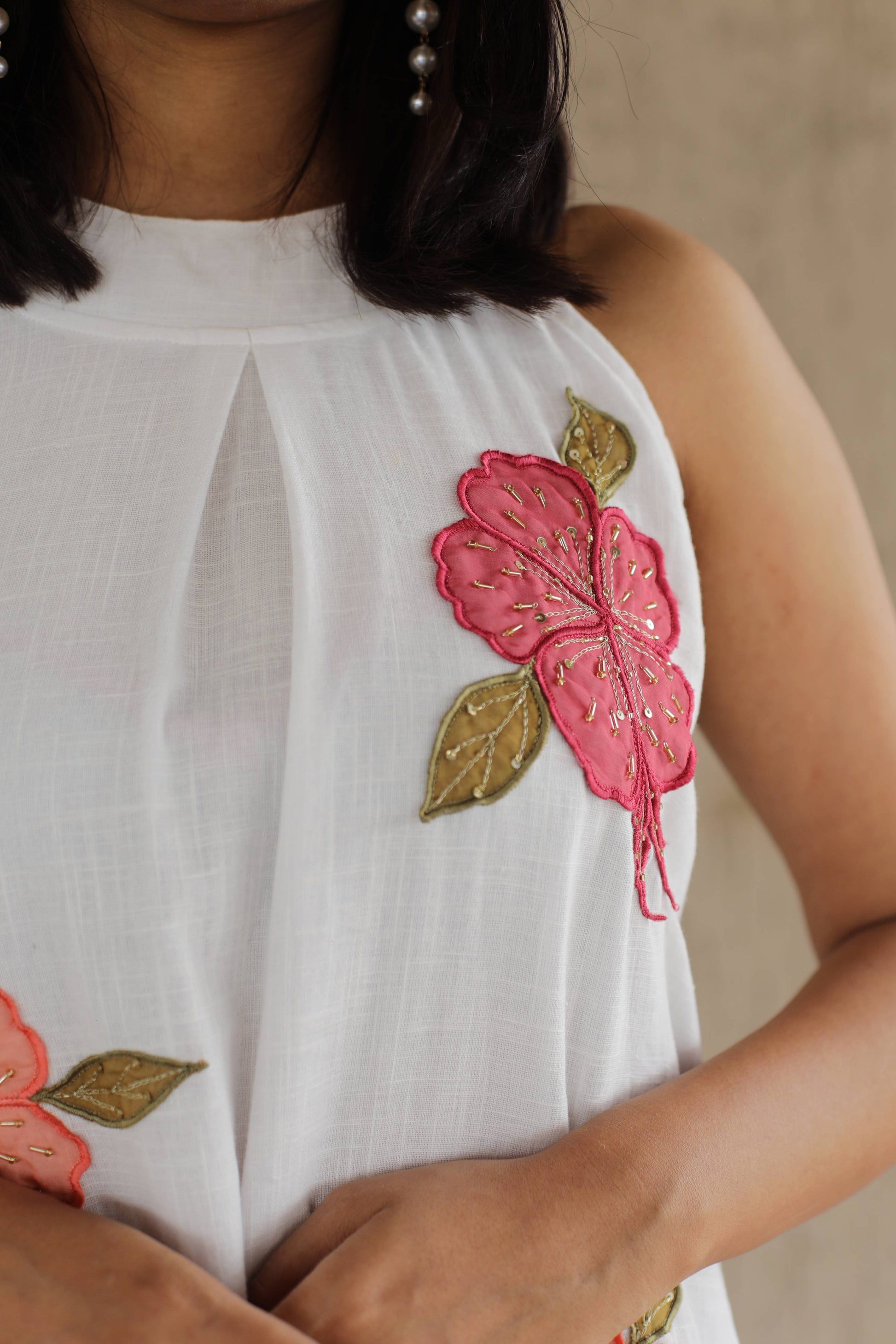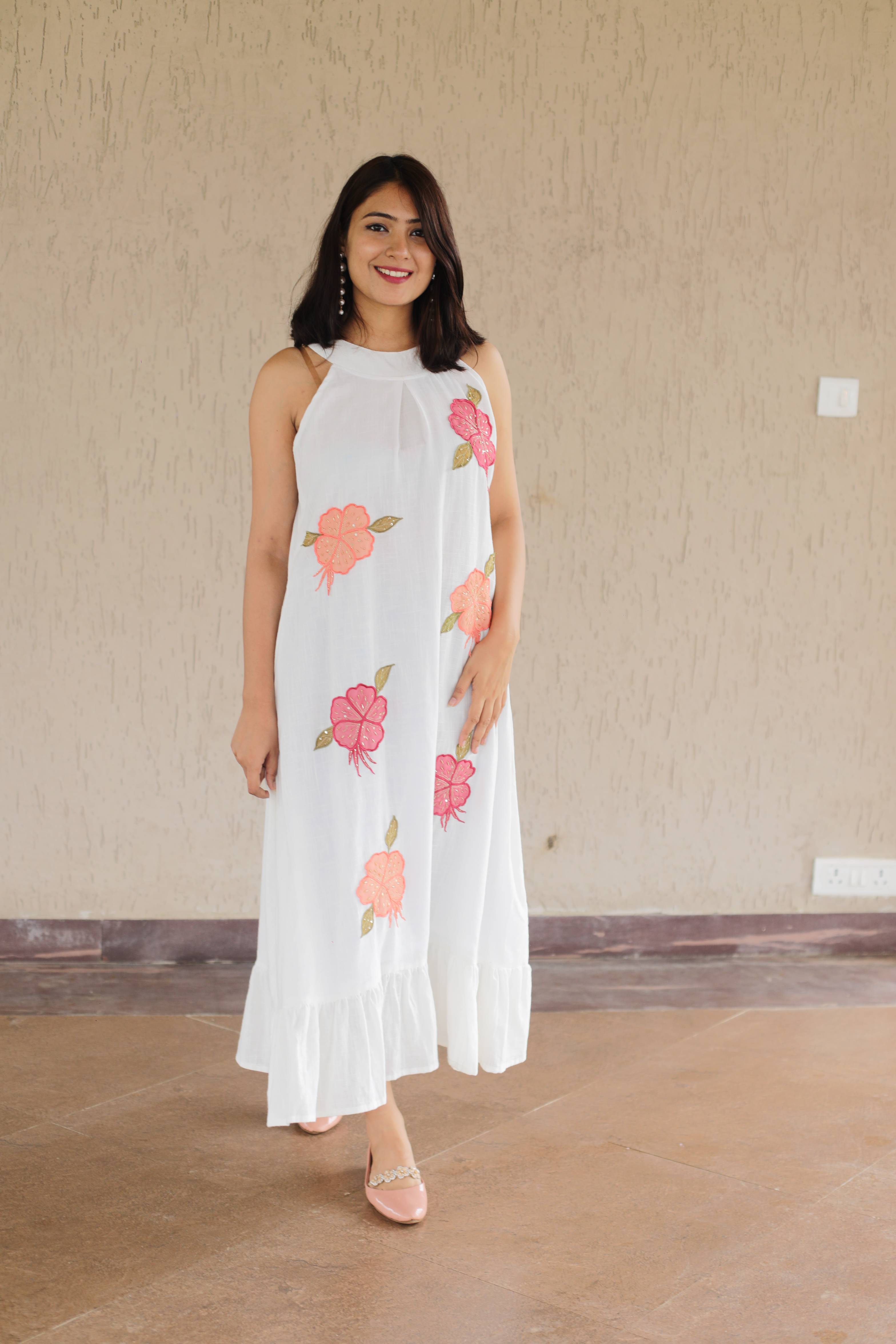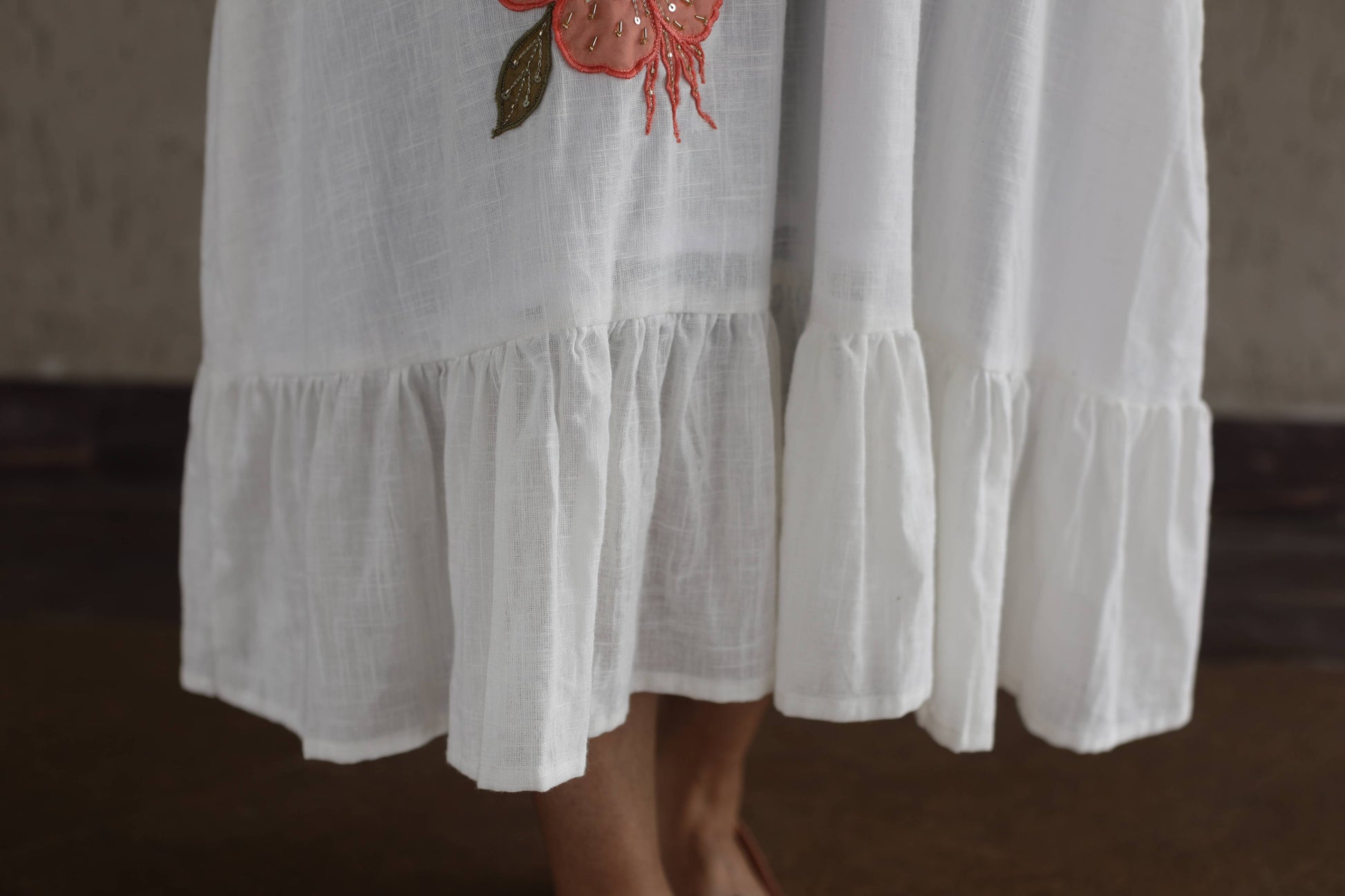 Dress yourself in this beautiful white cotton slub dress which has beautful patched flower and embellished with sequence