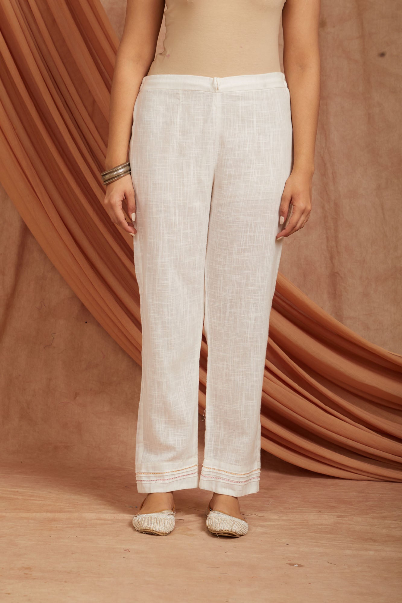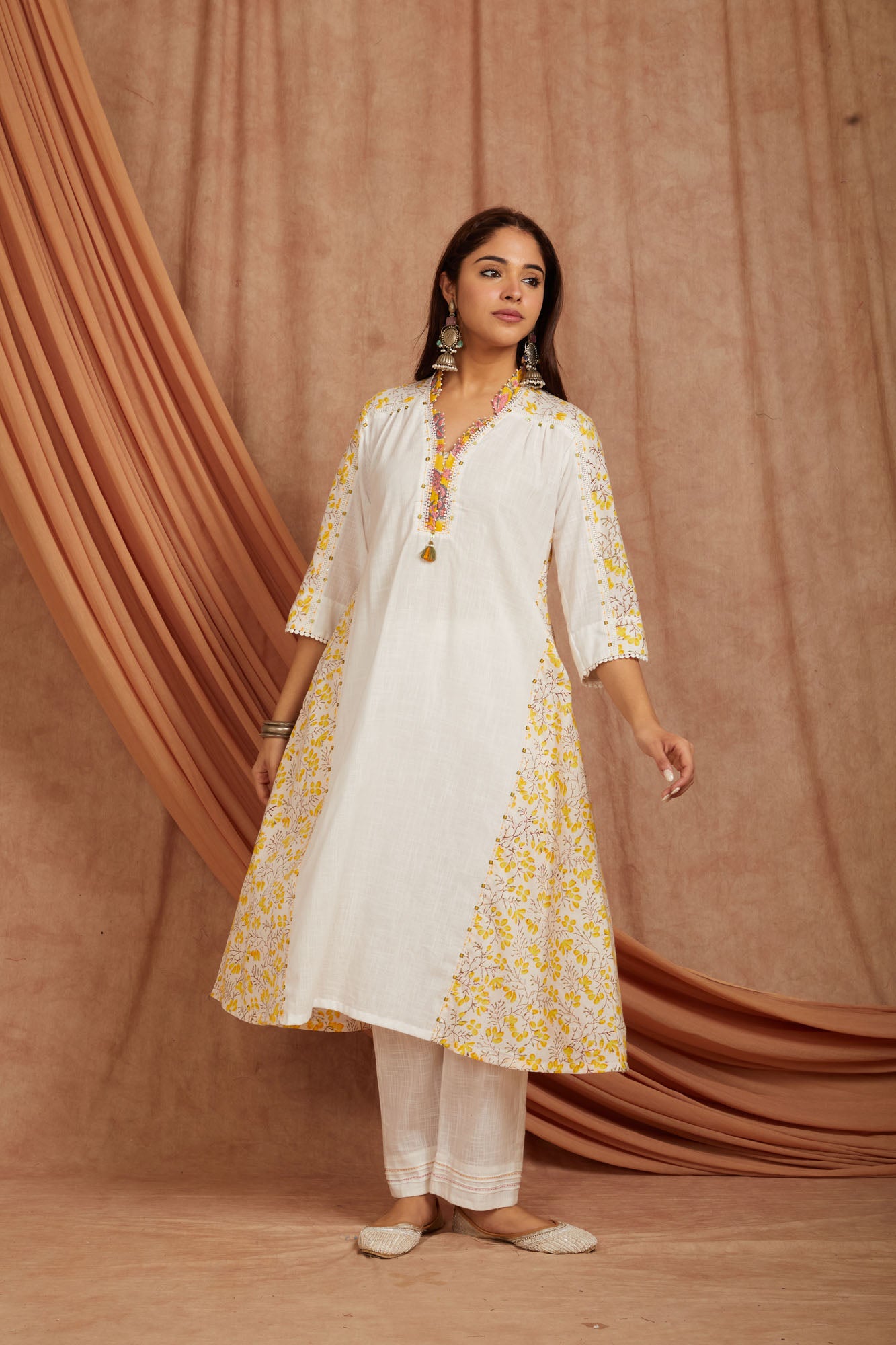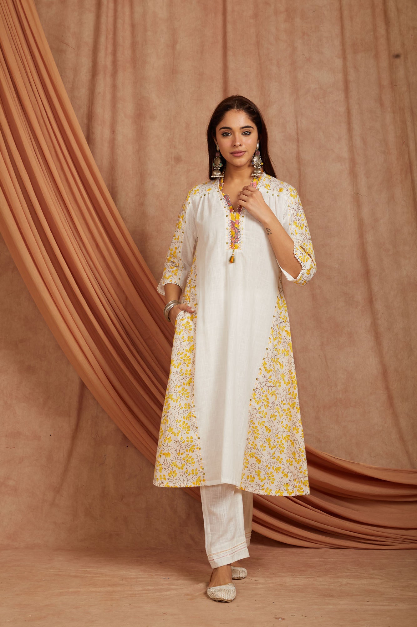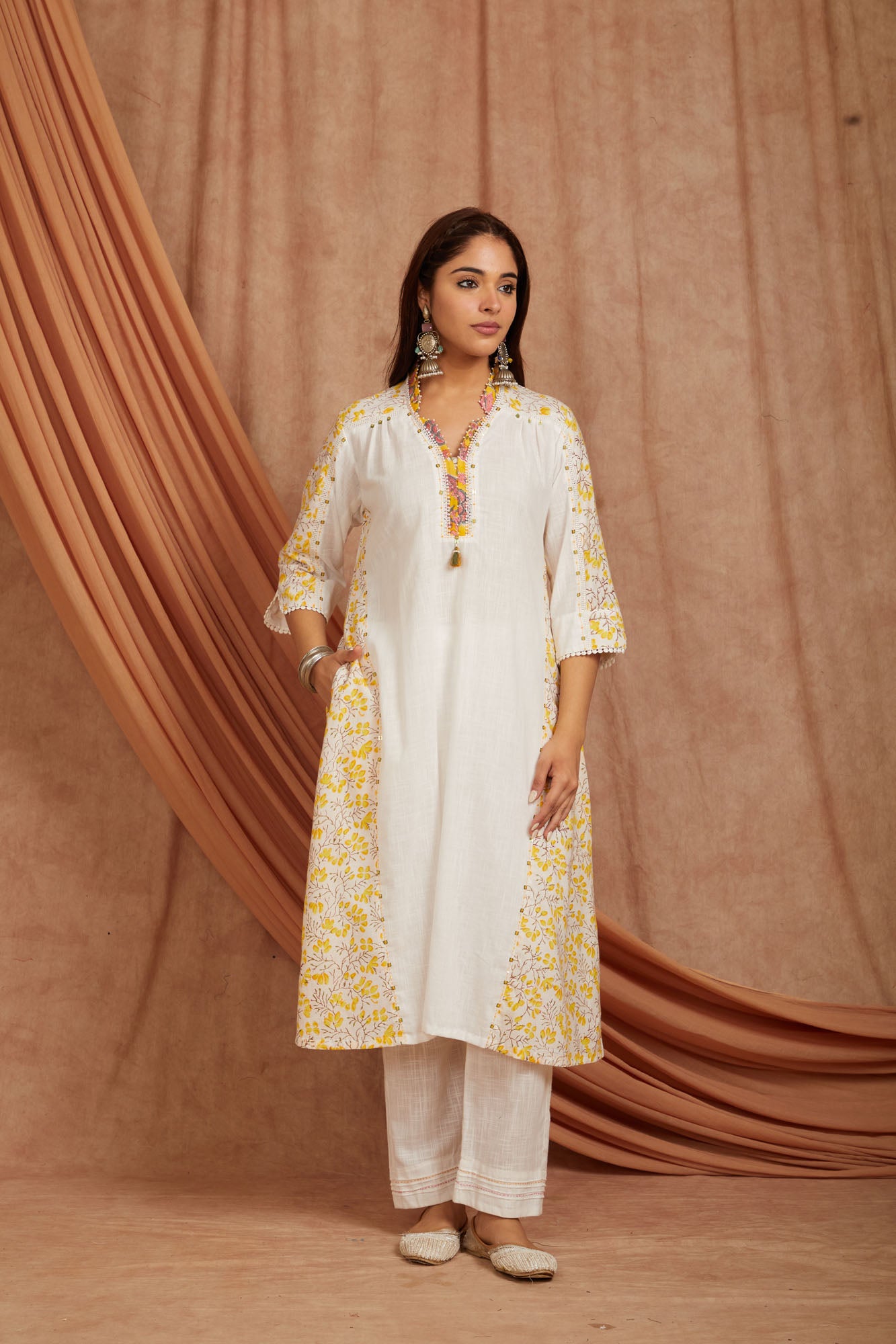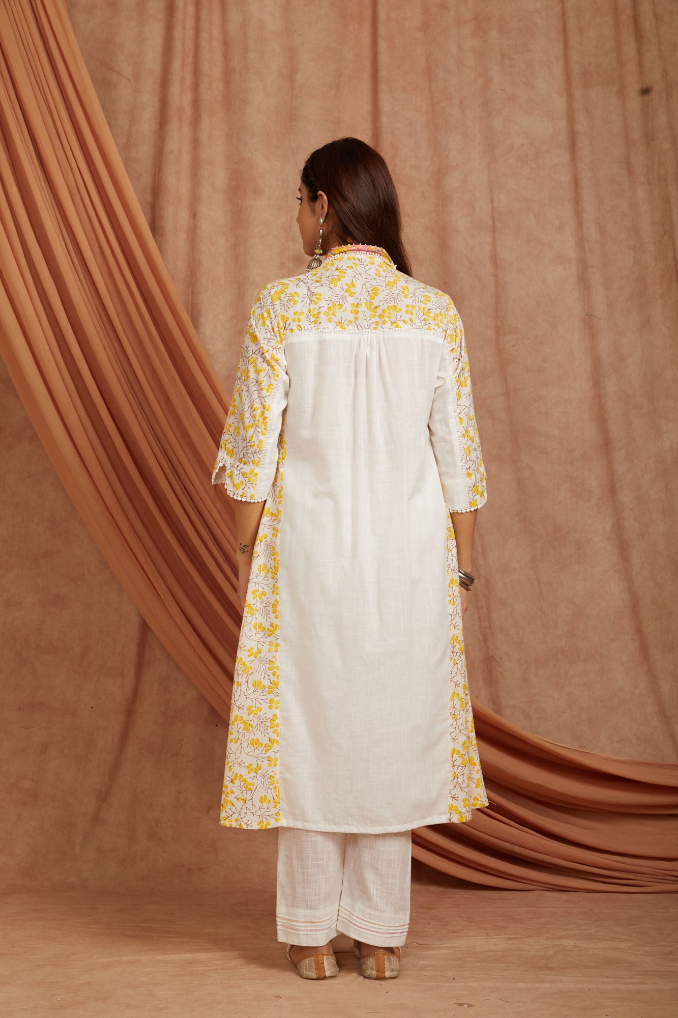 White Printed Cotton Slub Kurta Pant -Set of 2