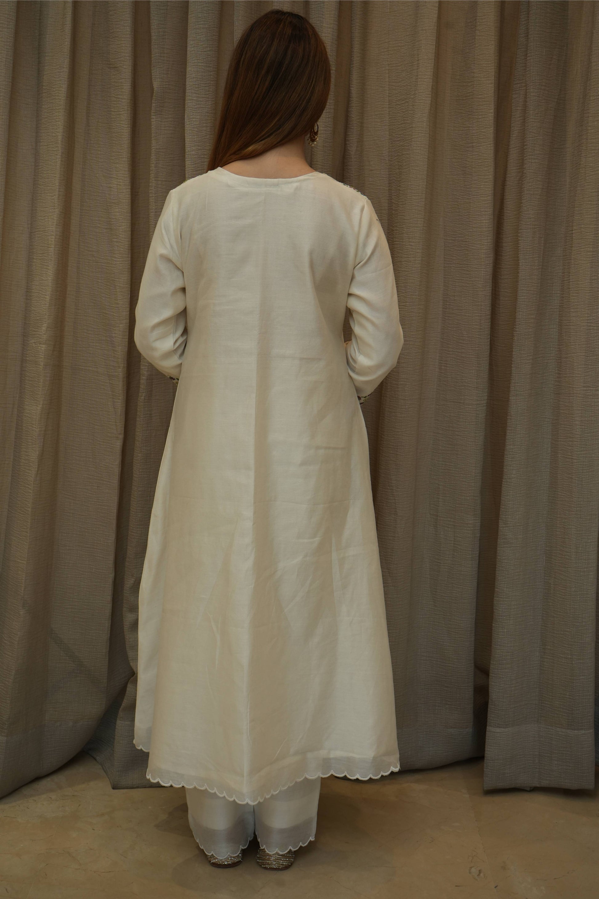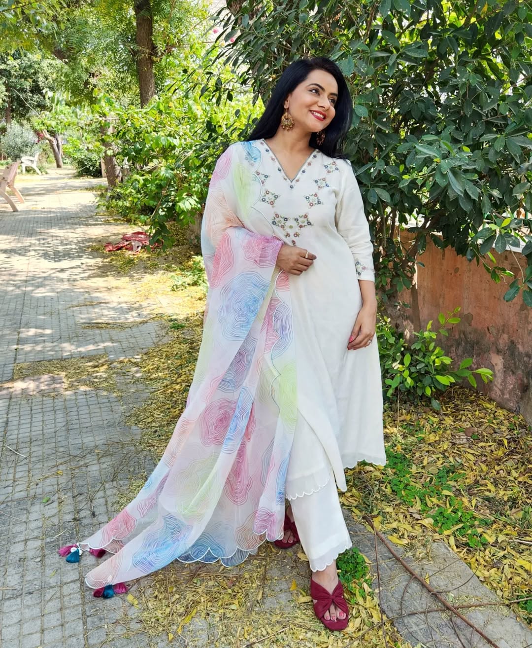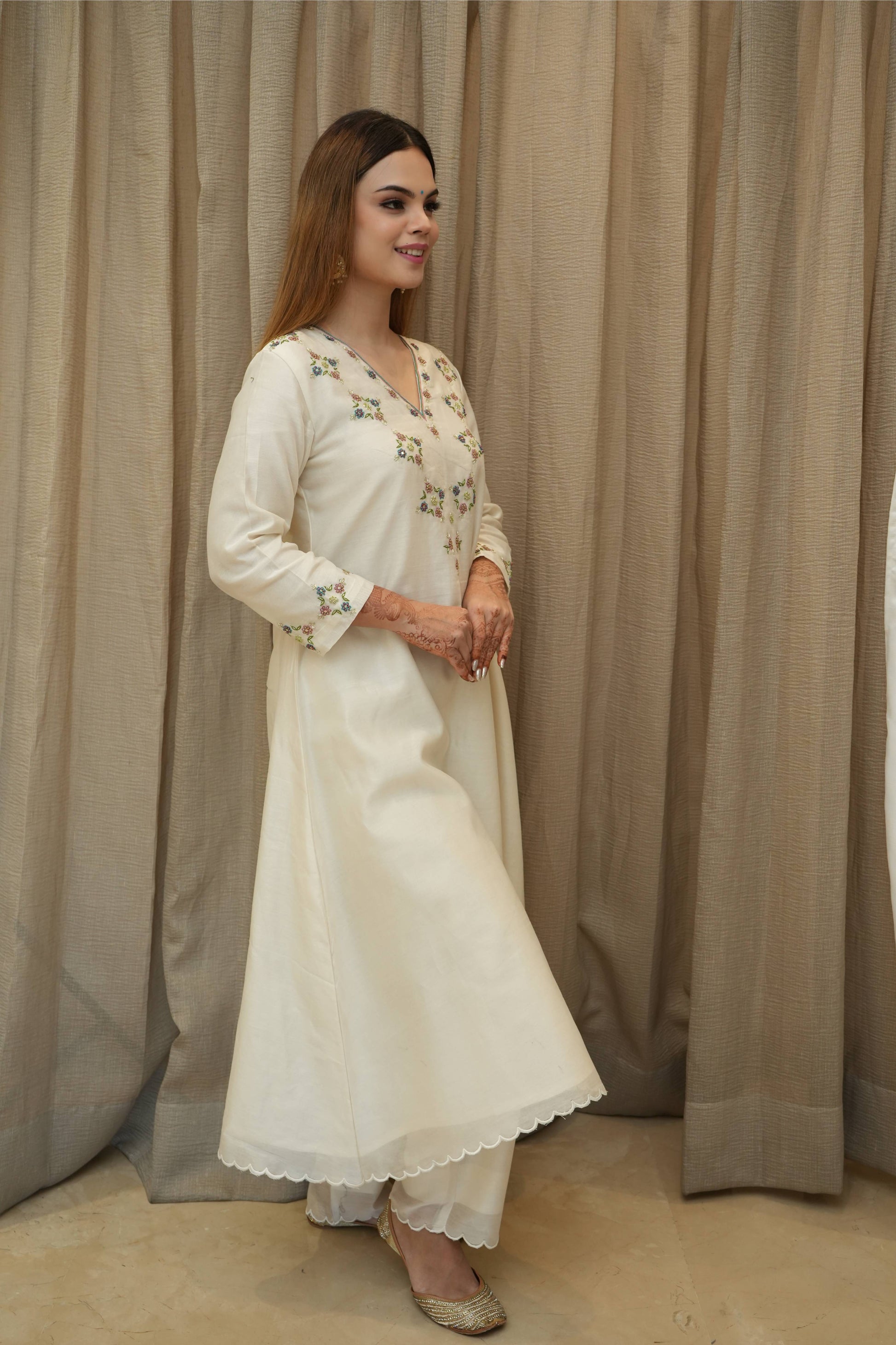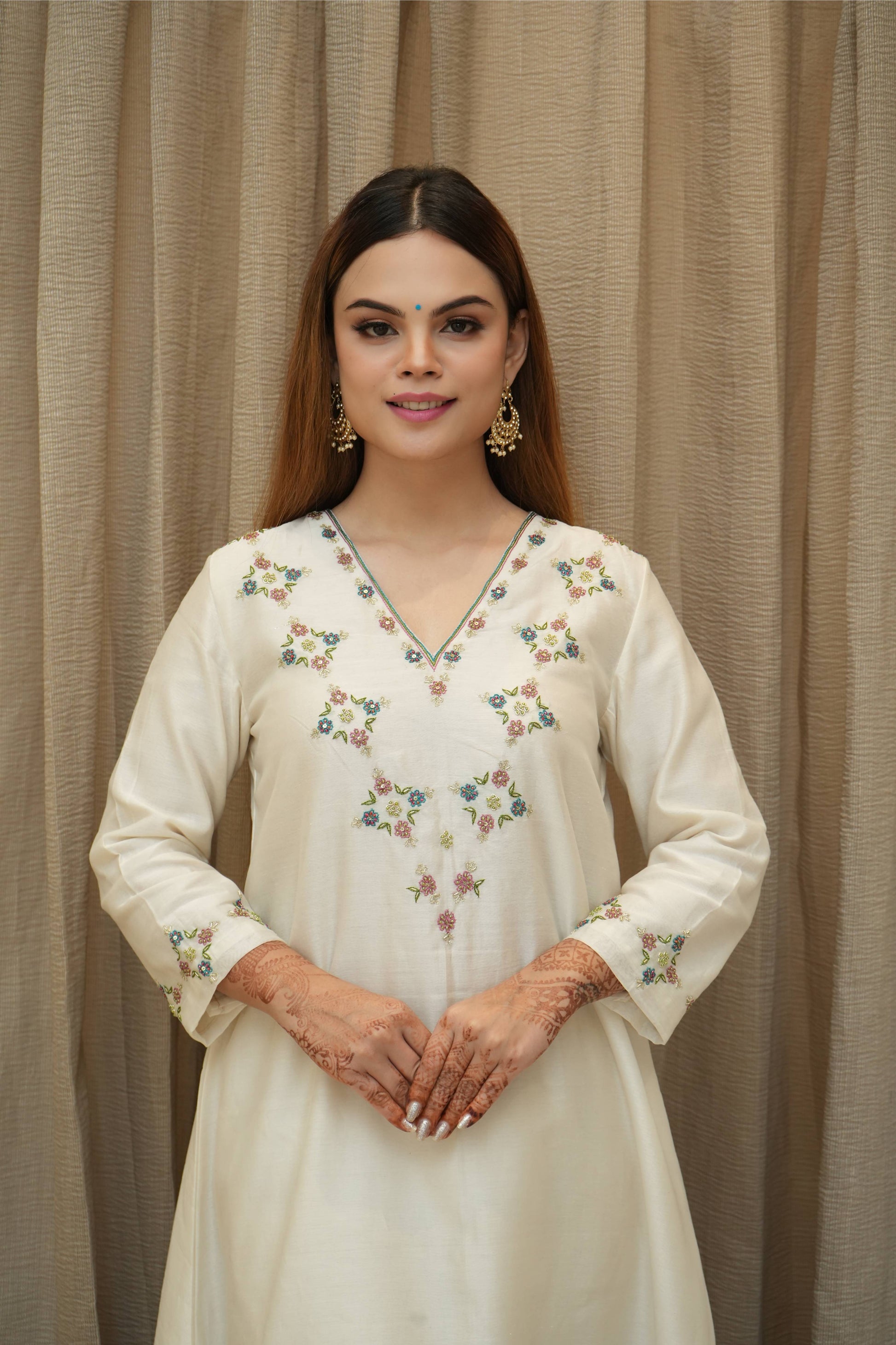 Introducing this beautiful white chanderi suit set which is silk embroidered with colorful threads and embellished with beads.It has a V neckline,3/4th sleeves
