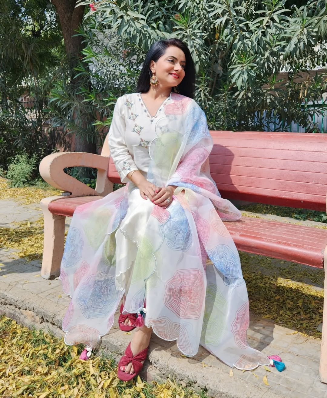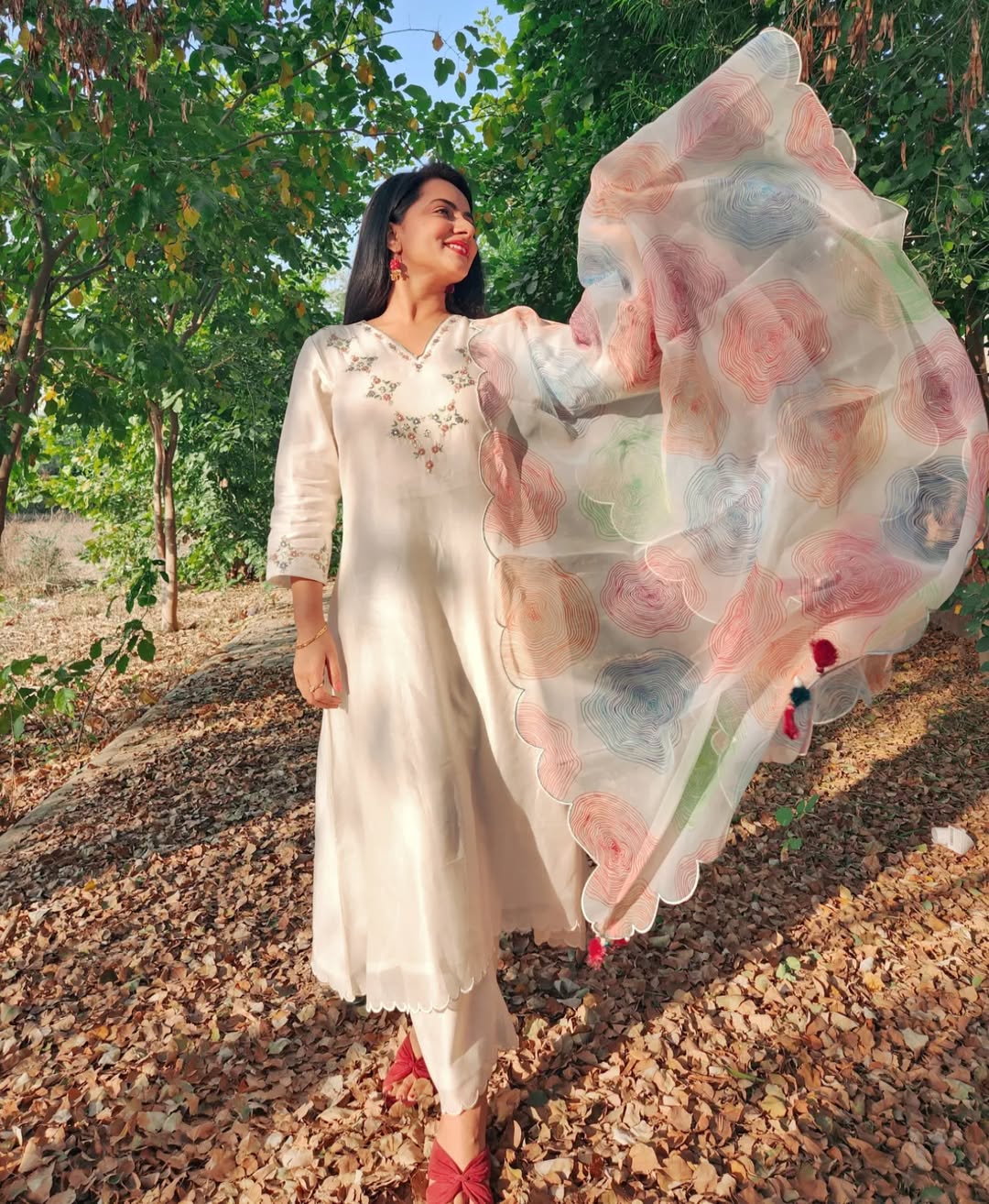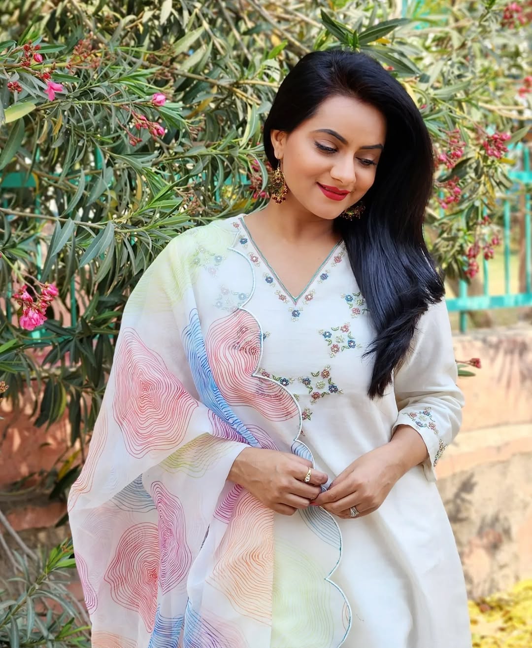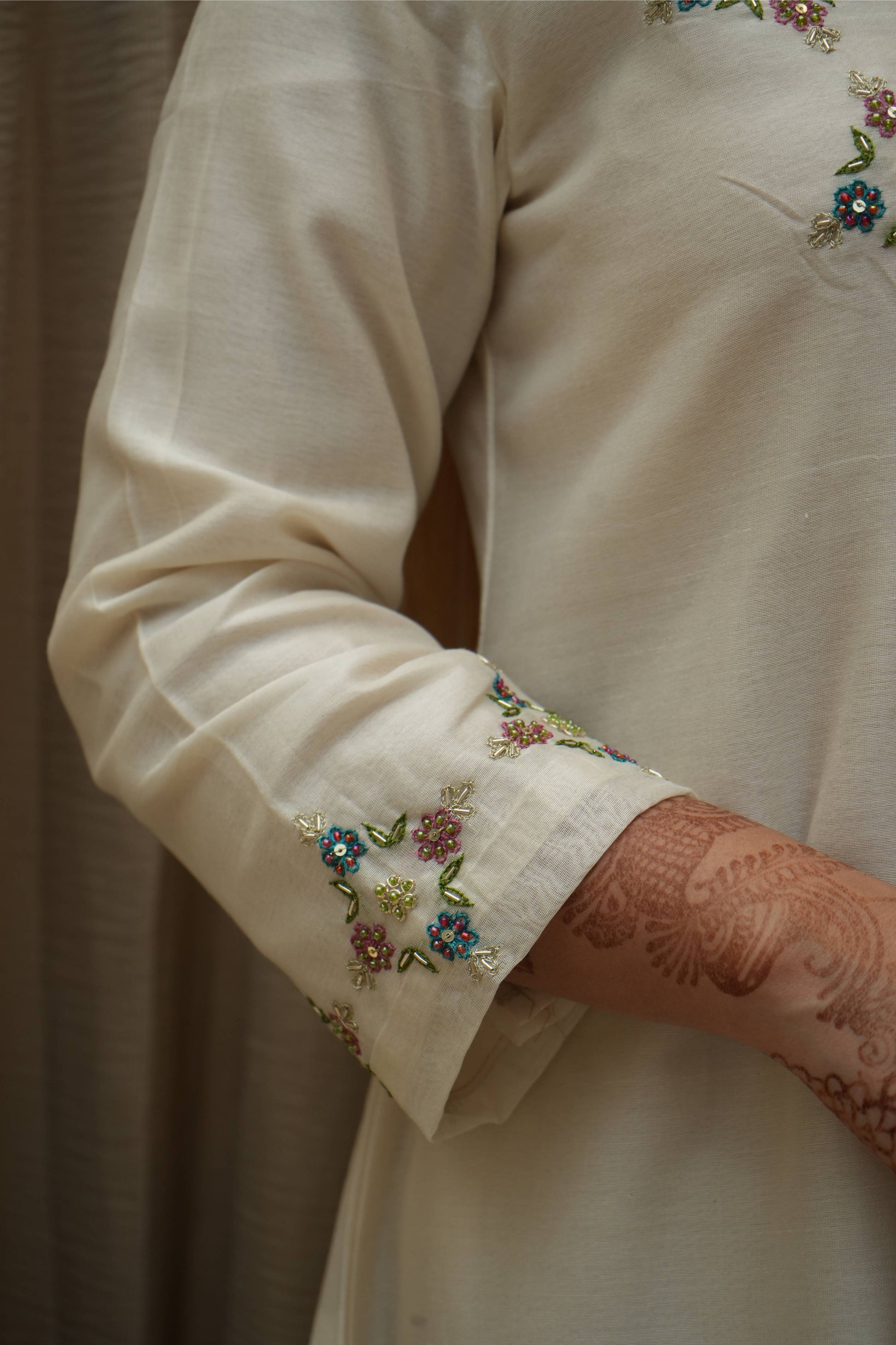 Introducing this beautiful white chanderi suit set which is silk embroidered with colorful threads and embellished with beads.It has a V neckline,3/4th sleeves