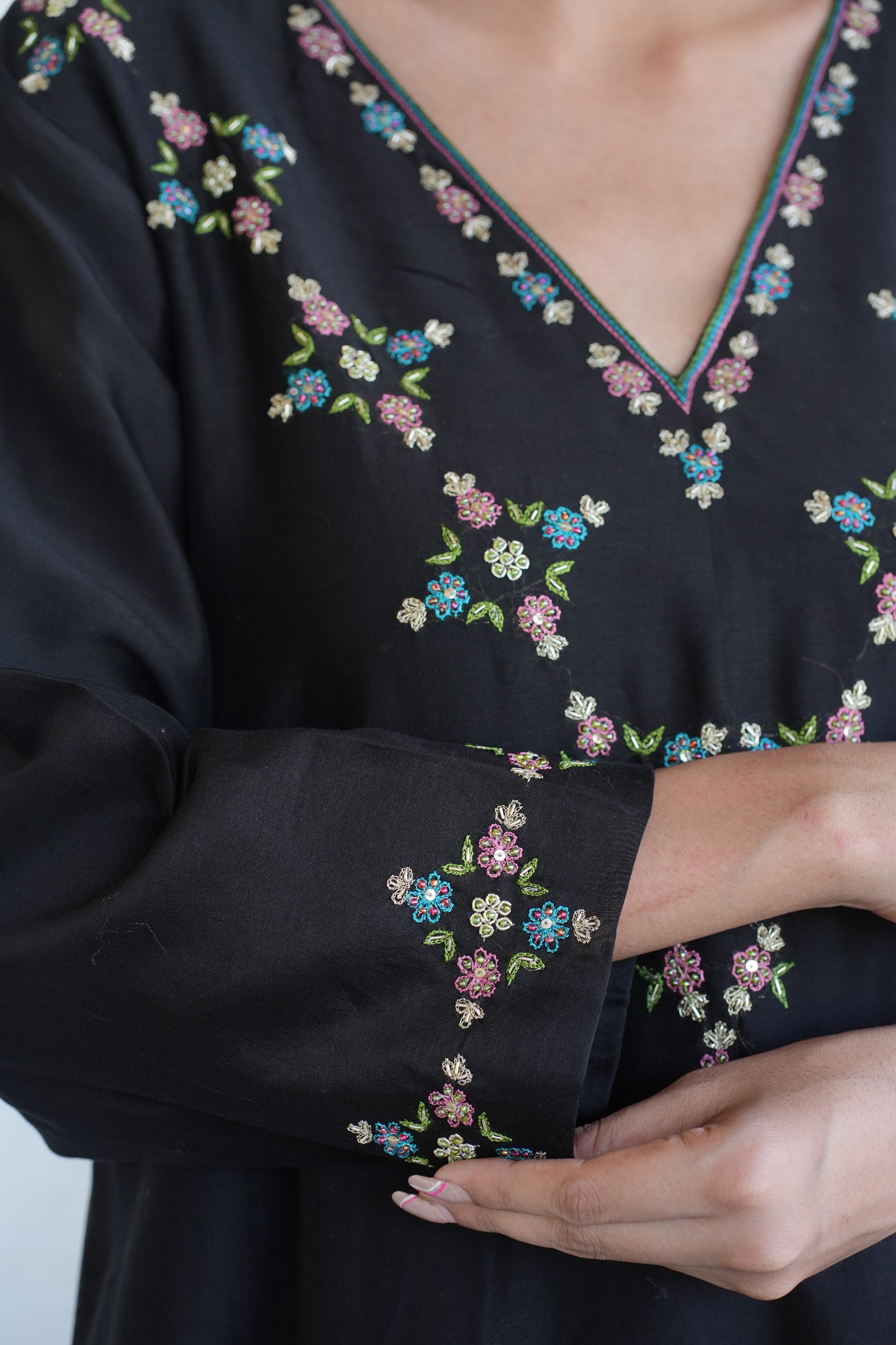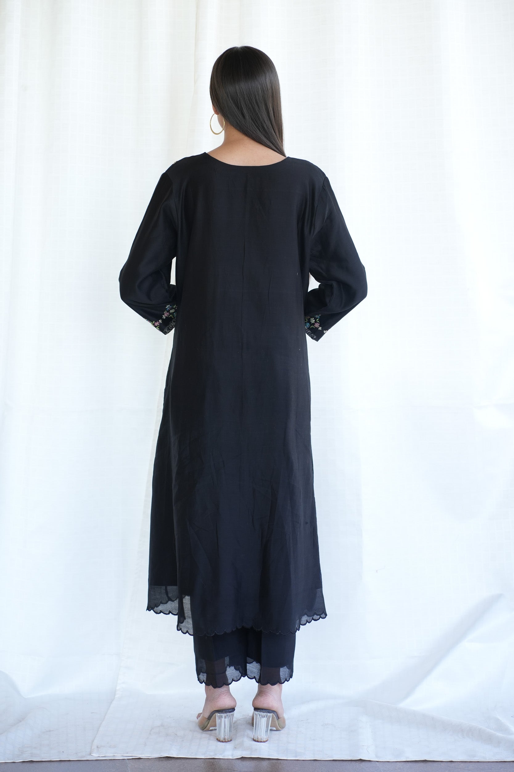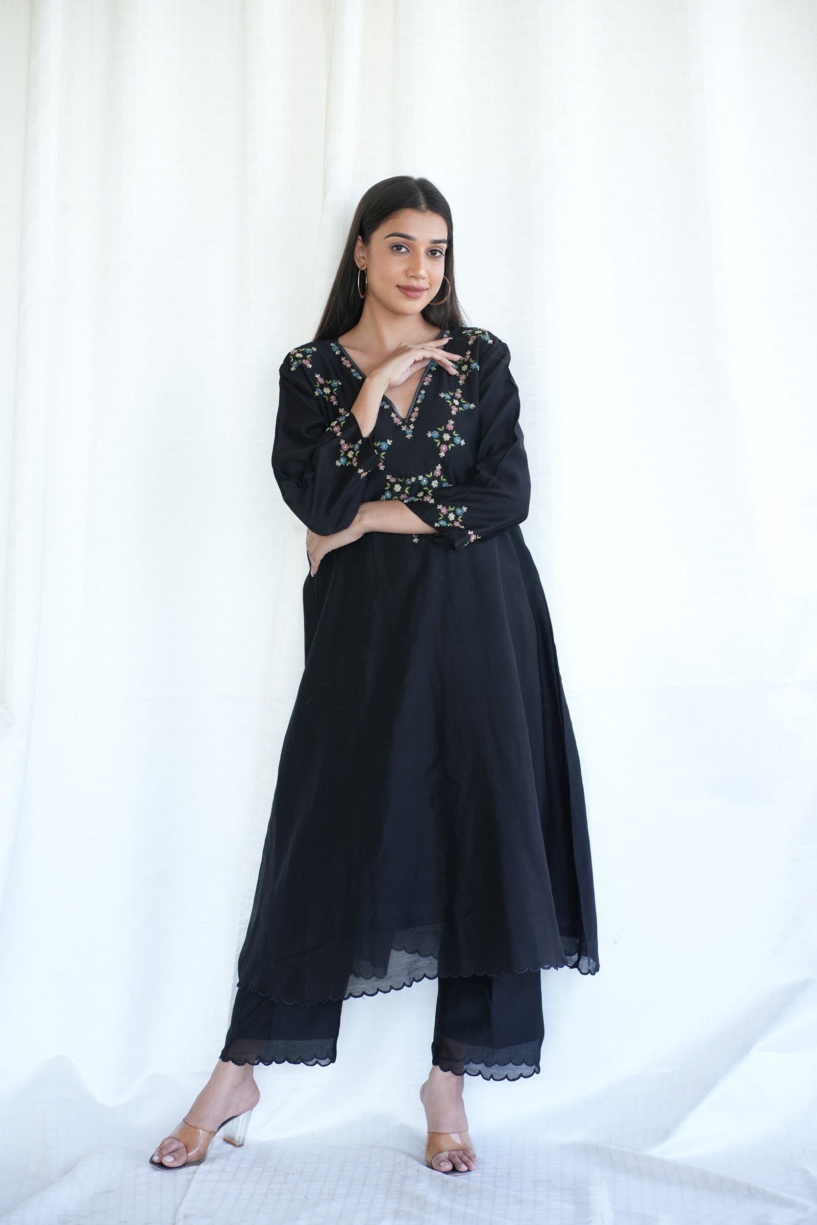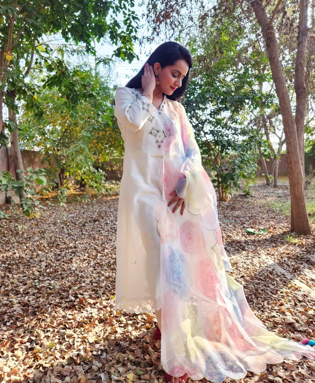 Introducing this beautiful white chanderi suit set which is silk embroidered with colorful threads and embellished with beads.It has a V neckline,3/4th sleeves