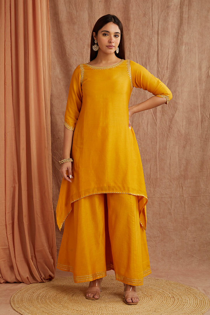 This Pink Chanderi Silk Suit set features exquisite silver and gold zari embroidery enhanced with delicate white beads and sequins, creating a refined and elegant look. It includes a beautifully crafted gota lace dupatta and matching palazzo pants adorned with gota lace, offering a harmonious blend of traditional craftsmanship and contemporary style. Perfect for festive occasions, this ensemble combines comfort with sophisticated detailing.