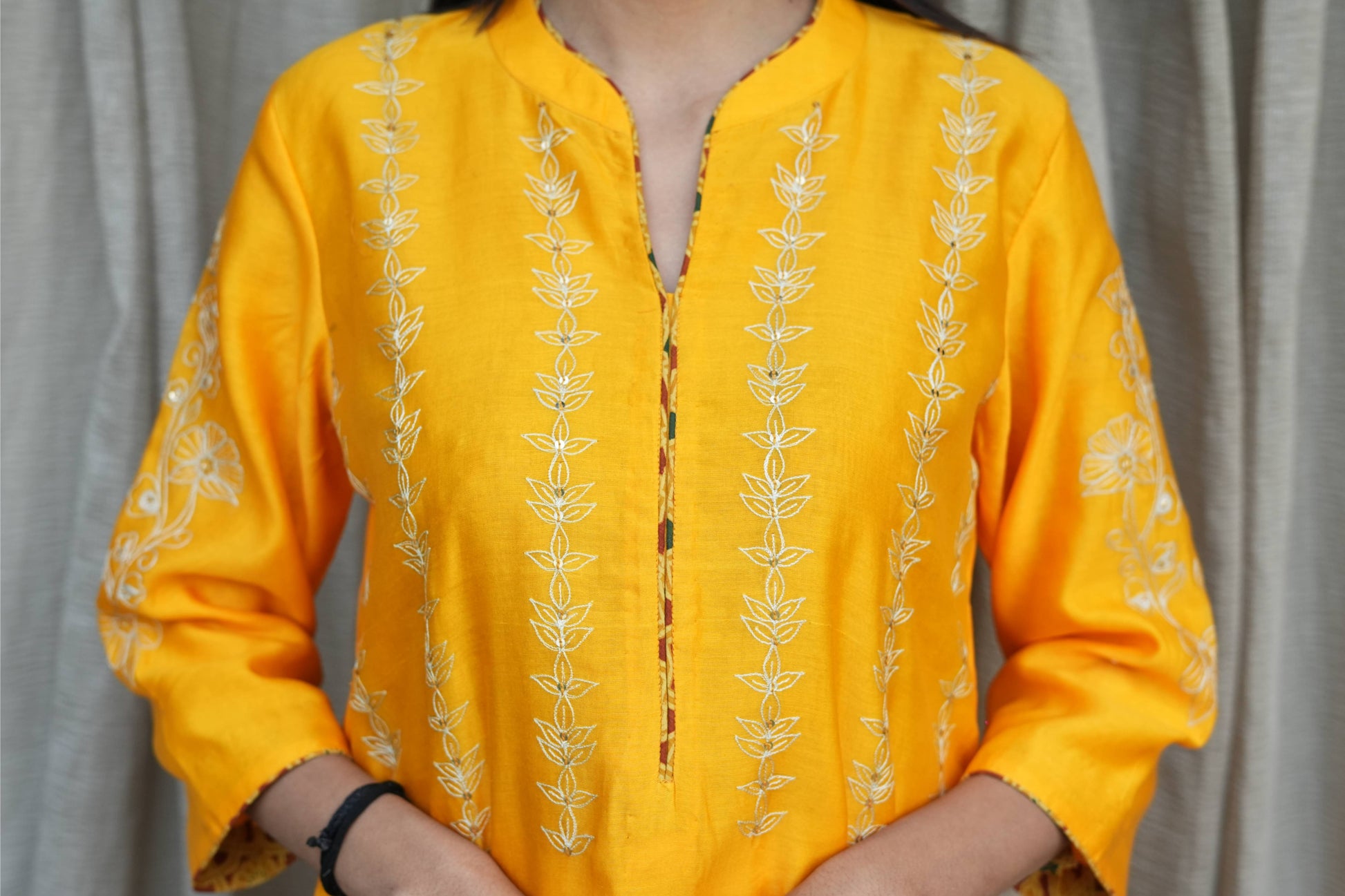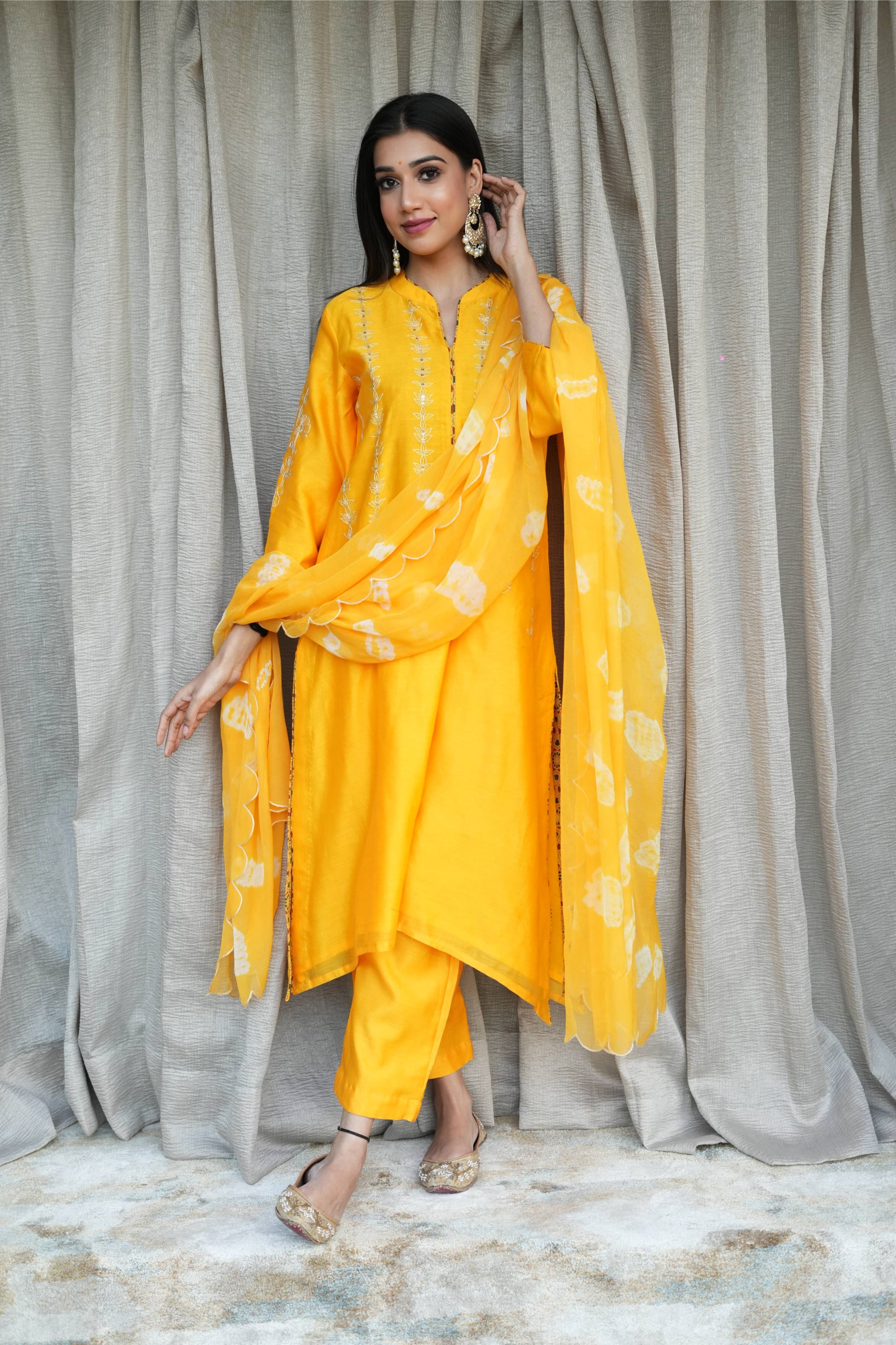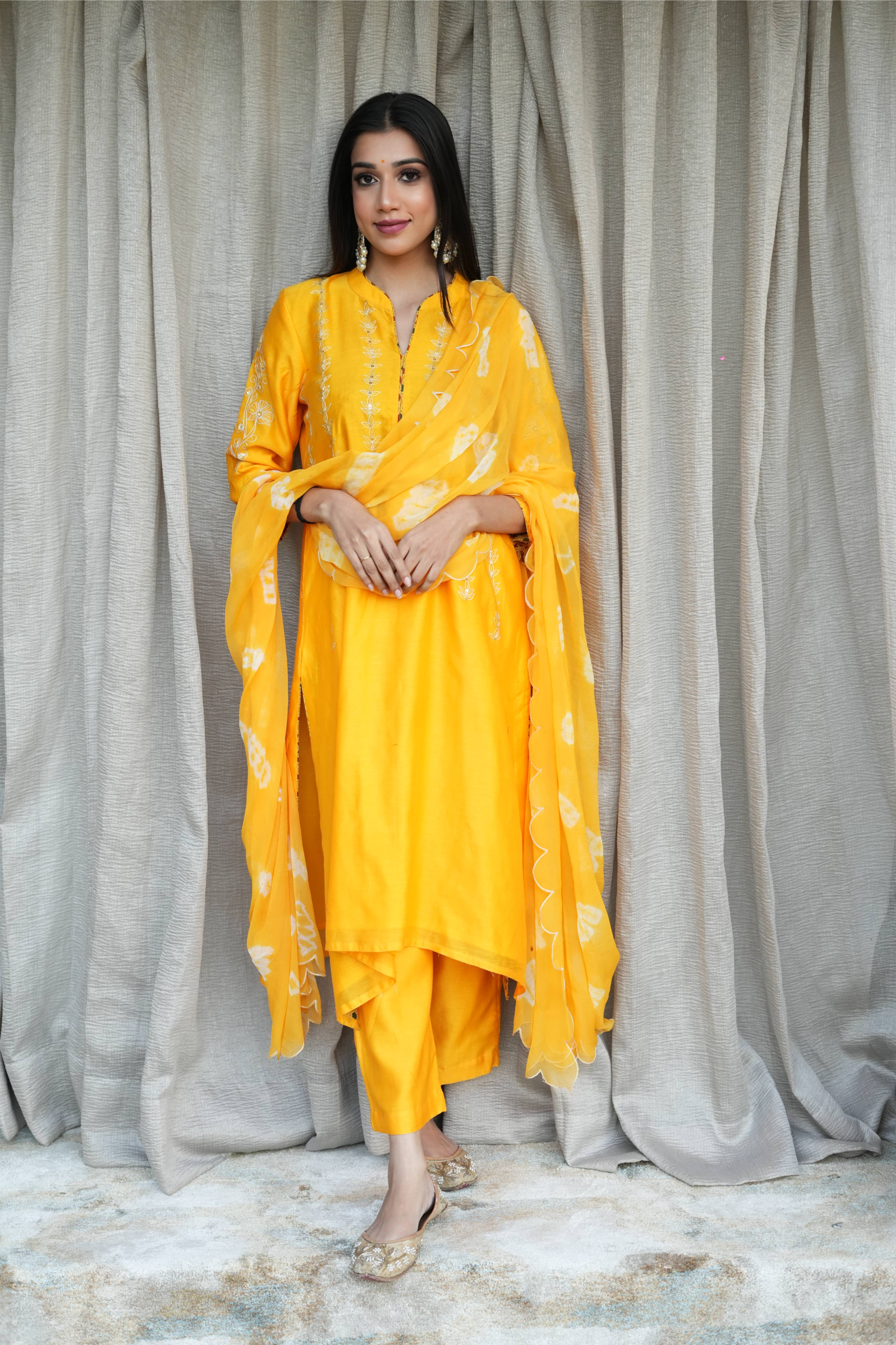 2.It is chanderi silk set machine embroidered set which has sequence work.
